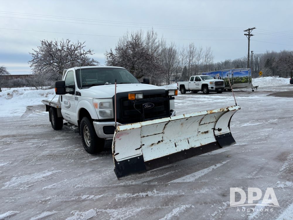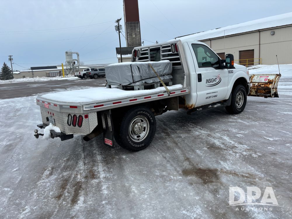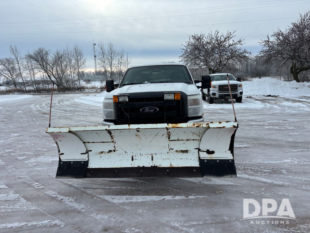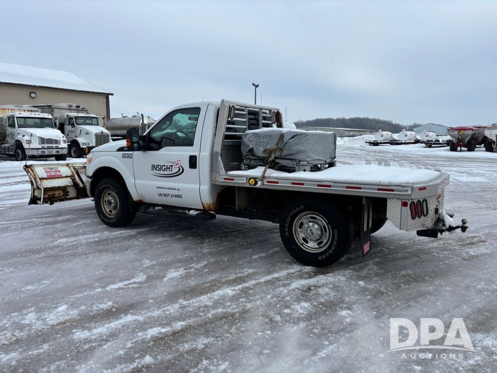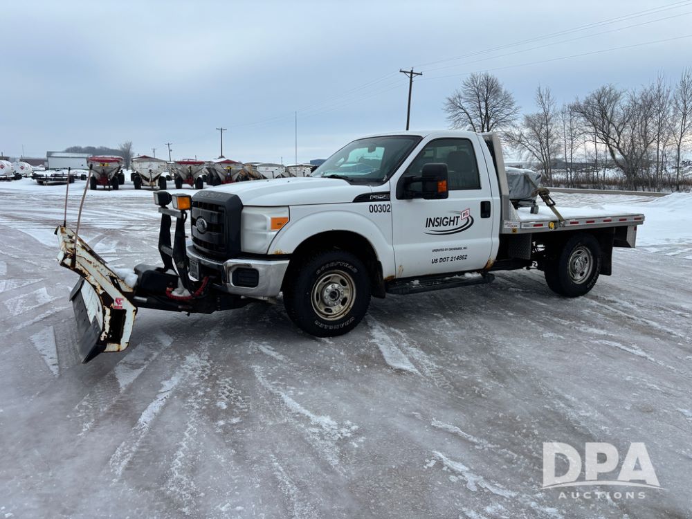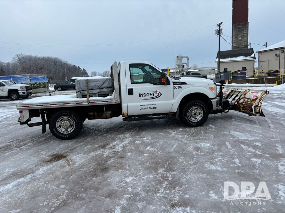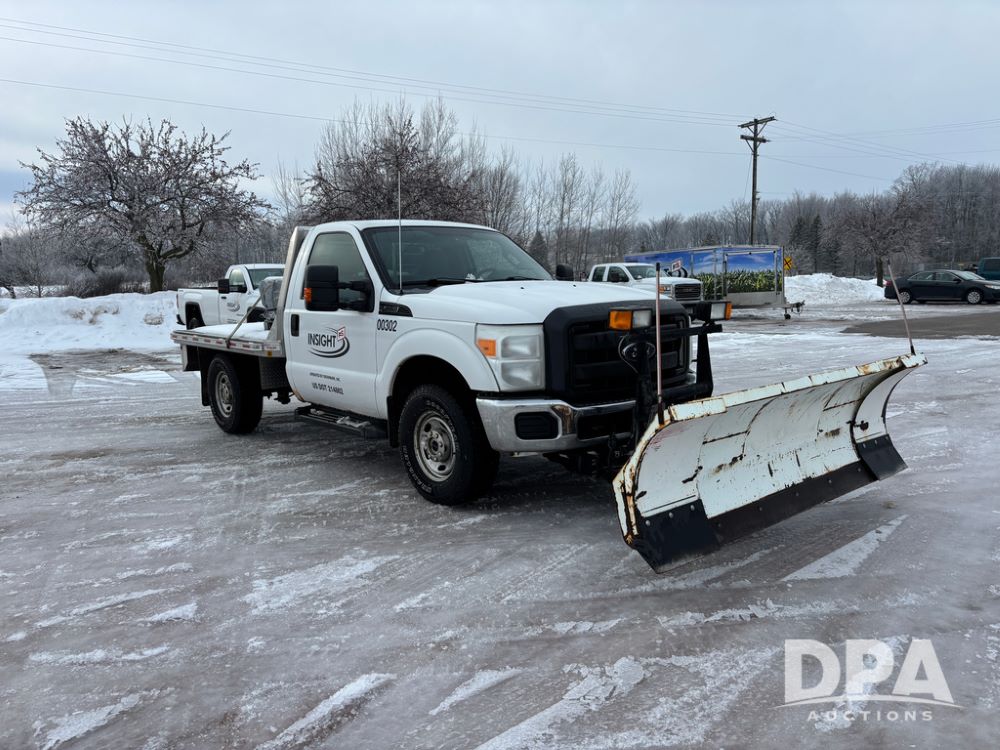2012 Ford F250 Pickup (DR12934 Unit 0302), gas engine, automatic transmission, 4X4, Zimmerman 8' aluminum flatbed w/headache rack, Power Hitch front mounted snow plow w/cab controls, AM/FM CD radio, cruise control, rear receiver hitch, 285/70R17 tires, odometer reads 205,854 miles.