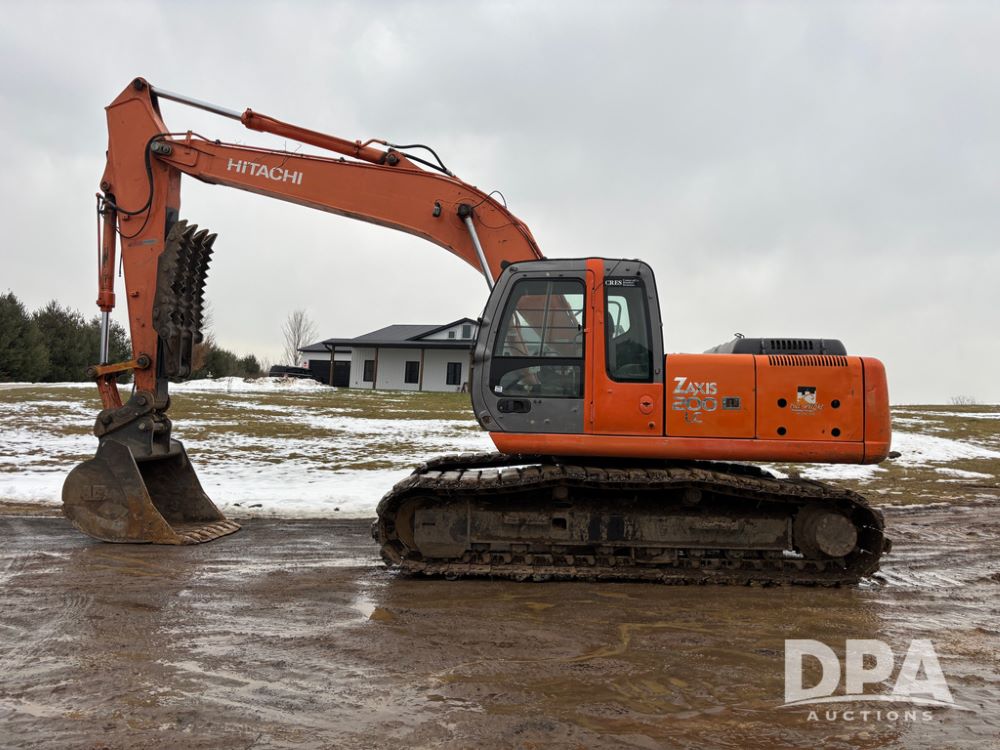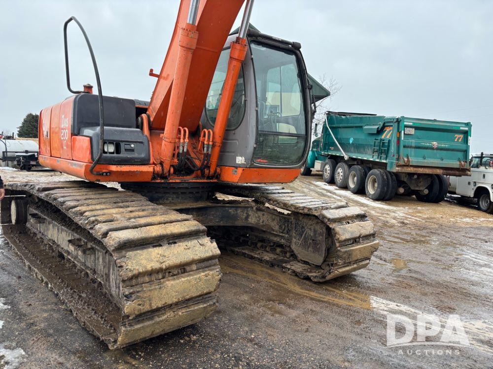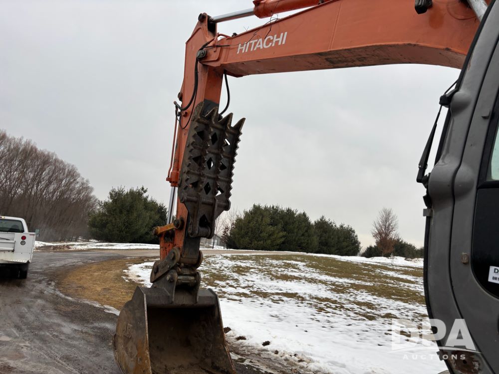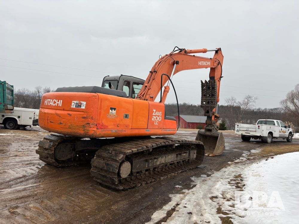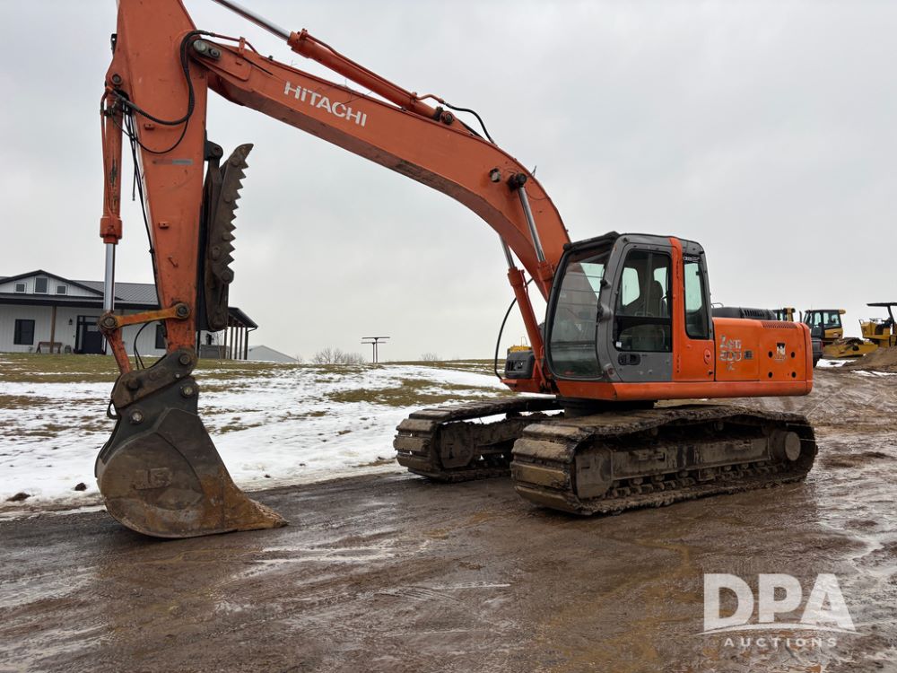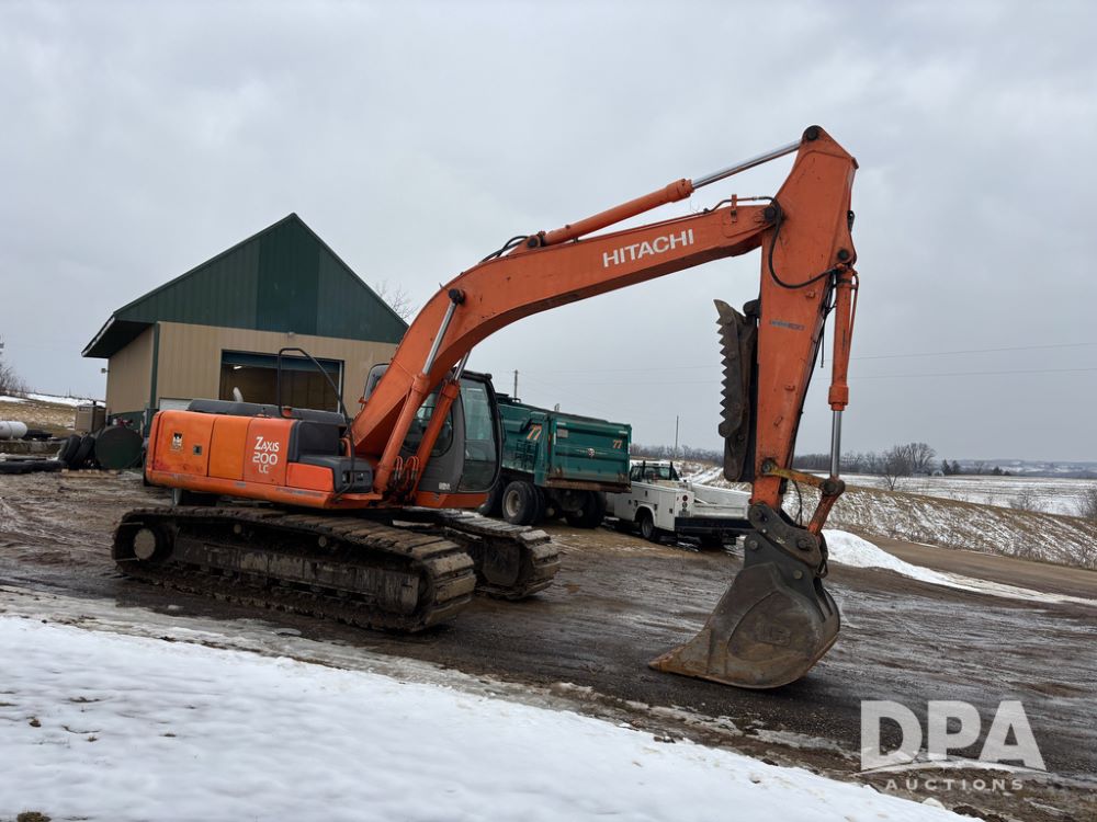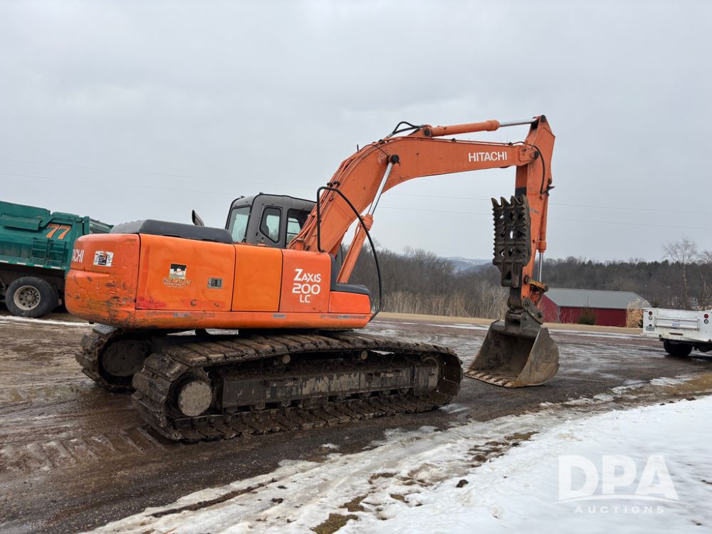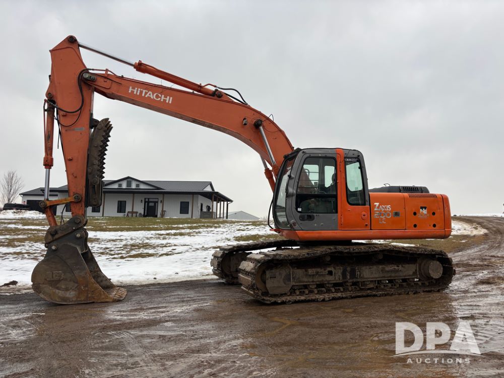 Hitchi 200 Excavator (DR12939), Isuzu diesel engine, hydrostatic drive, manual thumb, good under carriage, 32'' rubber pads, 2024 48'' tooth bucket, JRB hydraulic quick tach, enclosed cab w/heat and air conditioning, shows 10,018 hours.
