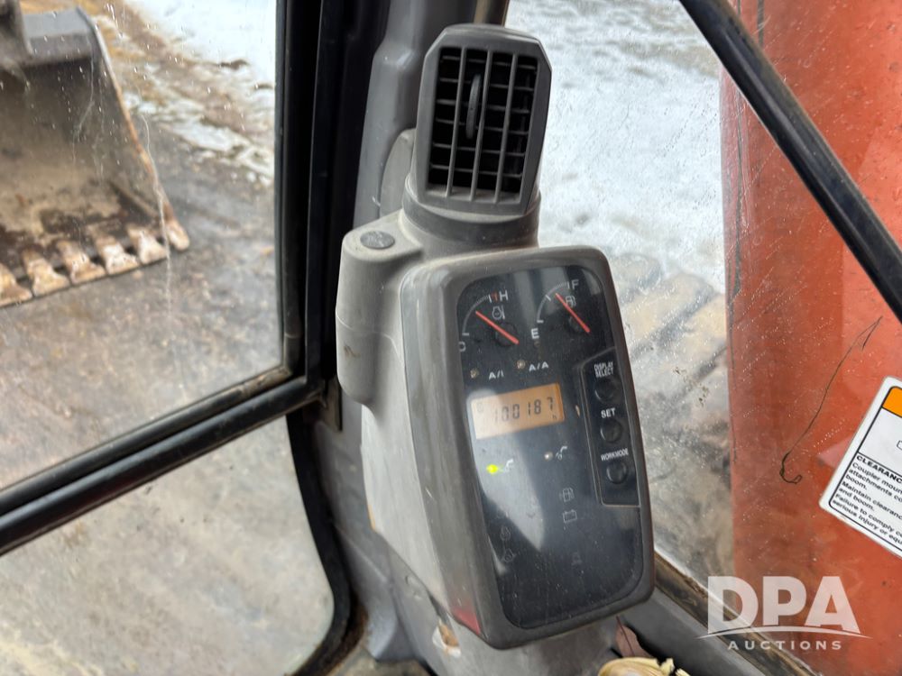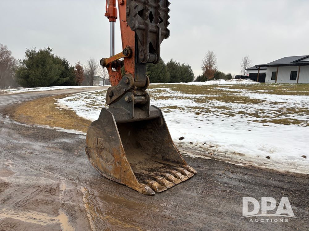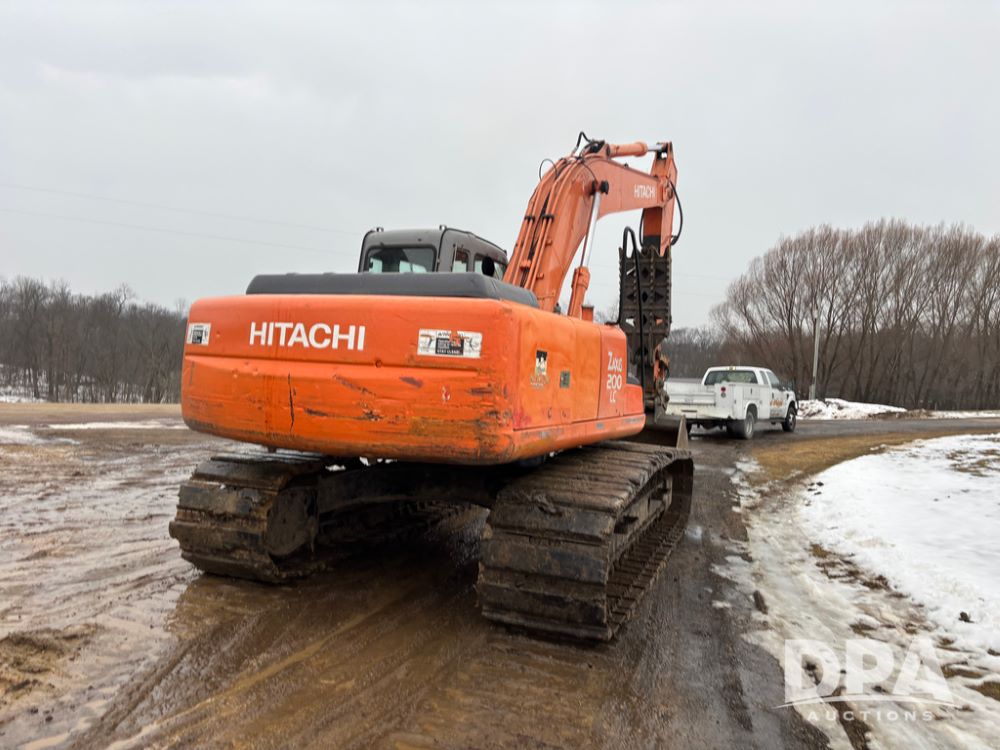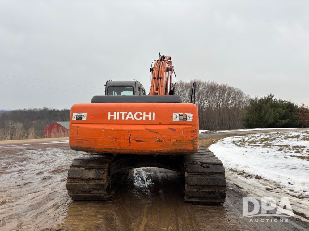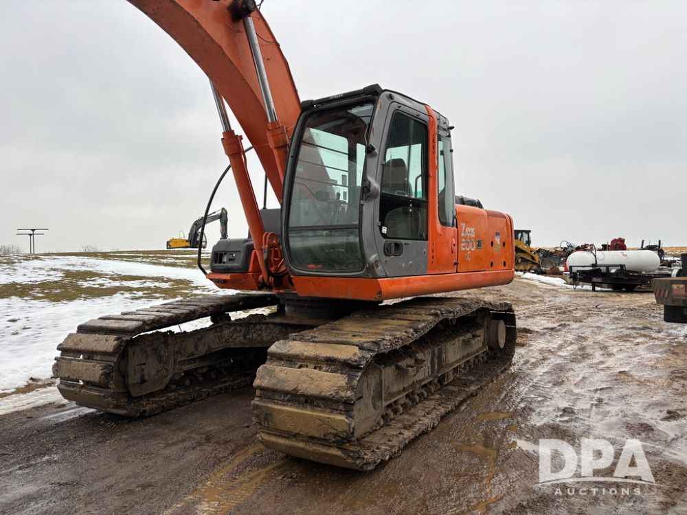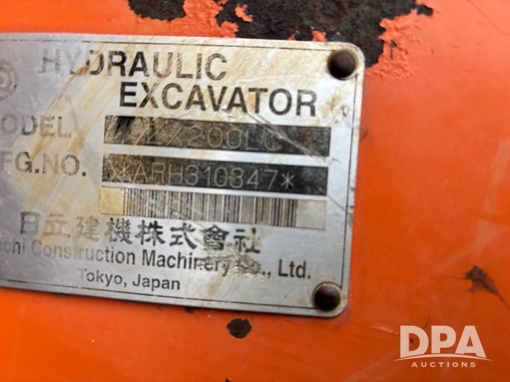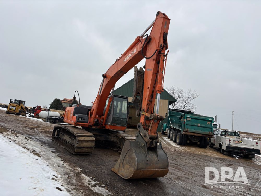 Hitchi 200 Excavator (DR12939), Isuzu diesel engine, hydrostatic drive, manual thumb, good under carriage, 32'' rubber pads, 2024 48'' tooth bucket, JRB hydraulic quick tach, enclosed cab w/heat and air conditioning, shows 10,018 hours.