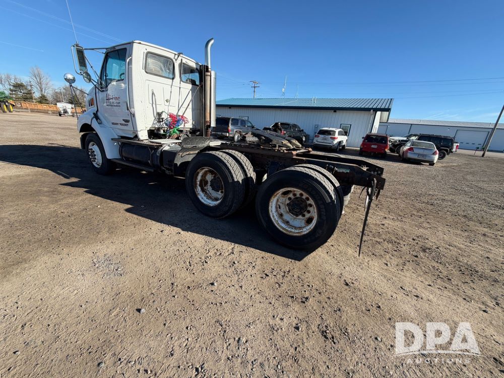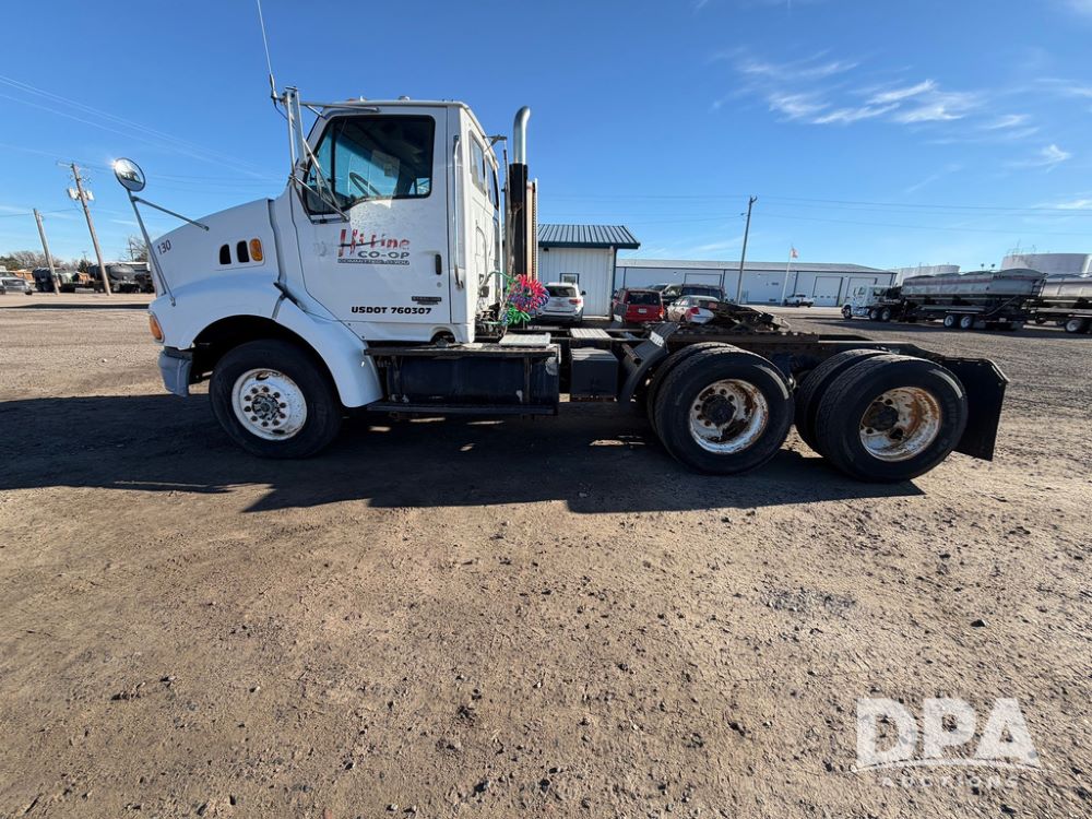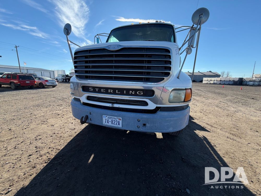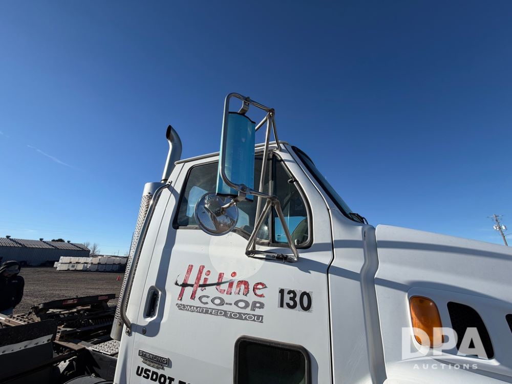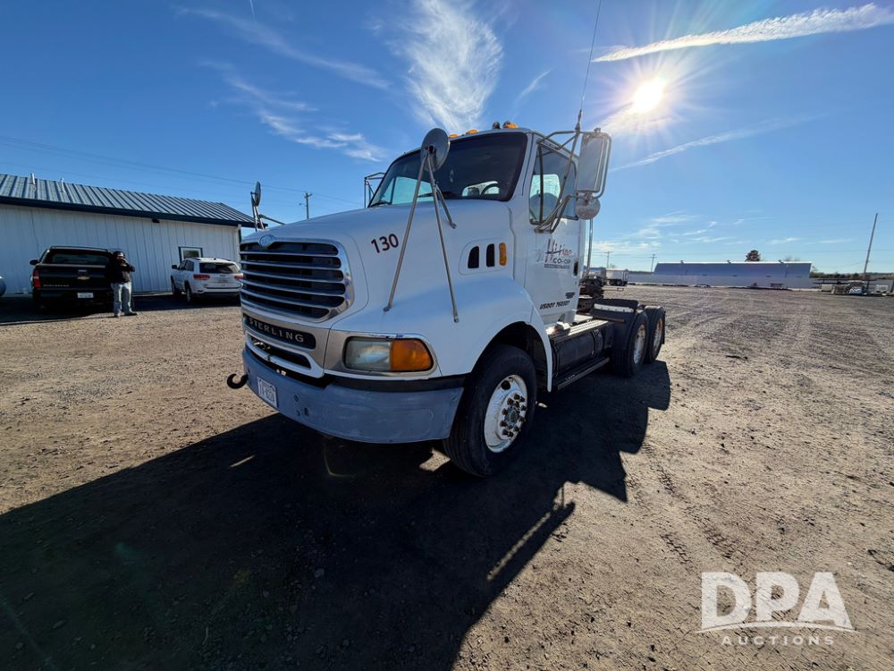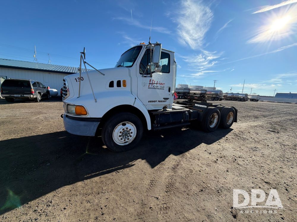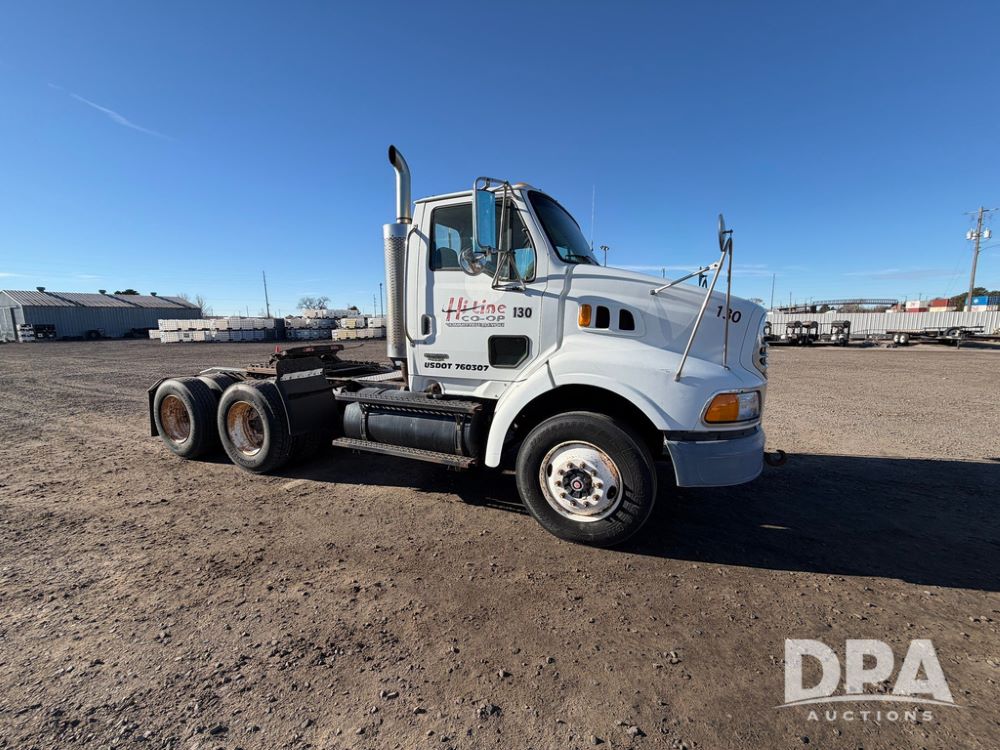 2004 Sterling AT9500 Day Cab Truck (RR0588, Unit 130), Caterpillar C-12 diesel 410HP engine, manual transmission, heat, air conditioning, AM/FM radio, cruise control, tandem axle, twin screw, air ride suspension, 5th wheel plate, 275/80R22.5 fronts, 295/75R22.5 rears, shows 442,365 miles.