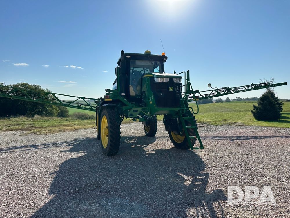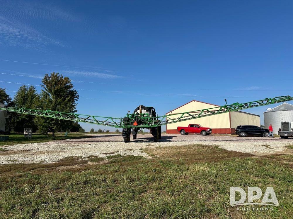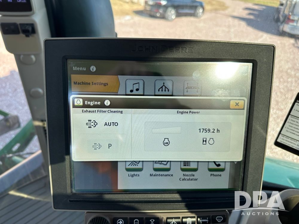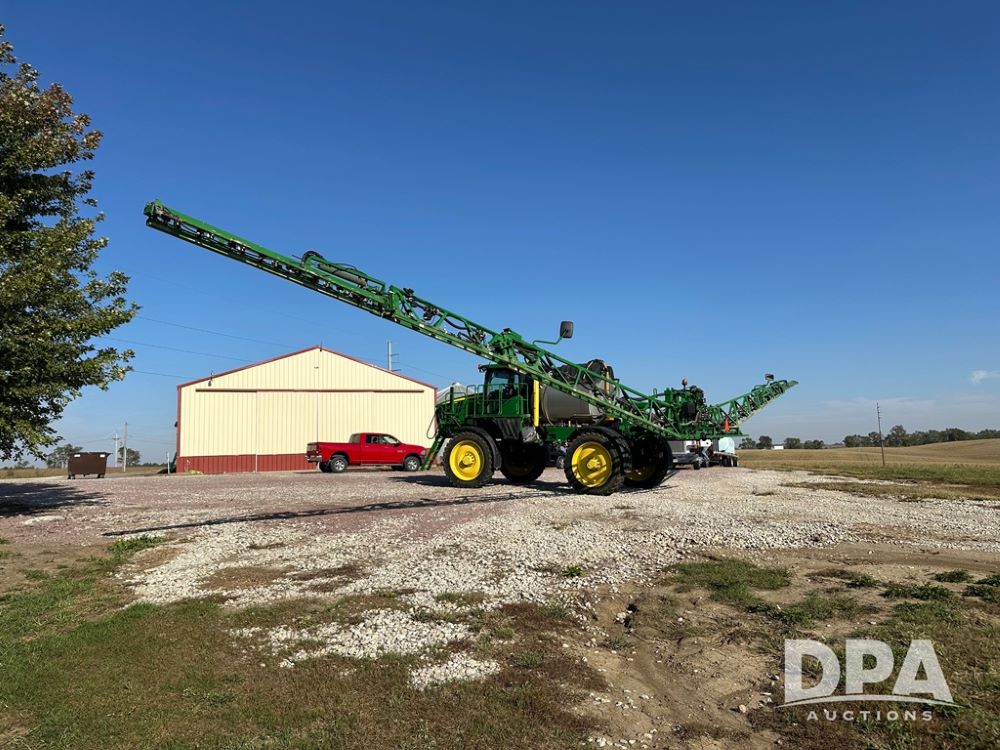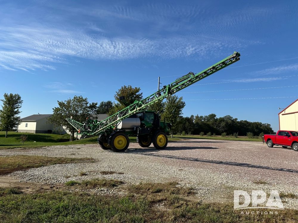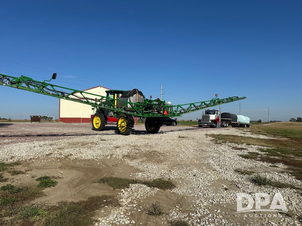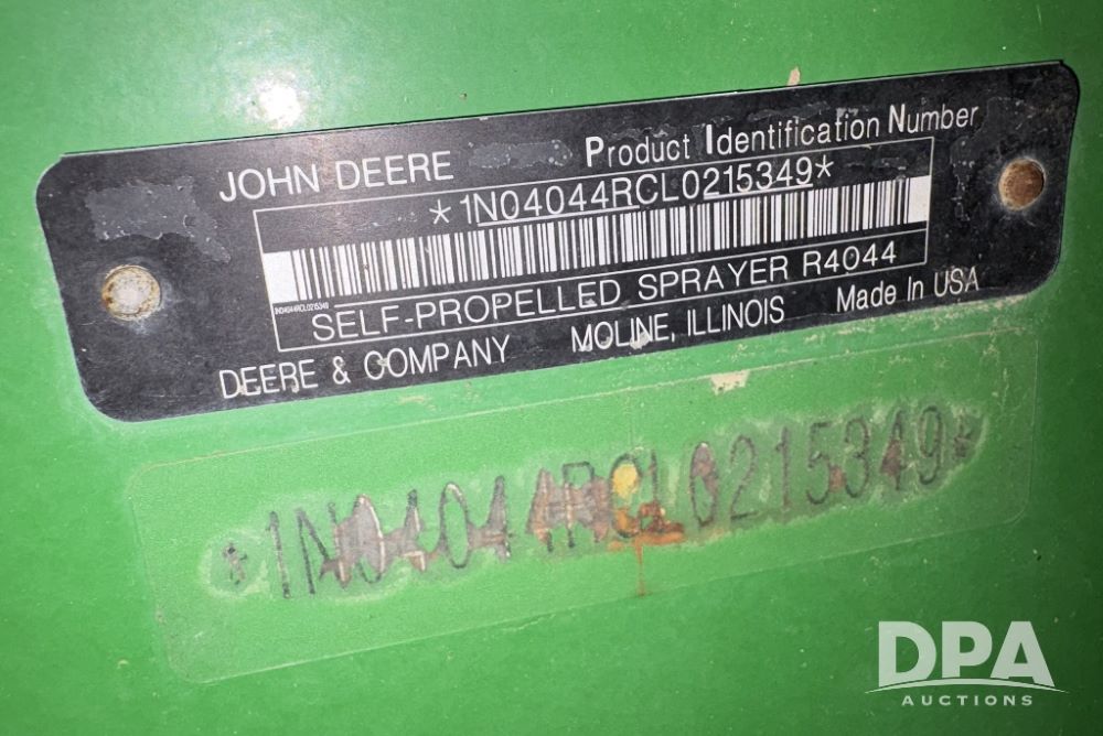 2021 John Deere R4044 Sprayer (NP6179), John Deere diesel engine, hydrostatic transmission, heat, air conditioning, Am/Fm radio, leather driver and buddy seat, 1,200 gallon stainless steel liquid system, 100' boom, top mount poly rinse tank, stainless steel chemical inductor tank, automatic solution control, front fill option, 380/90R46 tires, StarFire 6000 globe, John Deere monitor, shows 1,759 hours.