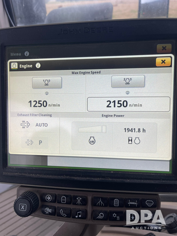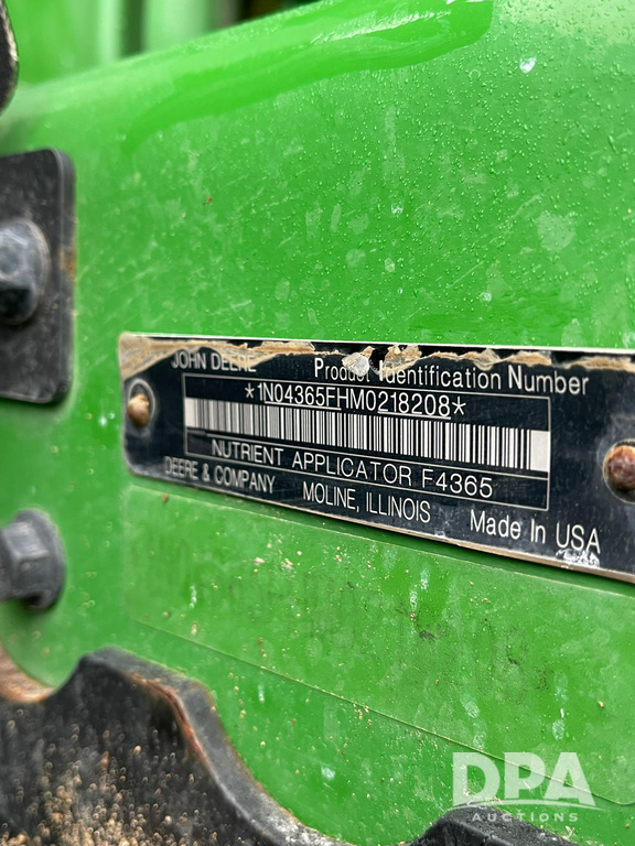 2021 John Deere F4365 Dry Floater (LLD1610), John Deere diesel engine, hydrostatic transmission, heat, air conditioning, Am/Fm radio, DN495 stainless steel dry spreader box, dual spinners, hydraulic, Starfire 6000 globe, John Deere Monitor, shows 1,941 hours.