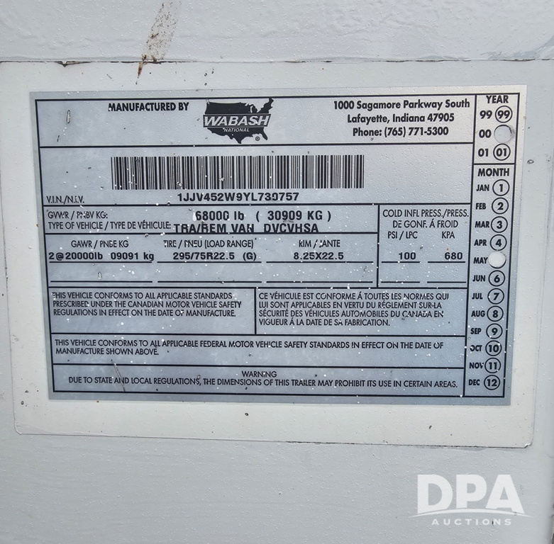 2000 Wabash Van Trailer (ED5406), 48' x 96" dry van trailer, rear cargo door, tandem axle, 22.5 tires, 68,000 lb. GVWR.