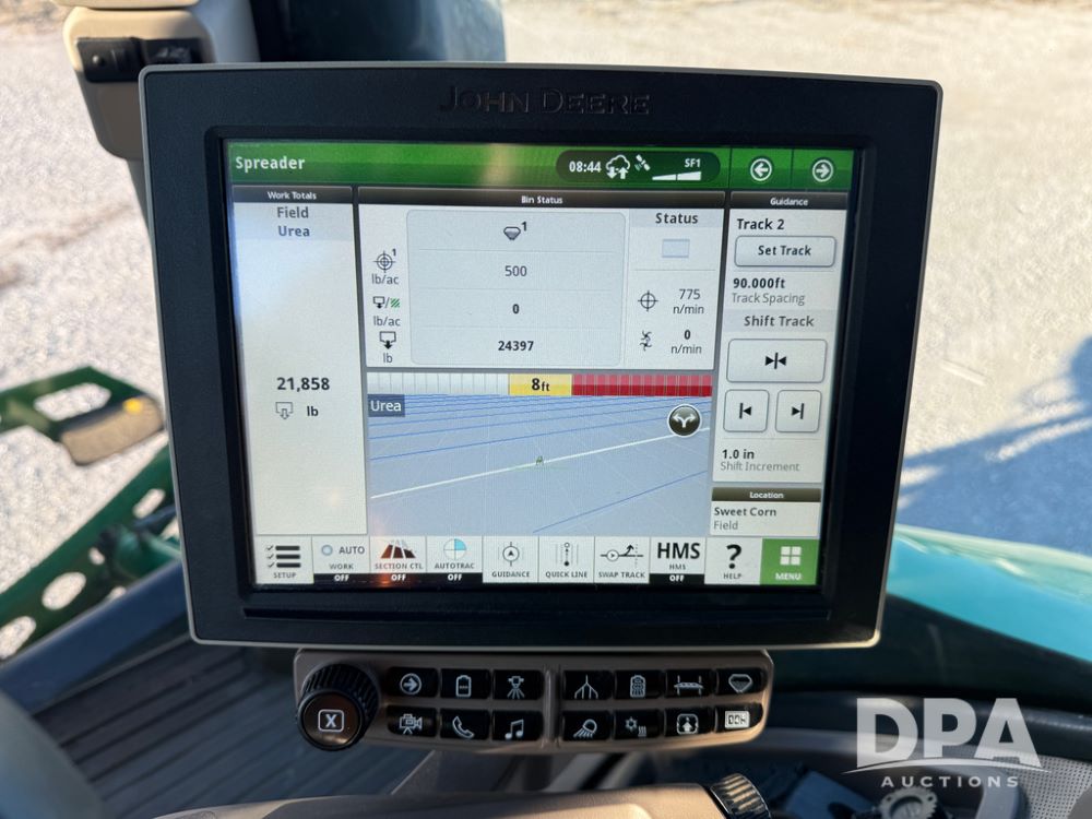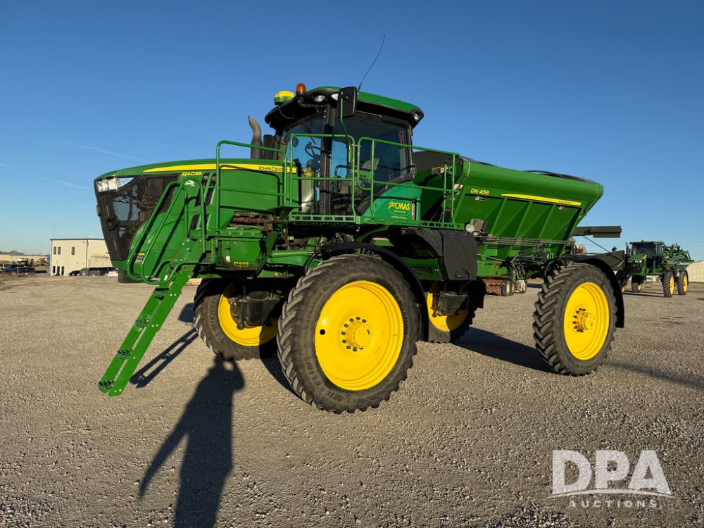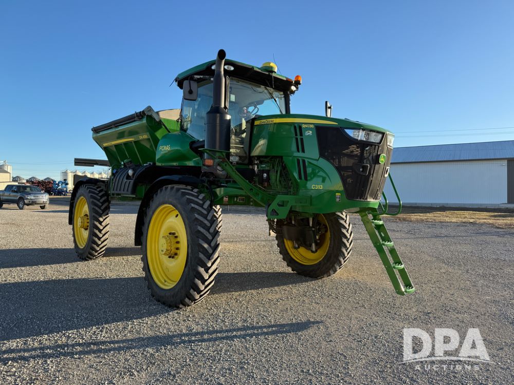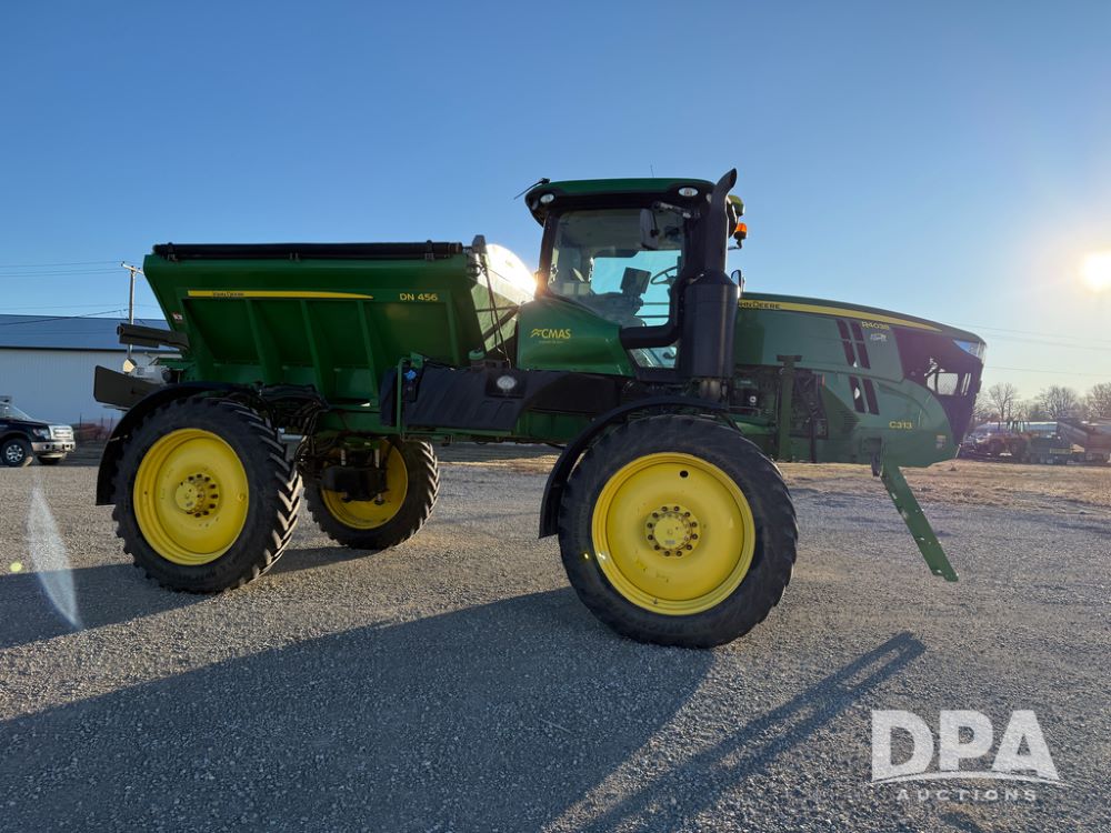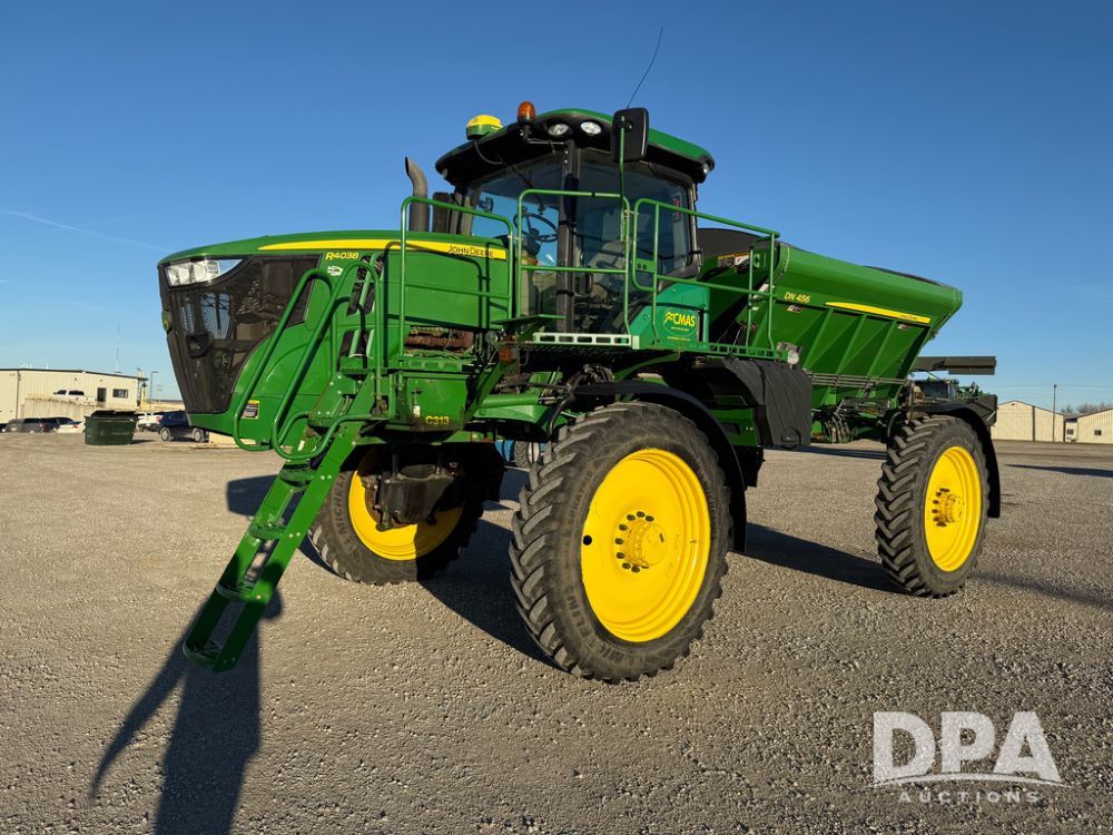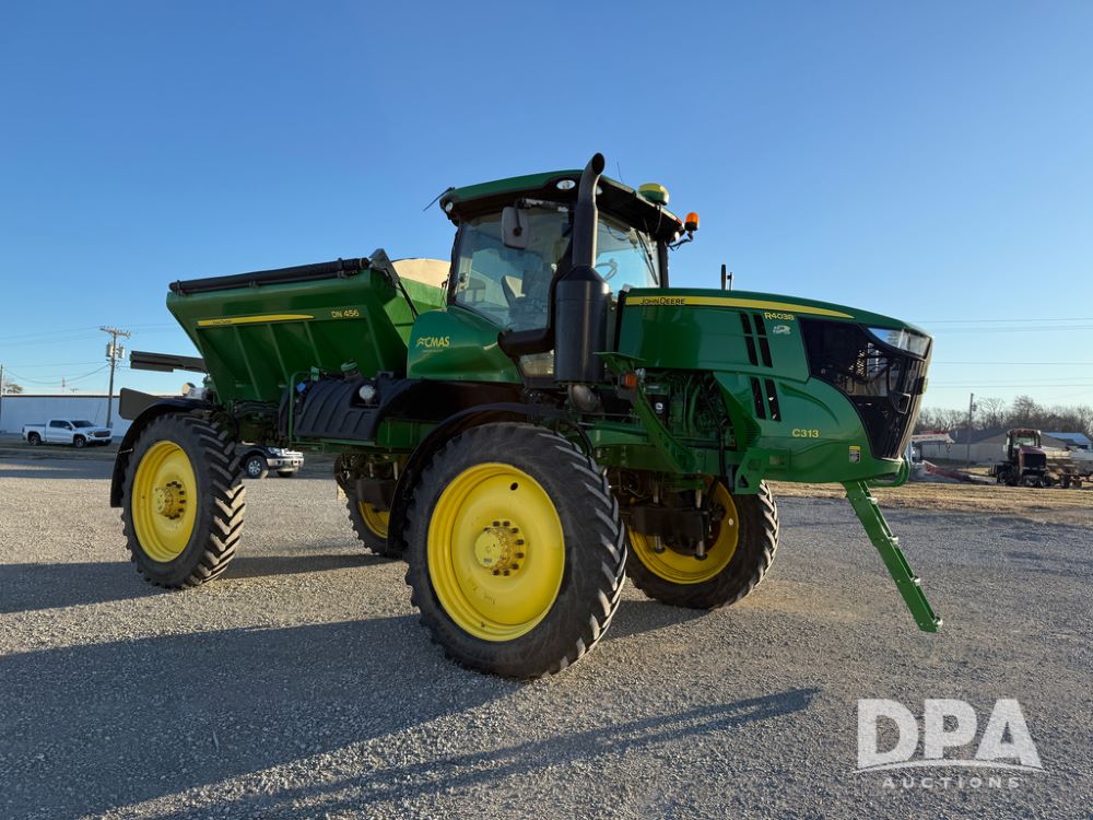 2019 John Deere R4038 Dry Machine (NP6401, Unit C313), John Deere diesel engine (S/N RG6090U065111), hydrostatic transmission, heat, air conditioning, Am/Fm radio, John Deere DN456 stainless steel dry spreader box (Model AKK29230 - 11', S/N 686436), dual spinners, hydraulic, Agri-Cover electric roll tarp, Michelin VF380/90R46 row crop tires, fenders, CabCam Camera, StarFire 6000 globe, John Deere Command Center, shows 3,594 hours.