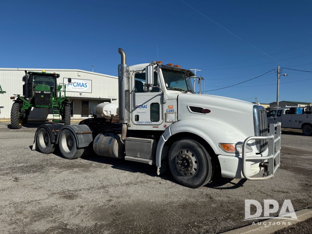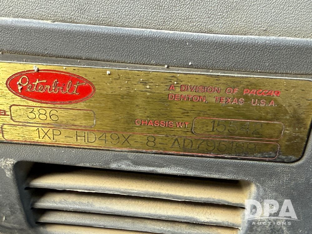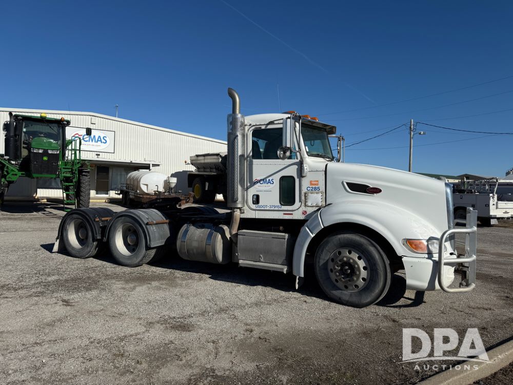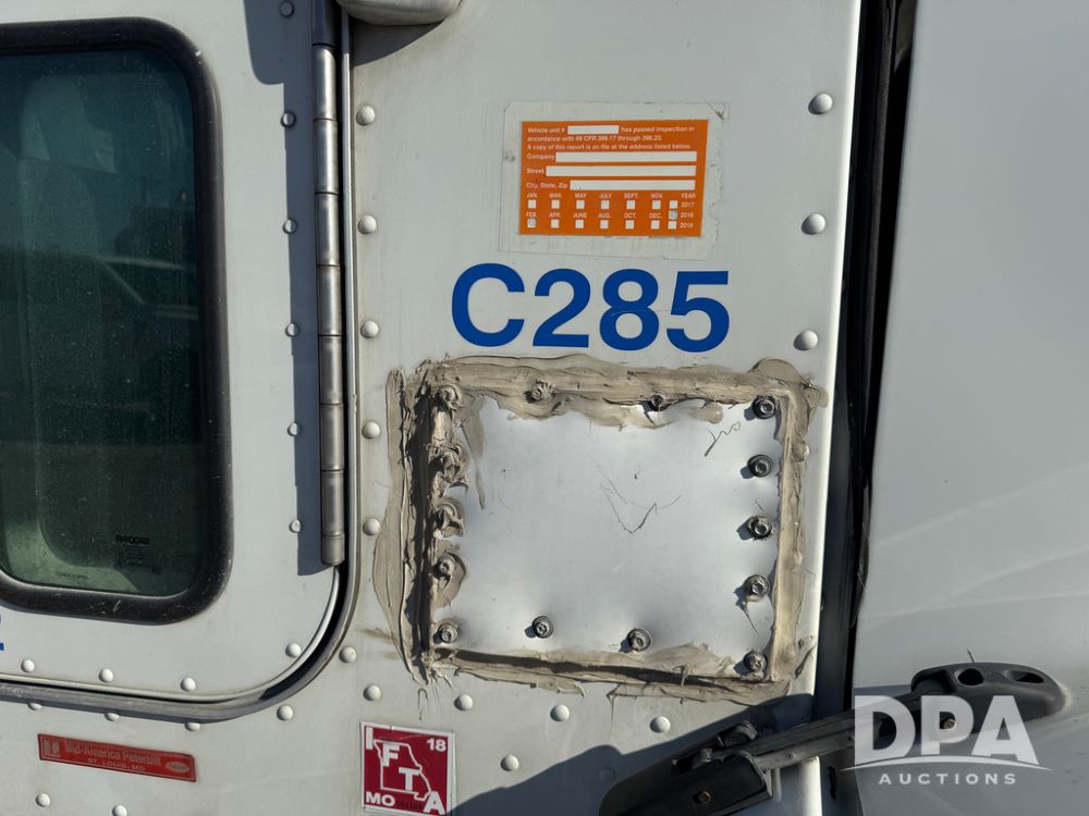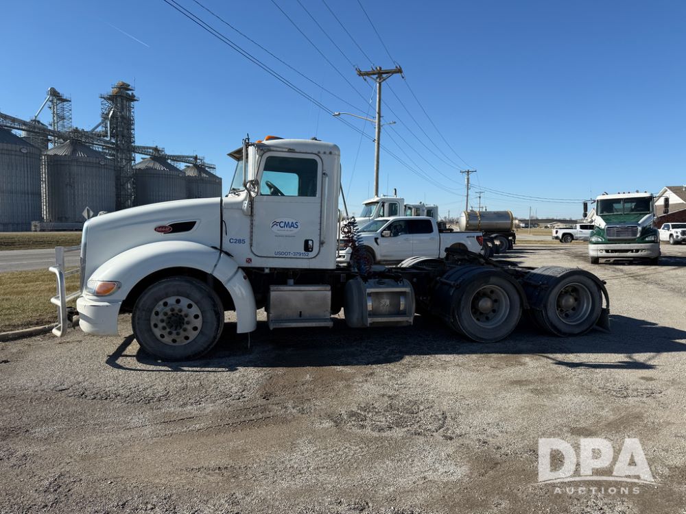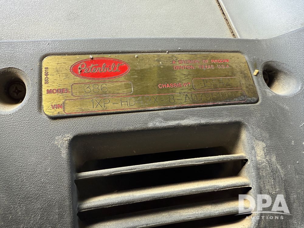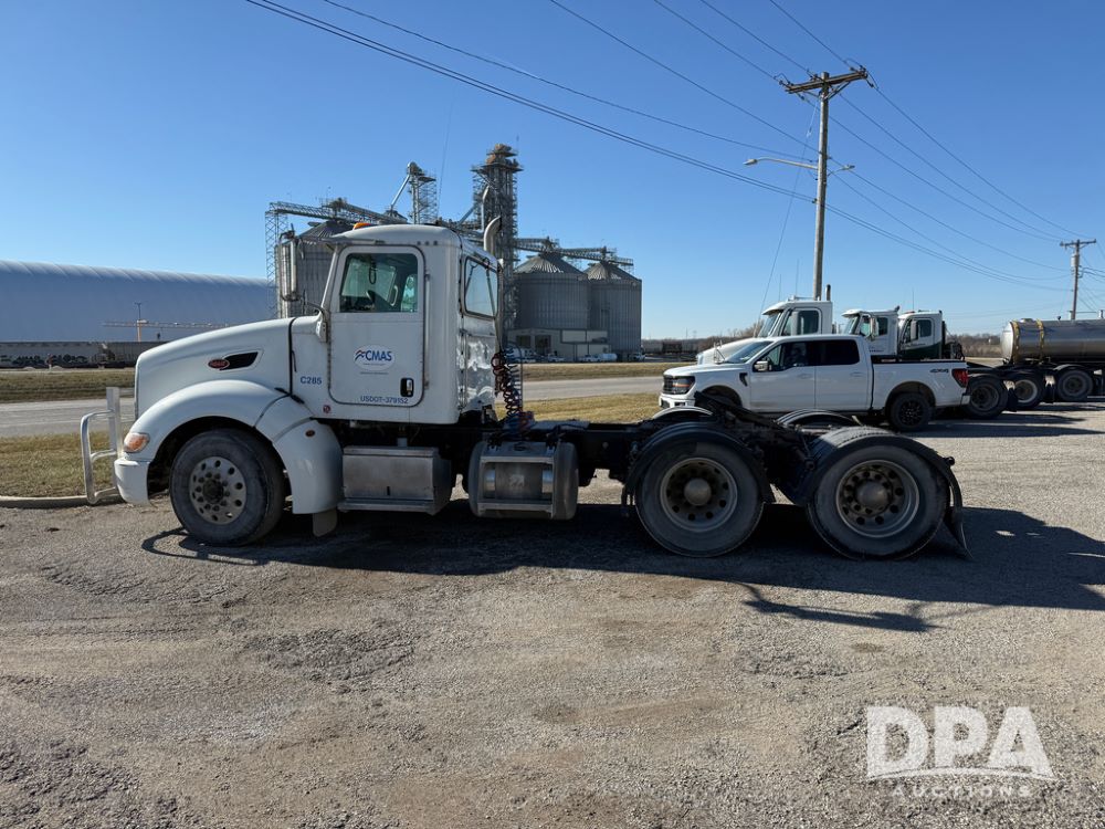2010 Peterbilt 386 Day Cab Truck (NP6410, Unit C285), Cummins DOHC diesel engine, Eaton Fuller 10 speed transmission, heat, Am/Fm radio, cruise control, air ride cab, tandem axle, Peterbilt Low Air Leaf suspension, 5th wheel plate, dual fuel tanks, single exhaust, 295/75R22.5 rear tires, 11R22.5 front tires, RIGGUARD truck guard, engine heater, approx. 186" wheelbase, GVWR 52,000 pounds, shows 713,507 miles.