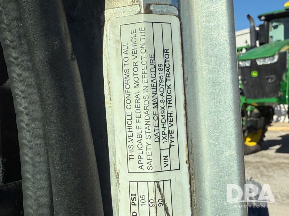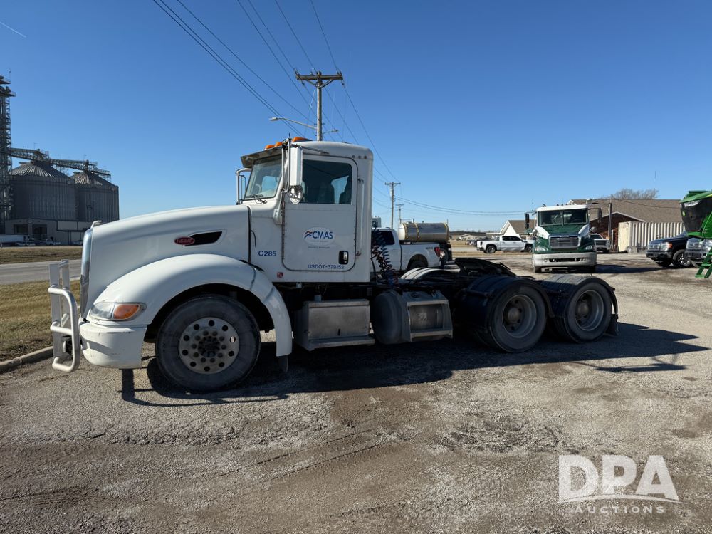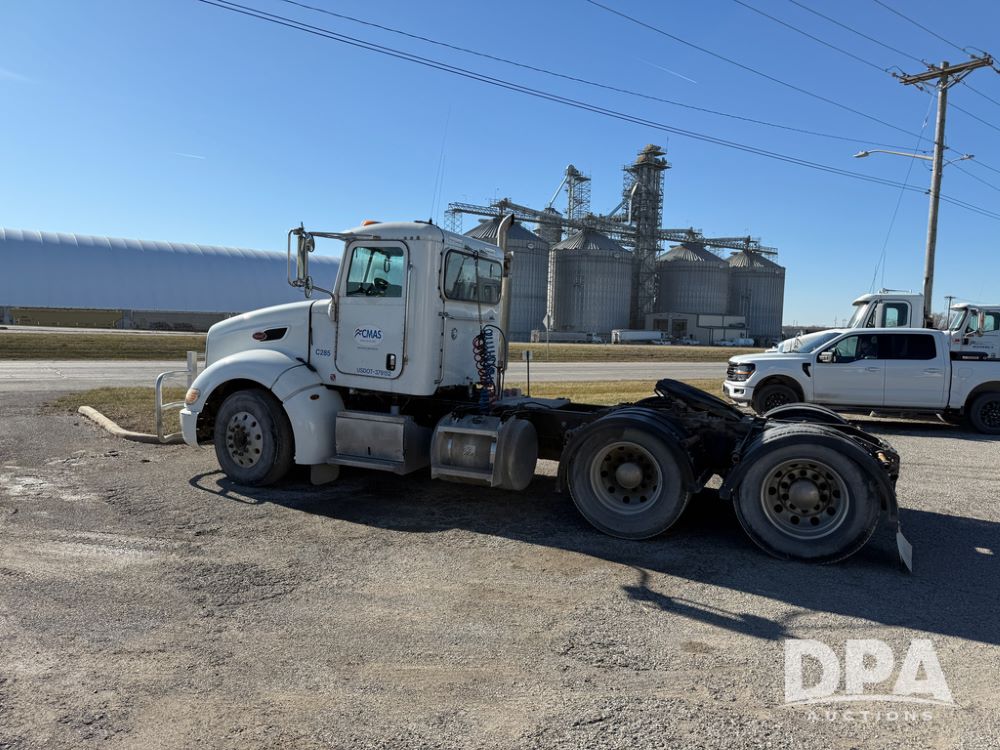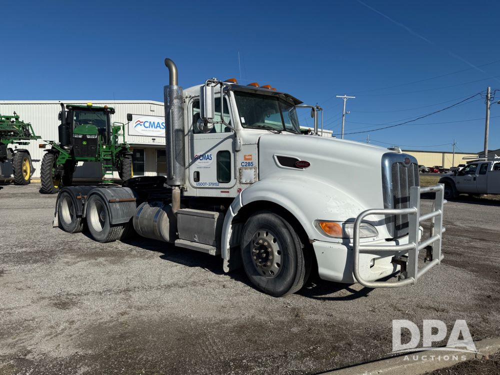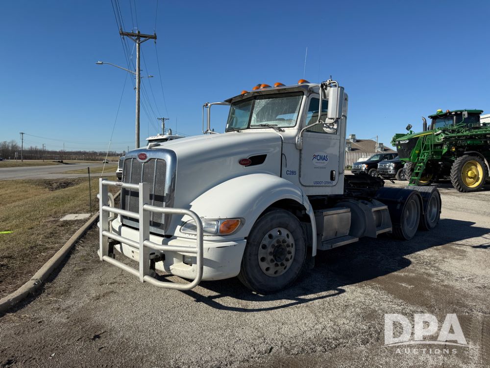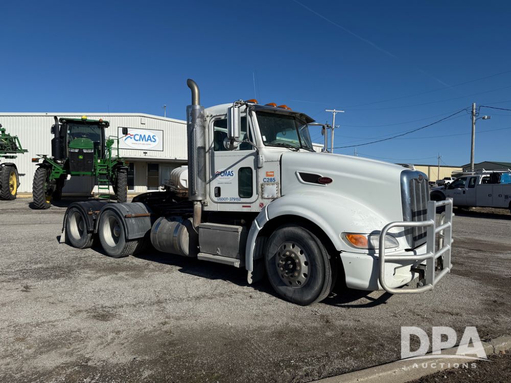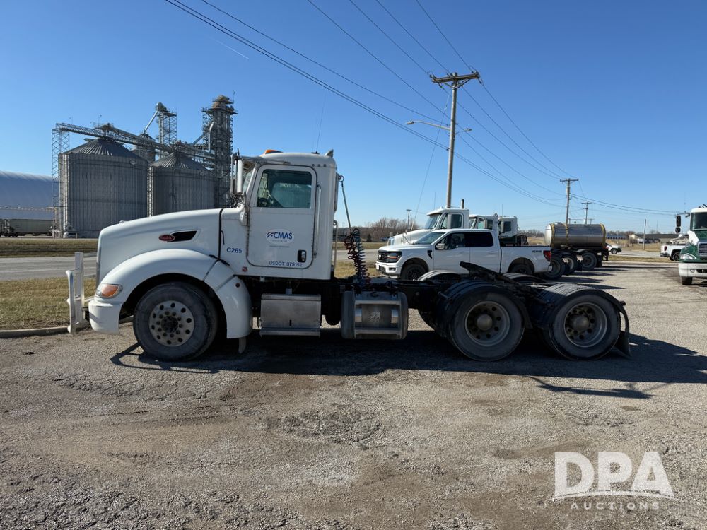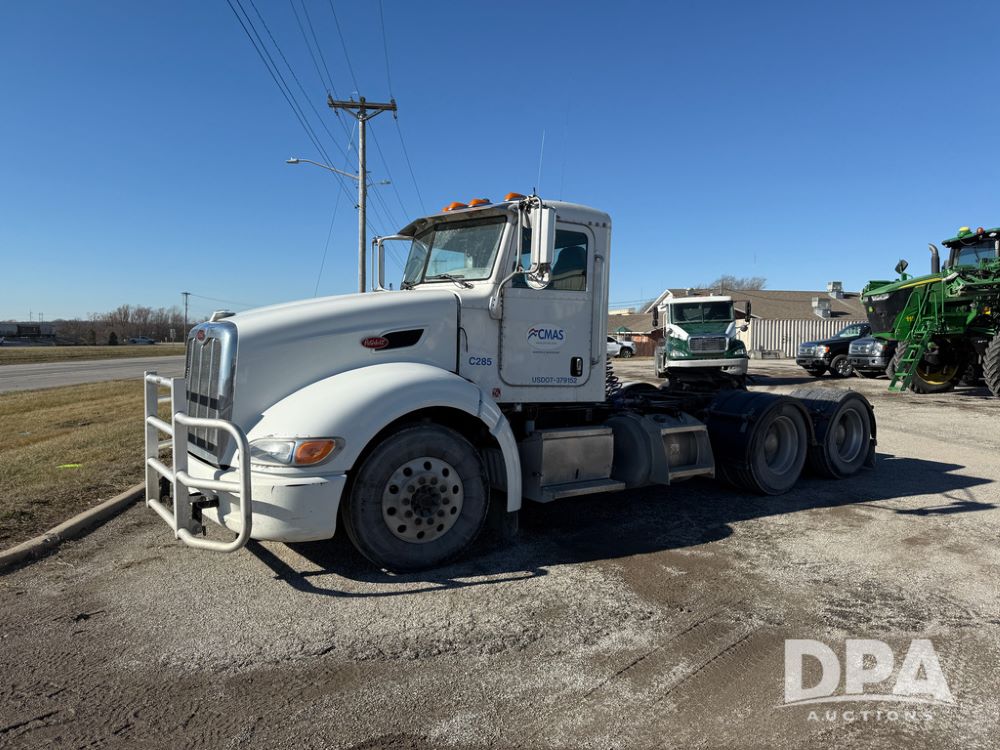 2010 Peterbilt 386 Day Cab Truck (NP6410, Unit C285), Cummins DOHC diesel engine, Eaton Fuller 10 speed transmission, heat, Am/Fm radio, cruise control, air ride cab, tandem axle, Peterbilt Low Air Leaf suspension, 5th wheel plate, dual fuel tanks, single exhaust, 295/75R22.5 rear tires, 11R22.5 front tires, RIGGUARD truck guard, engine heater, approx. 186" wheelbase, GVWR 52,000 pounds, shows 713,507 miles.