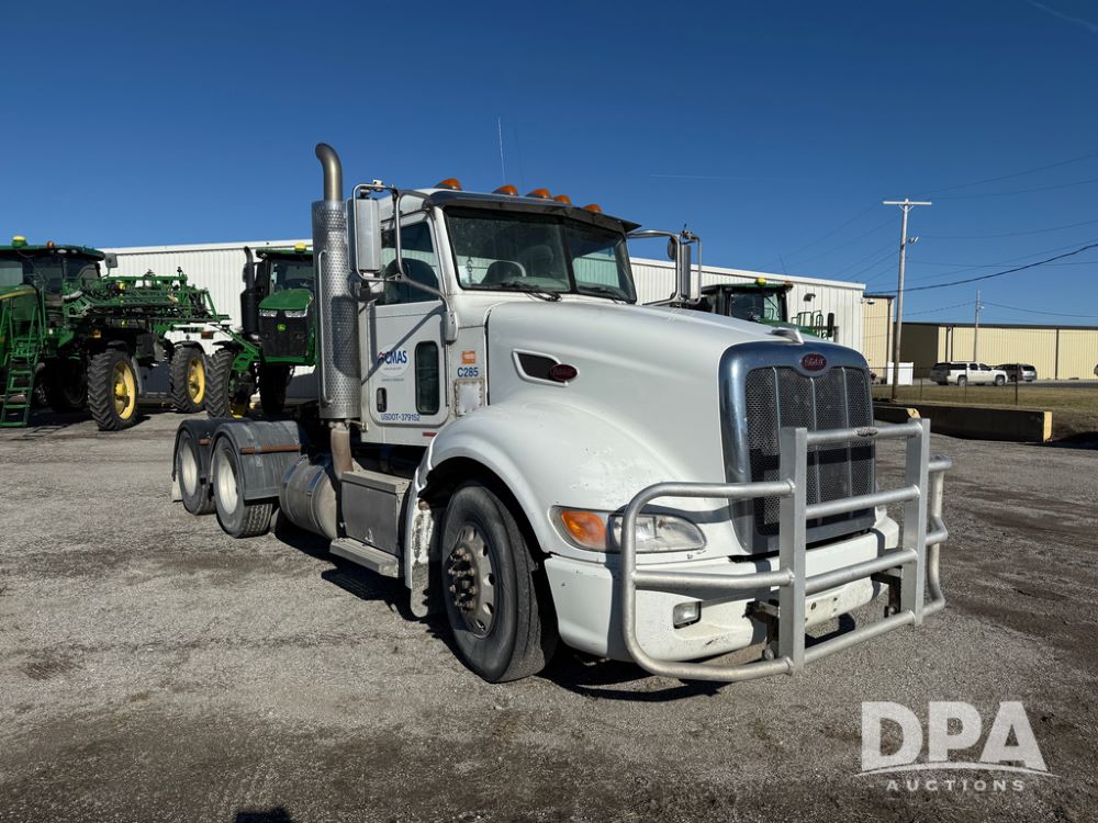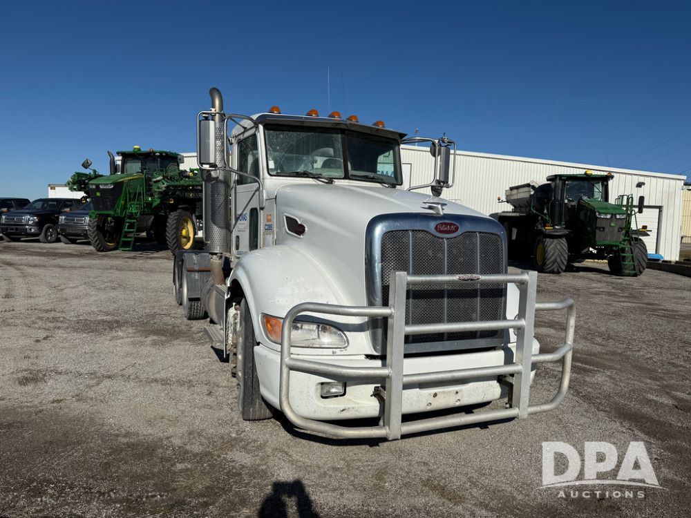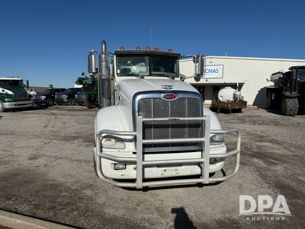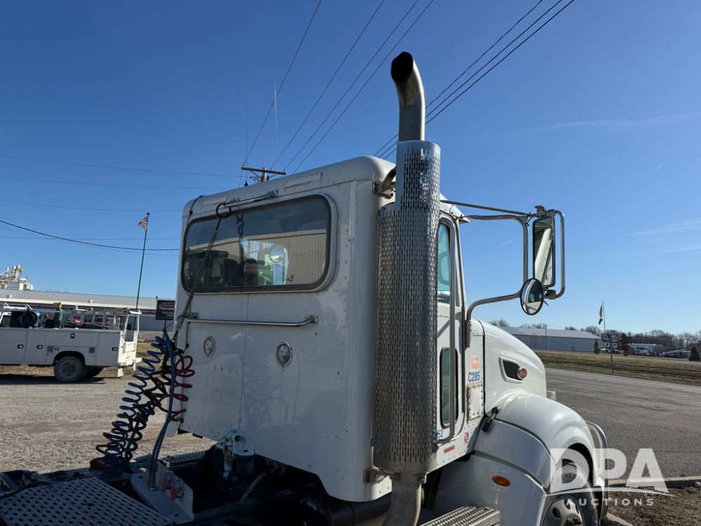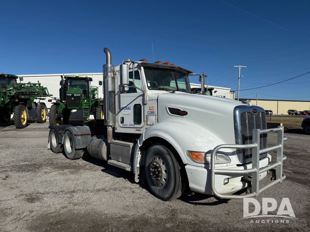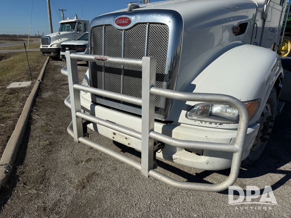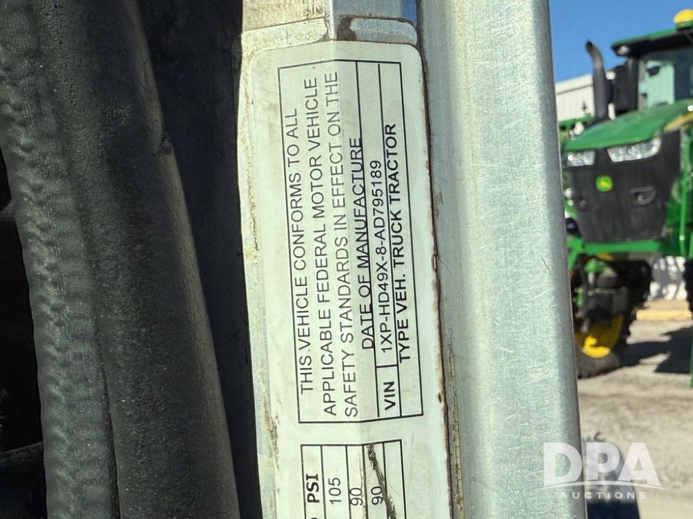 2010 Peterbilt 386 Day Cab Truck (NP6410, Unit C285), Cummins DOHC diesel engine, Eaton Fuller 10 speed transmission, heat, Am/Fm radio, cruise control, air ride cab, tandem axle, Peterbilt Low Air Leaf suspension, 5th wheel plate, dual fuel tanks, single exhaust, 295/75R22.5 rear tires, 11R22.5 front tires, RIGGUARD truck guard, engine heater, approx. 186" wheelbase, GVWR 52,000 pounds, shows 713,507 miles.