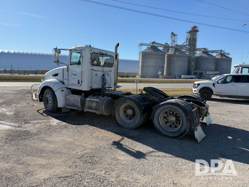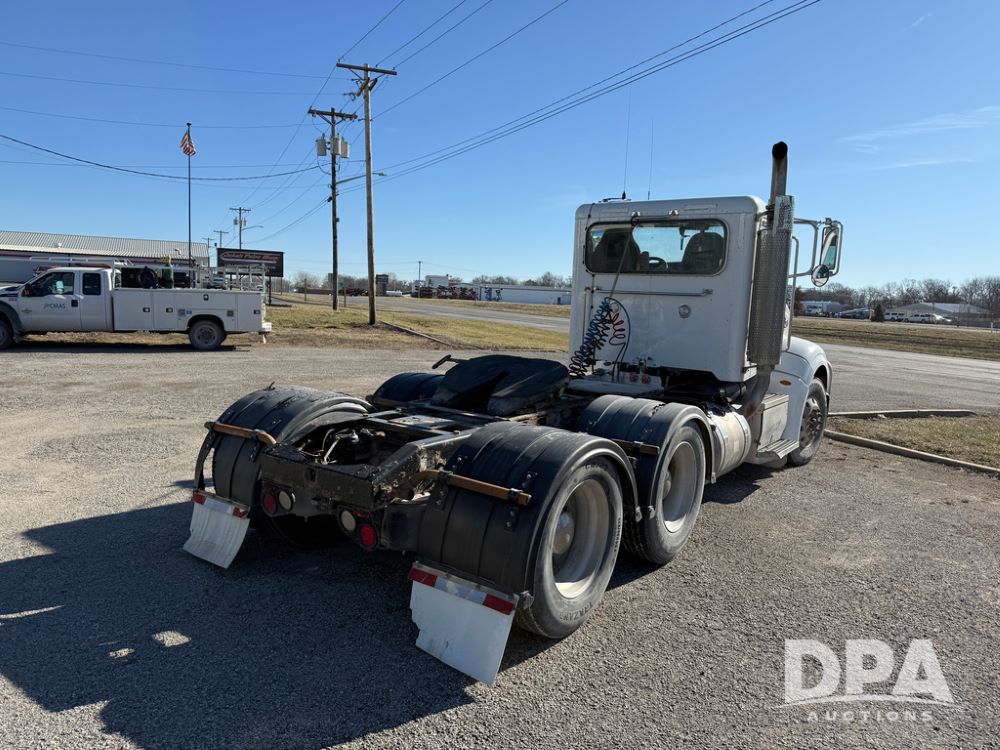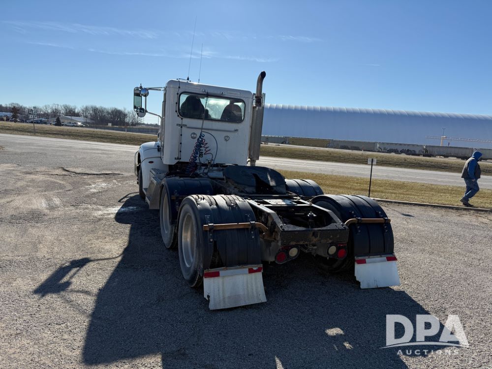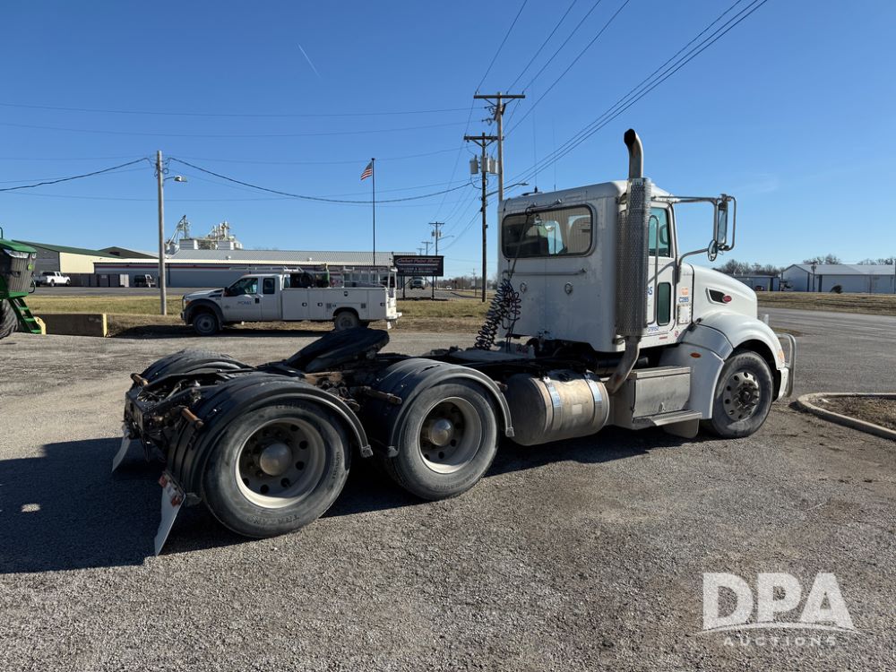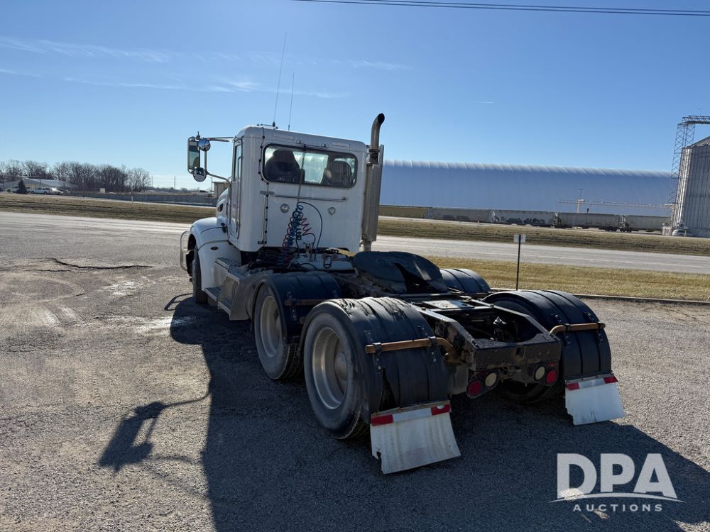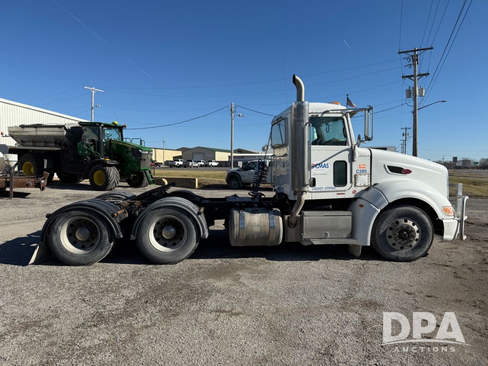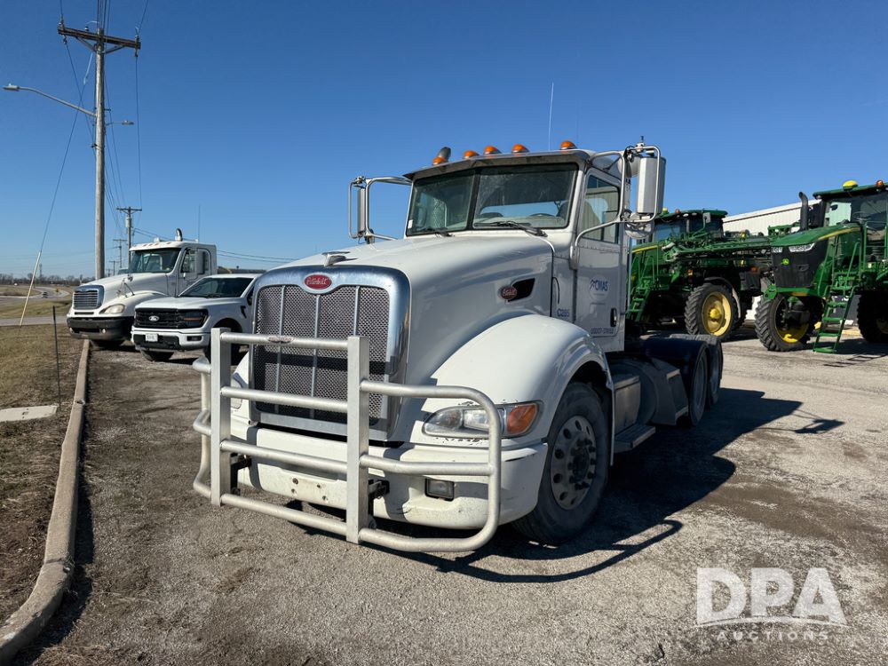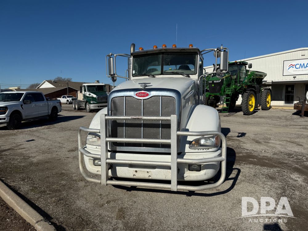 2010 Peterbilt 386 Day Cab Truck (NP6410, Unit C285), Cummins DOHC diesel engine, Eaton Fuller 10 speed transmission, heat, Am/Fm radio, cruise control, air ride cab, tandem axle, Peterbilt Low Air Leaf suspension, 5th wheel plate, dual fuel tanks, single exhaust, 295/75R22.5 rear tires, 11R22.5 front tires, RIGGUARD truck guard, engine heater, approx. 186" wheelbase, GVWR 52,000 pounds, shows 713,507 miles.