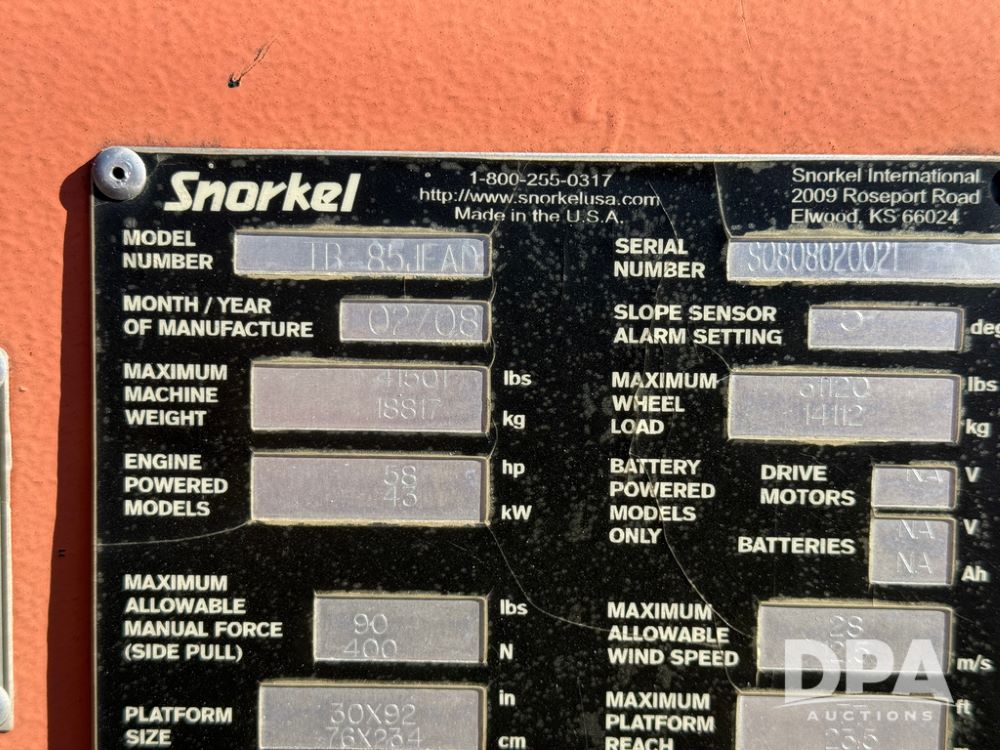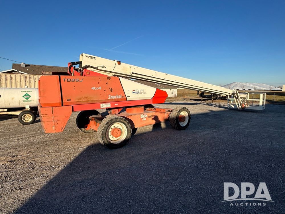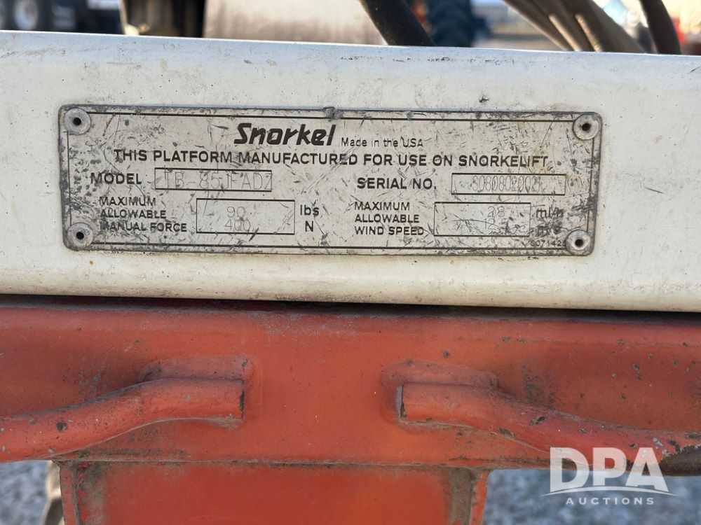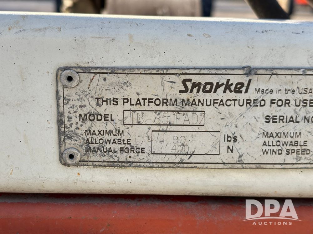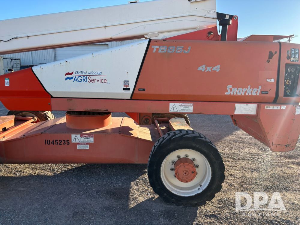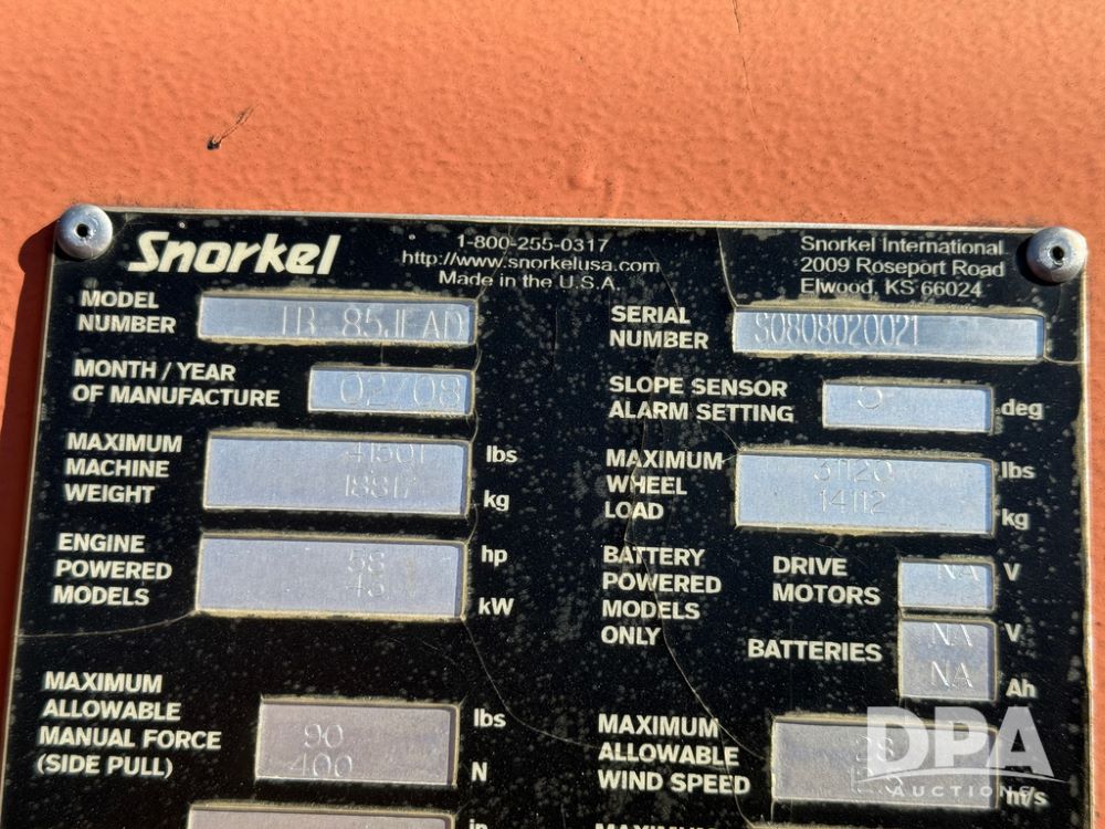 2008 Snorkel TB85J 4x4 Man Lift (GP12468, Unit C203), Snorkel Model TB85J 4x4 man lift, Diesel Power Equipment Company diesel engine, front platform basket Model TB-85JFADZ with joystick controls, 500 pound unrestricted capacity, 15-625NHS tires, machine weight 41,501 pounds, maximum platform height 85.3 feet, maximum platform reach 77 feet, maximum drive height 85.3 feet, maximum wheel load 31,120 pounds, shows 3,754 hours.