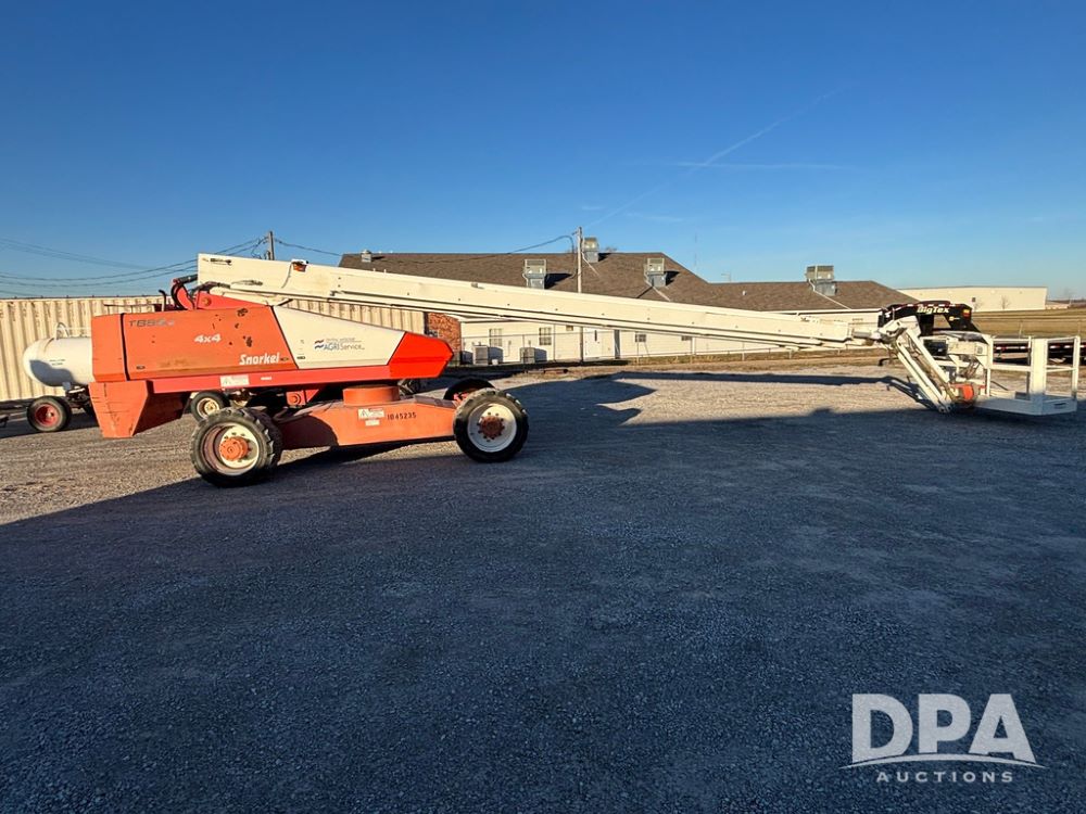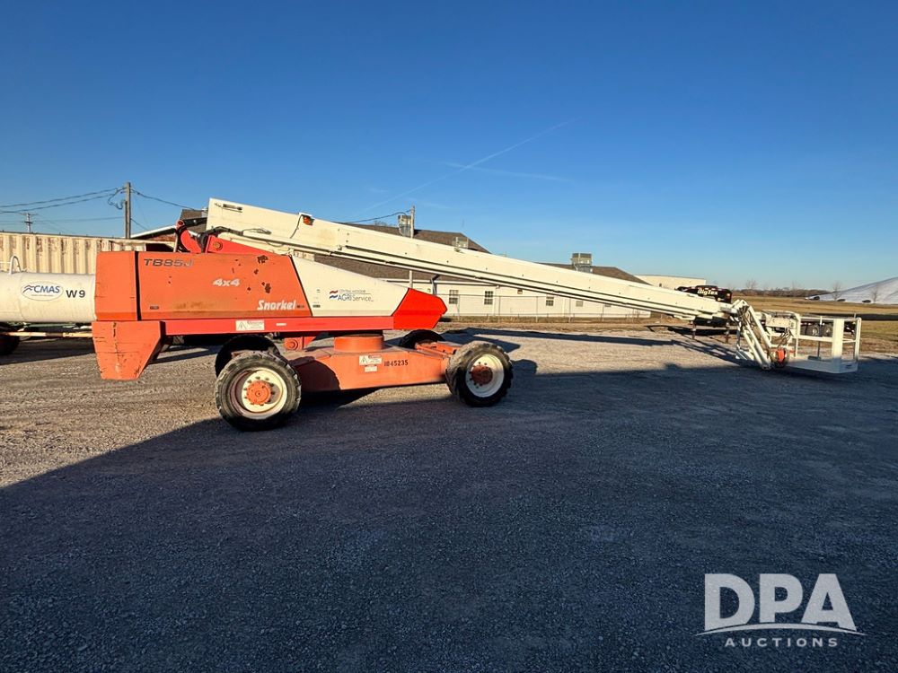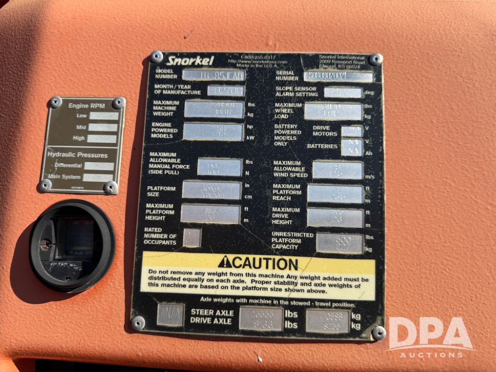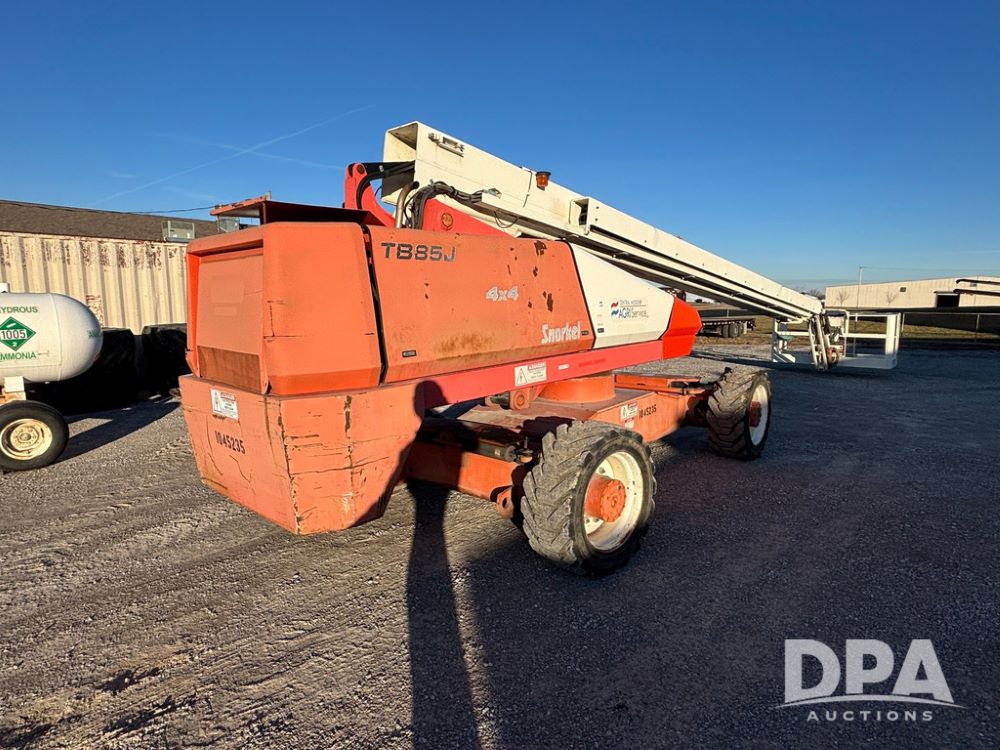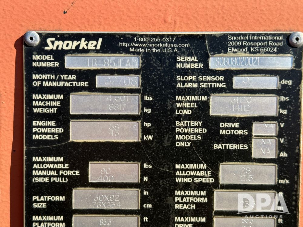 2008 Snorkel TB85J 4x4 Man Lift (GP12468, Unit C203), Snorkel Model TB85J 4x4 man lift, Diesel Power Equipment Company diesel engine, front platform basket Model TB-85JFADZ with joystick controls, 500 pound unrestricted capacity, 15-625NHS tires, machine weight 41,501 pounds, maximum platform height 85.3 feet, maximum platform reach 77 feet, maximum drive height 85.3 feet, maximum wheel load 31,120 pounds, shows 3,754 hours.