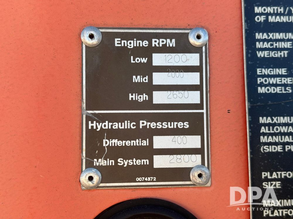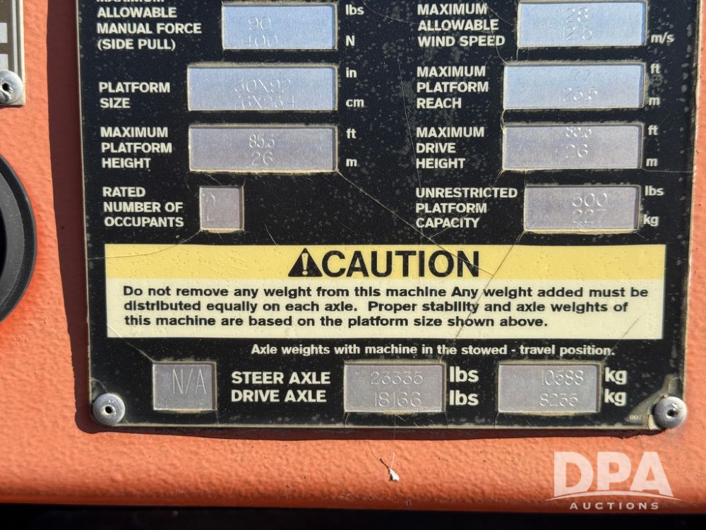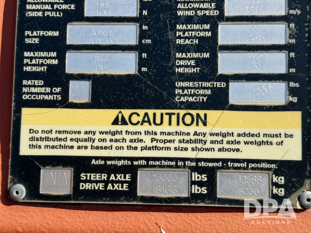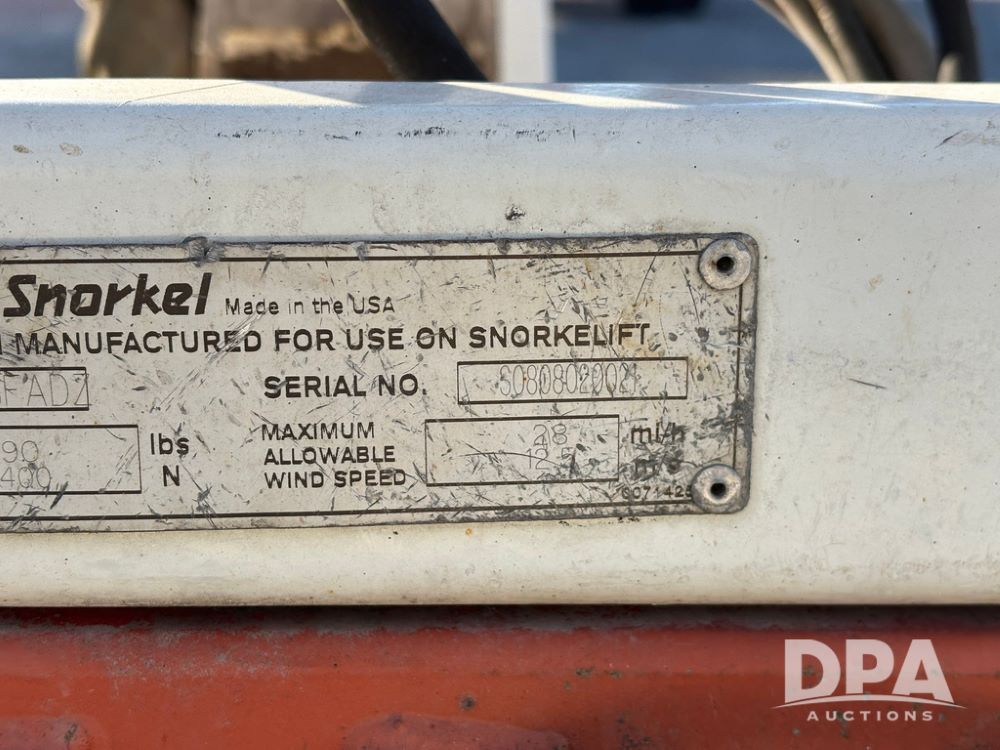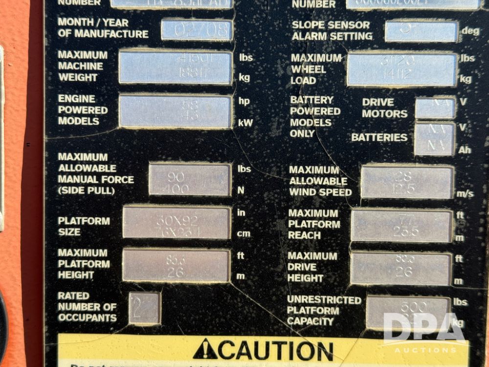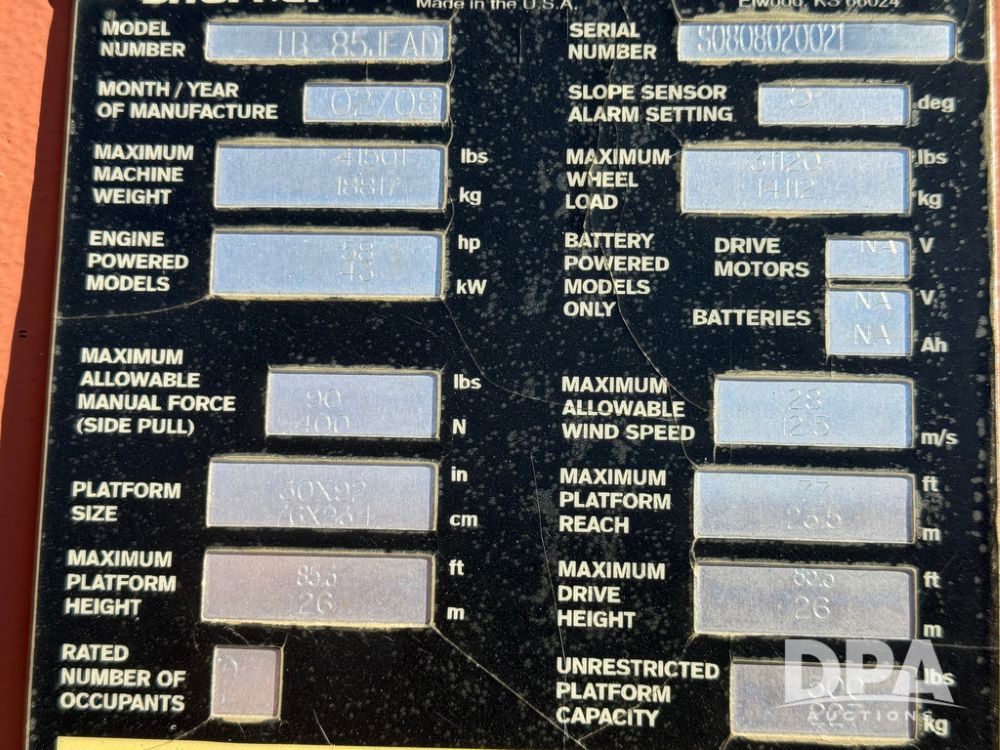 2008 Snorkel TB85J 4x4 Man Lift (GP12468, Unit C203), Snorkel Model TB85J 4x4 man lift, Diesel Power Equipment Company diesel engine, front platform basket Model TB-85JFADZ with joystick controls, 500 pound unrestricted capacity, 15-625NHS tires, machine weight 41,501 pounds, maximum platform height 85.3 feet, maximum platform reach 77 feet, maximum drive height 85.3 feet, maximum wheel load 31,120 pounds, shows 3,754 hours.