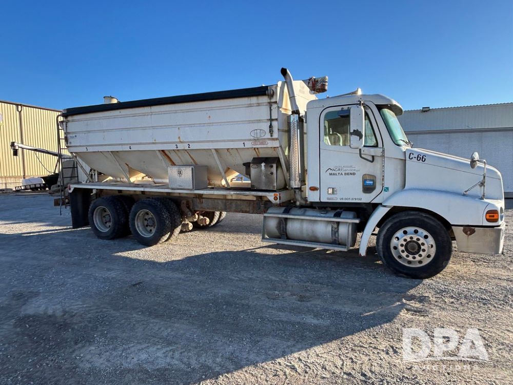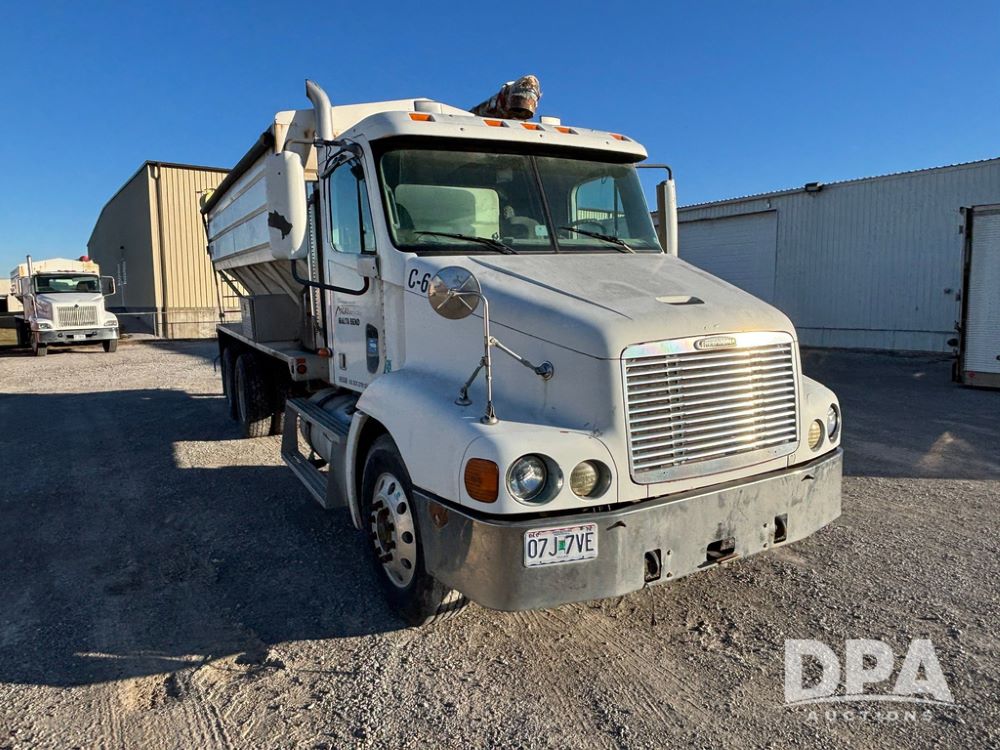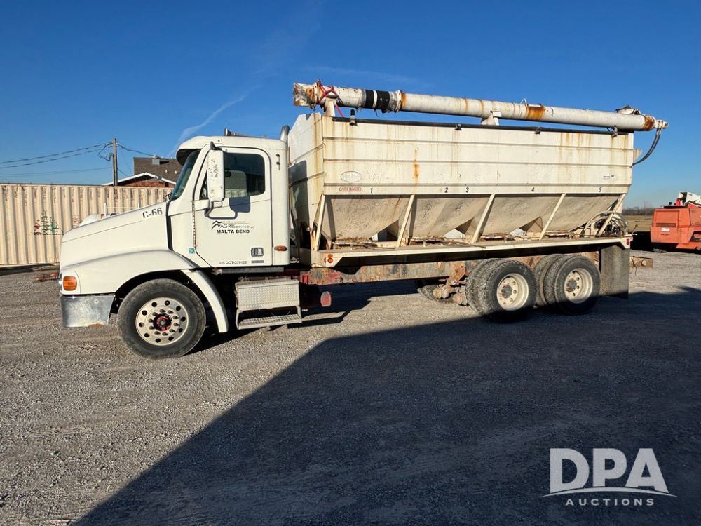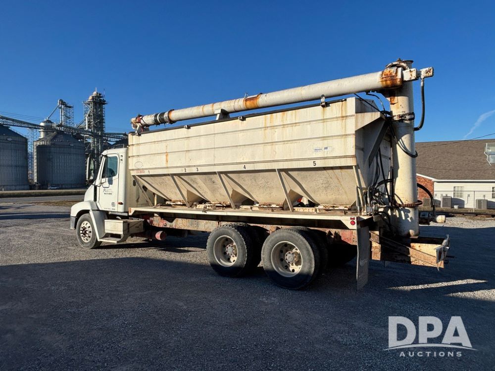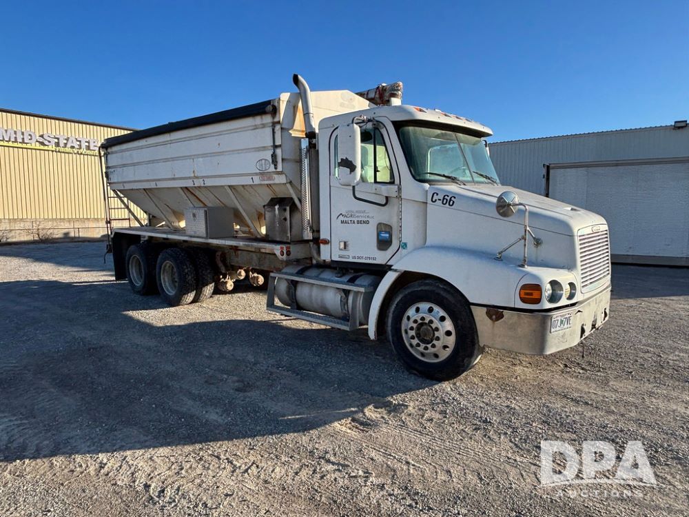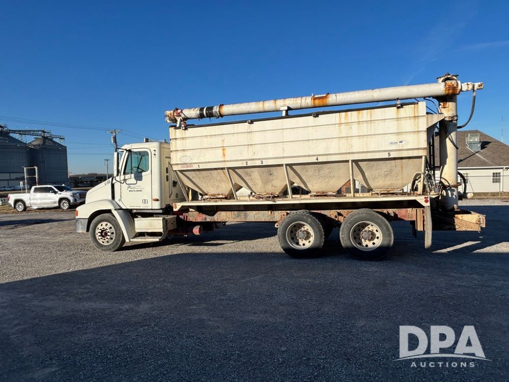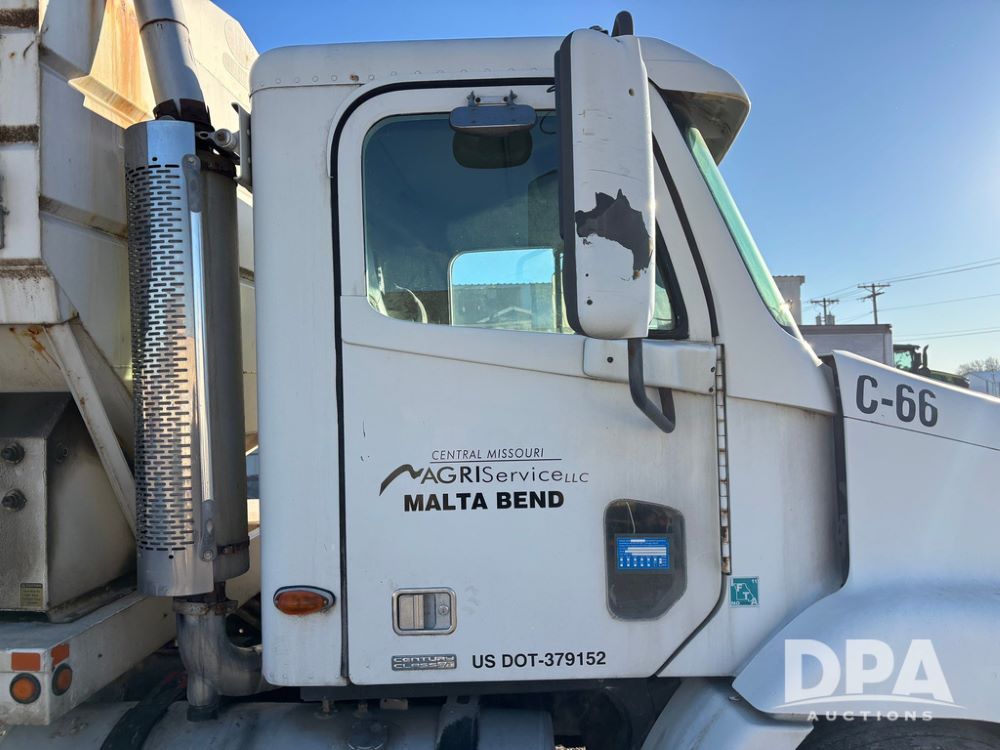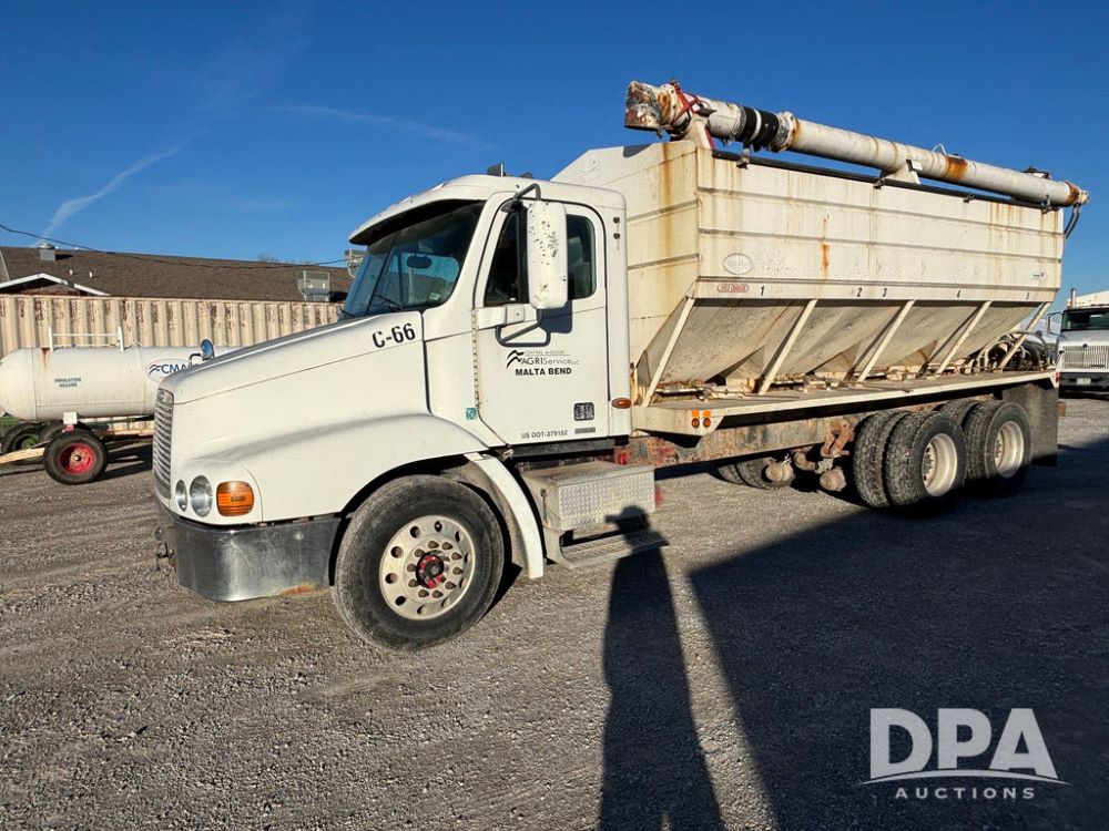 2002 Freightliner Century Class S/T Dry Tender Truck (GP12470, Unit C66), Cummins ISM diesel engine, 10 speed transmission, heat, Am/Fm radio, tandem axle, spring suspension, Ray-Man Field Charger Model 18CHIIFB dry tender box (S/N 10111783), 18 ton capacity, 5 compartment, overhead hydraulic auger, manual roll tarp, single fuel tank, single exhaust, 275/80R22.5 tires, approx. 228" wheelbase, GVWR 52,000 pounds, shows 674,894 miles.