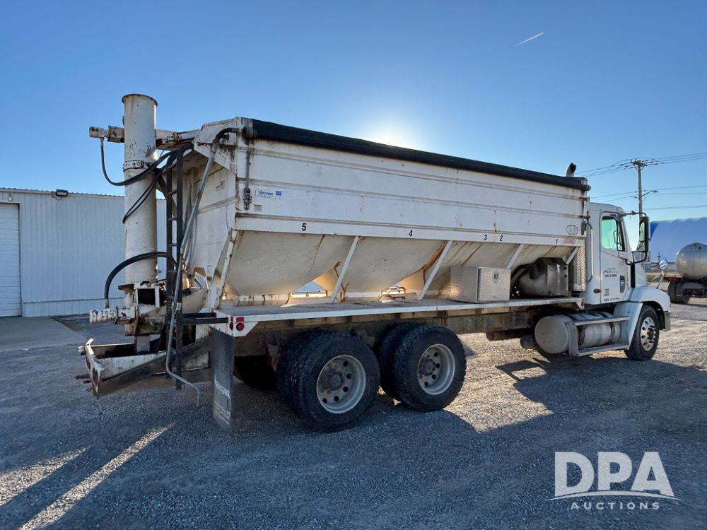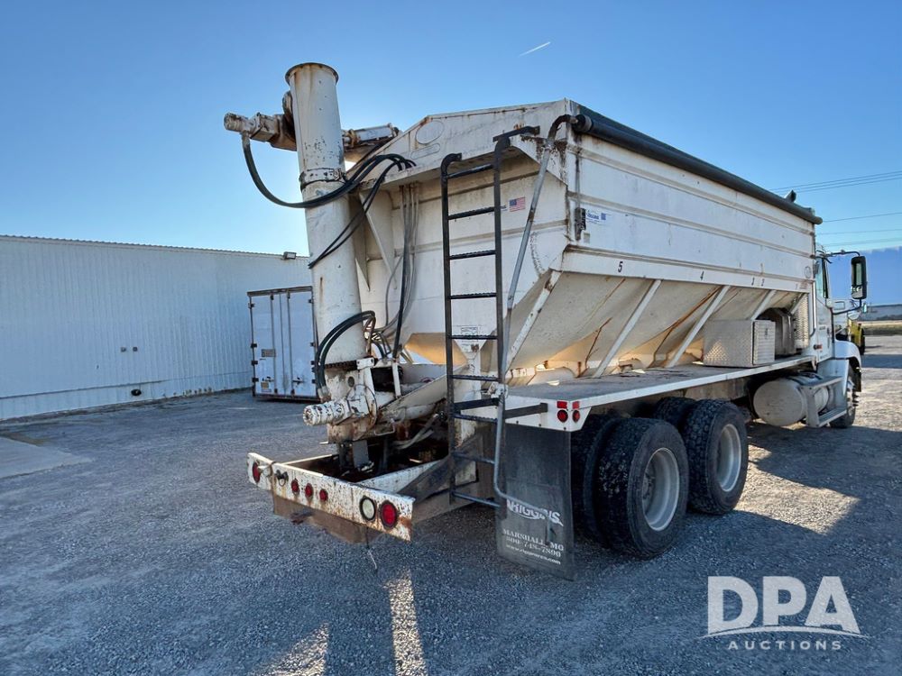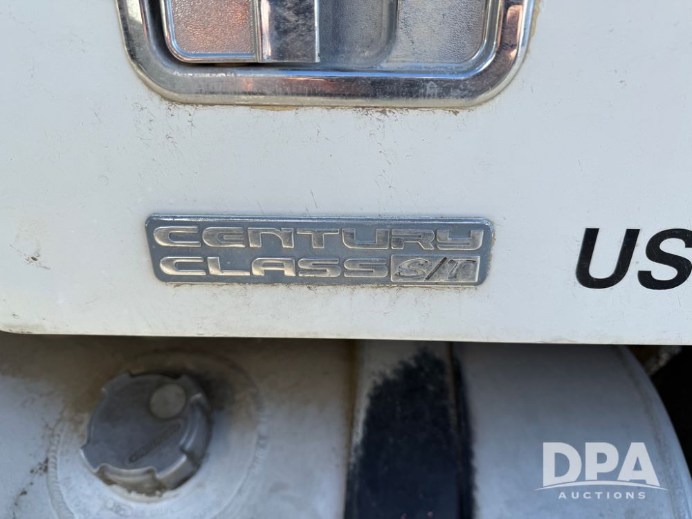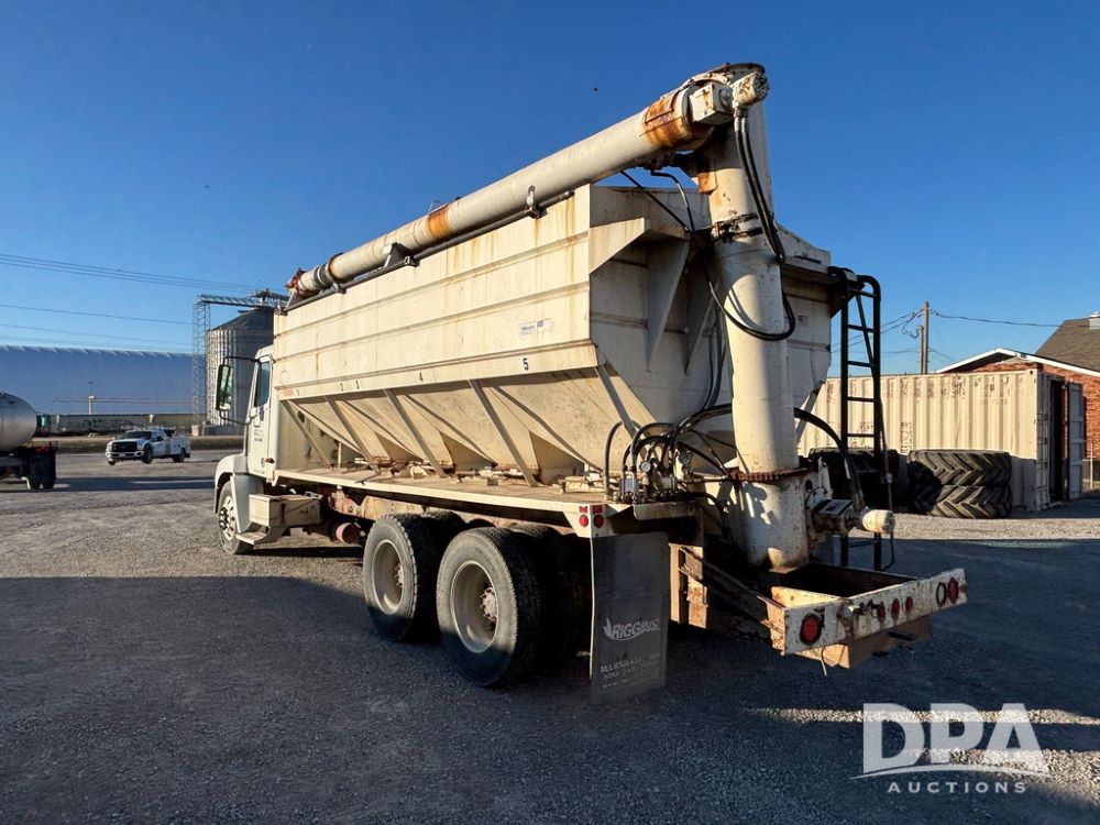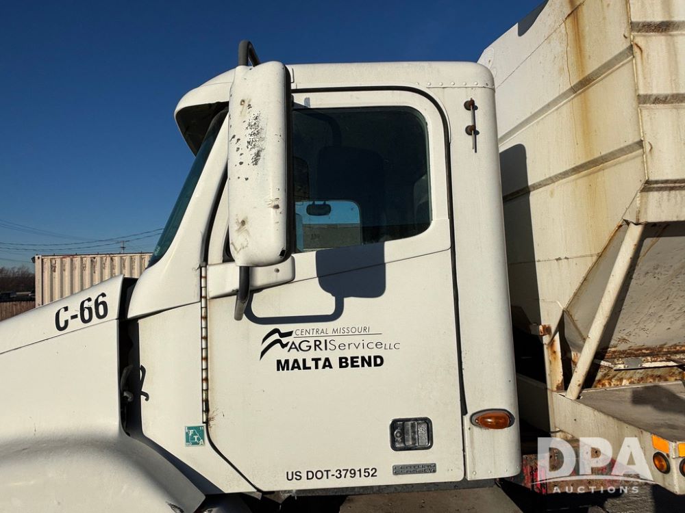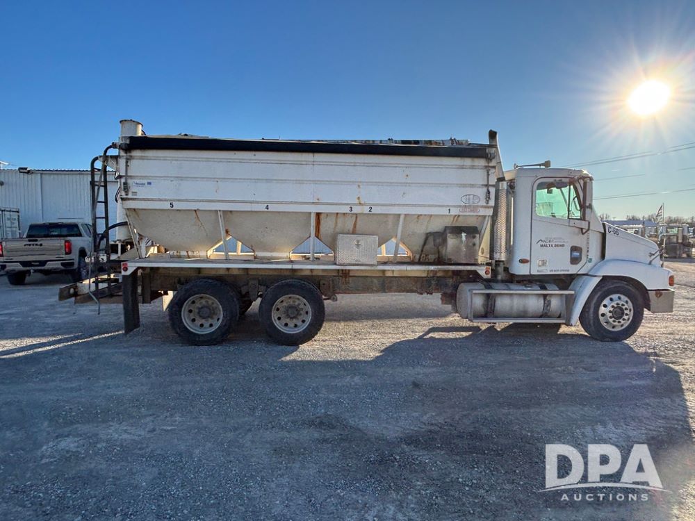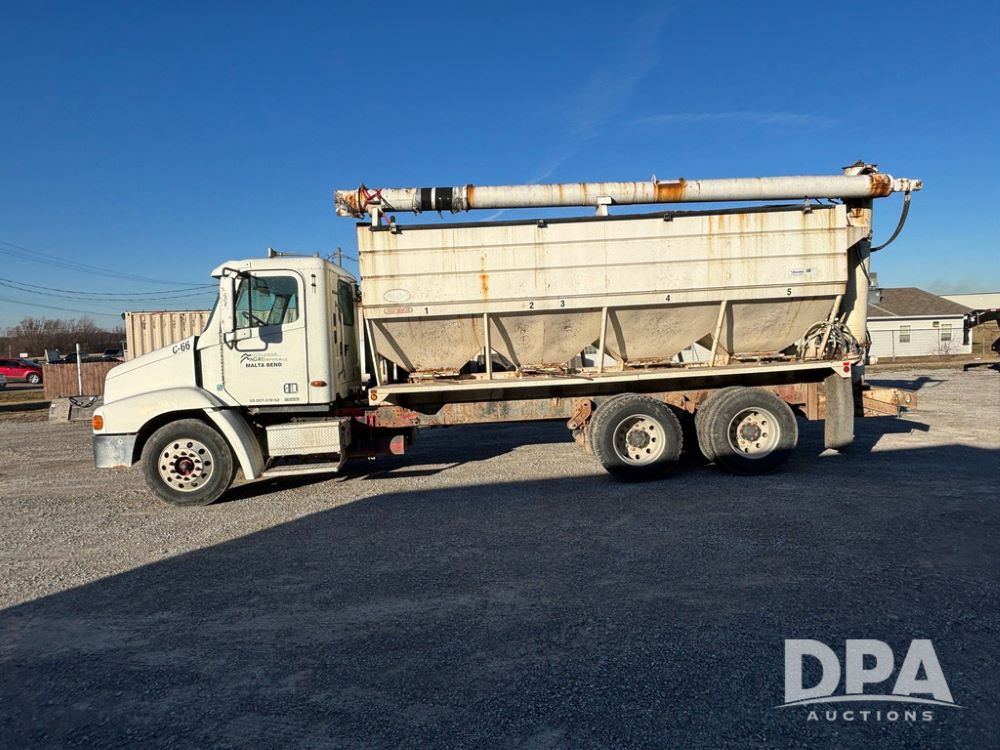 2002 Freightliner Century Class S/T Dry Tender Truck (GP12470, Unit C66), Cummins ISM diesel engine, 10 speed transmission, heat, Am/Fm radio, tandem axle, spring suspension, Ray-Man Field Charger Model 18CHIIFB dry tender box (S/N 10111783), 18 ton capacity, 5 compartment, overhead hydraulic auger, manual roll tarp, single fuel tank, single exhaust, 275/80R22.5 tires, approx. 228" wheelbase, GVWR 52,000 pounds, shows 674,894 miles.