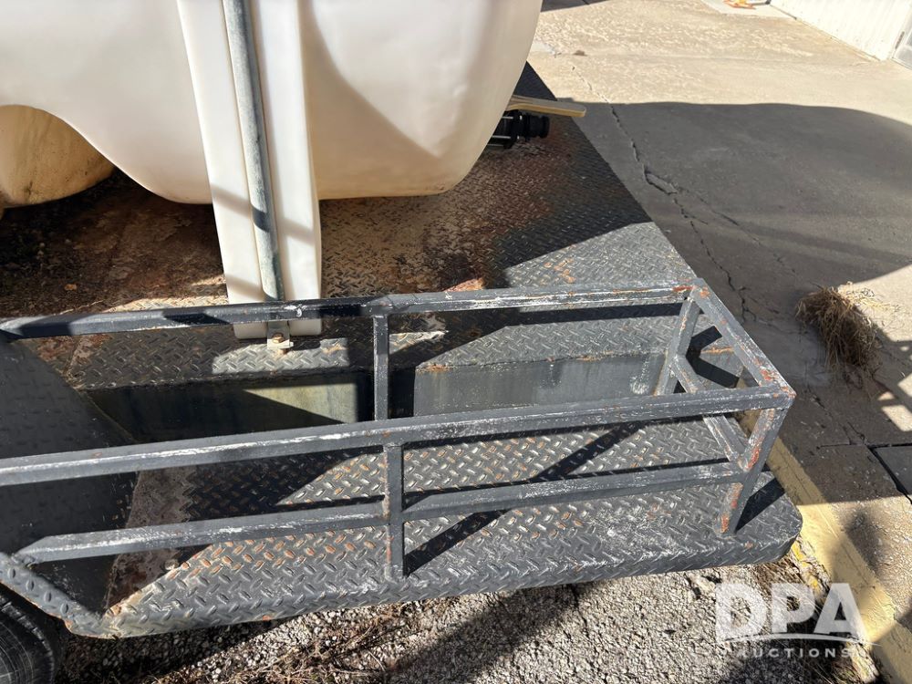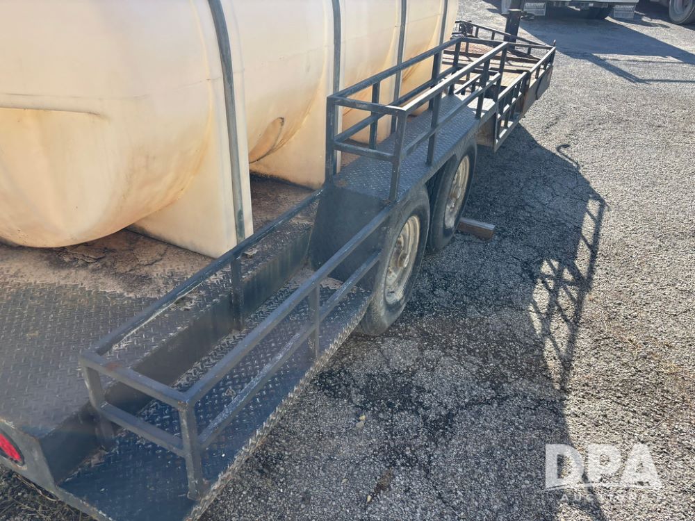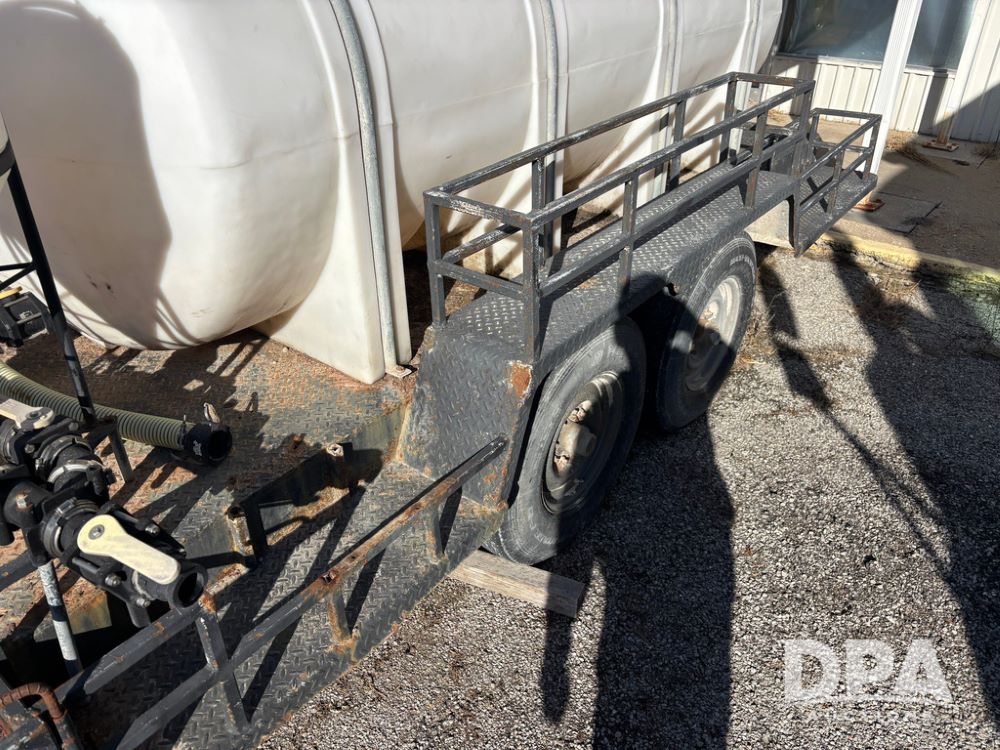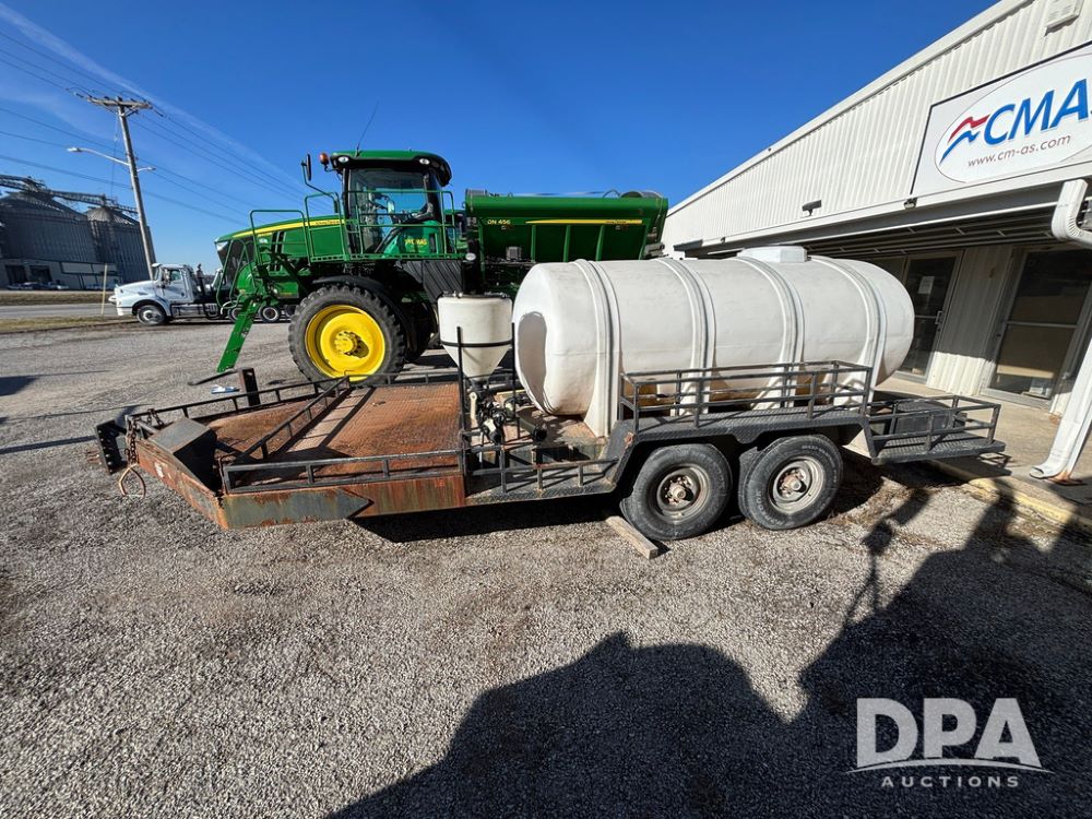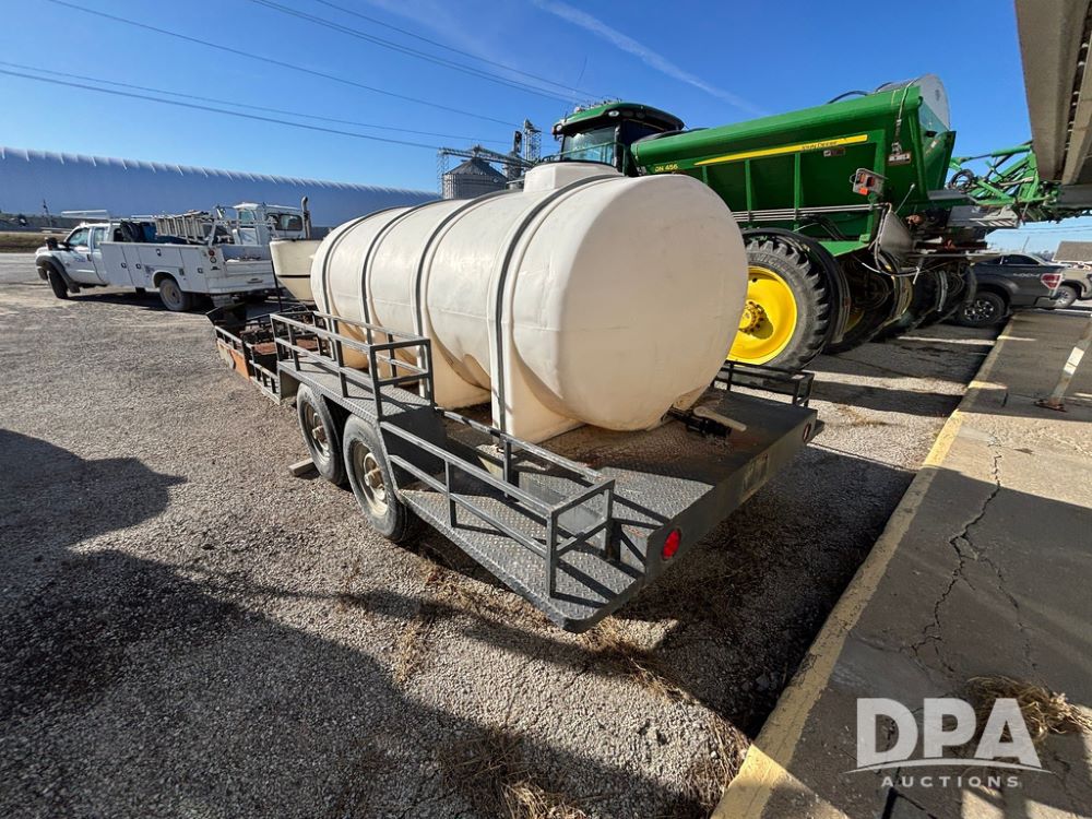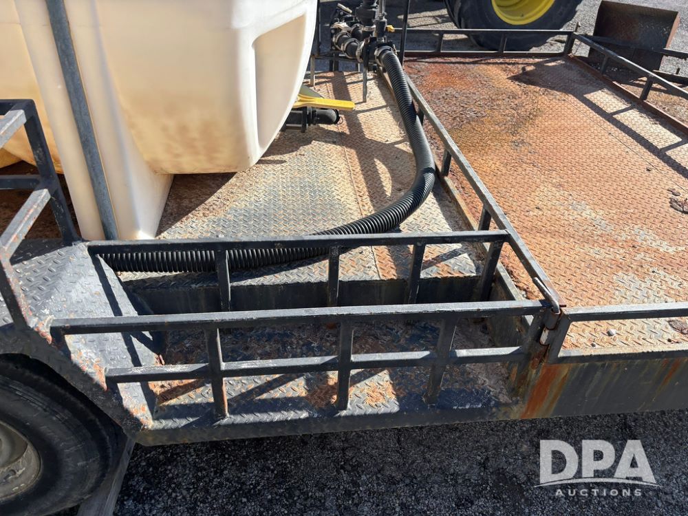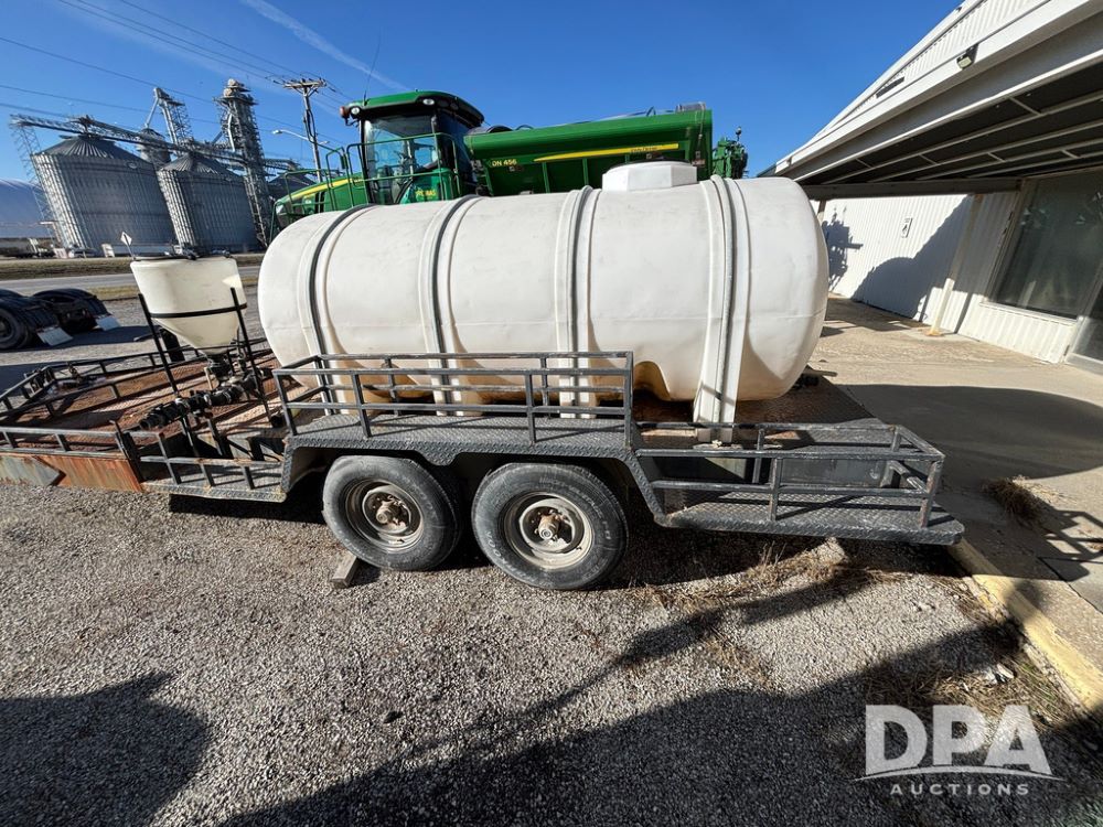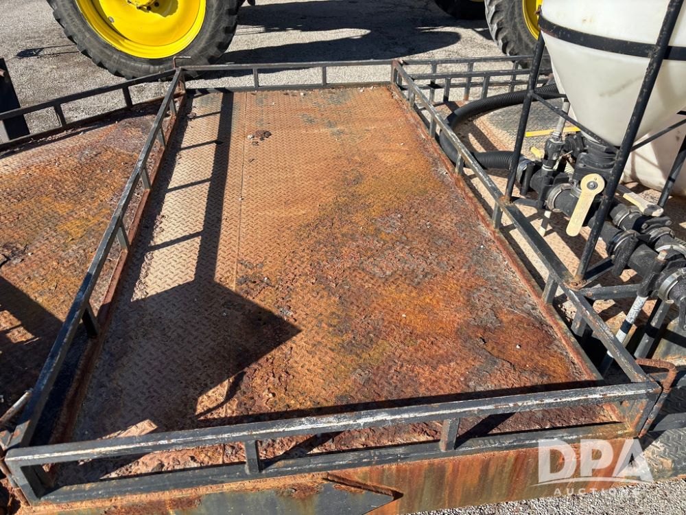 1991 Homemade Liquid Trailer (GP12478, Unit M9), tandem axle, spring suspension, front chemical platform, 1,250 gallon poly flat bottom liquid tank, 16 gallon poly cone bottom inductor tank, 7.50R16 tires.