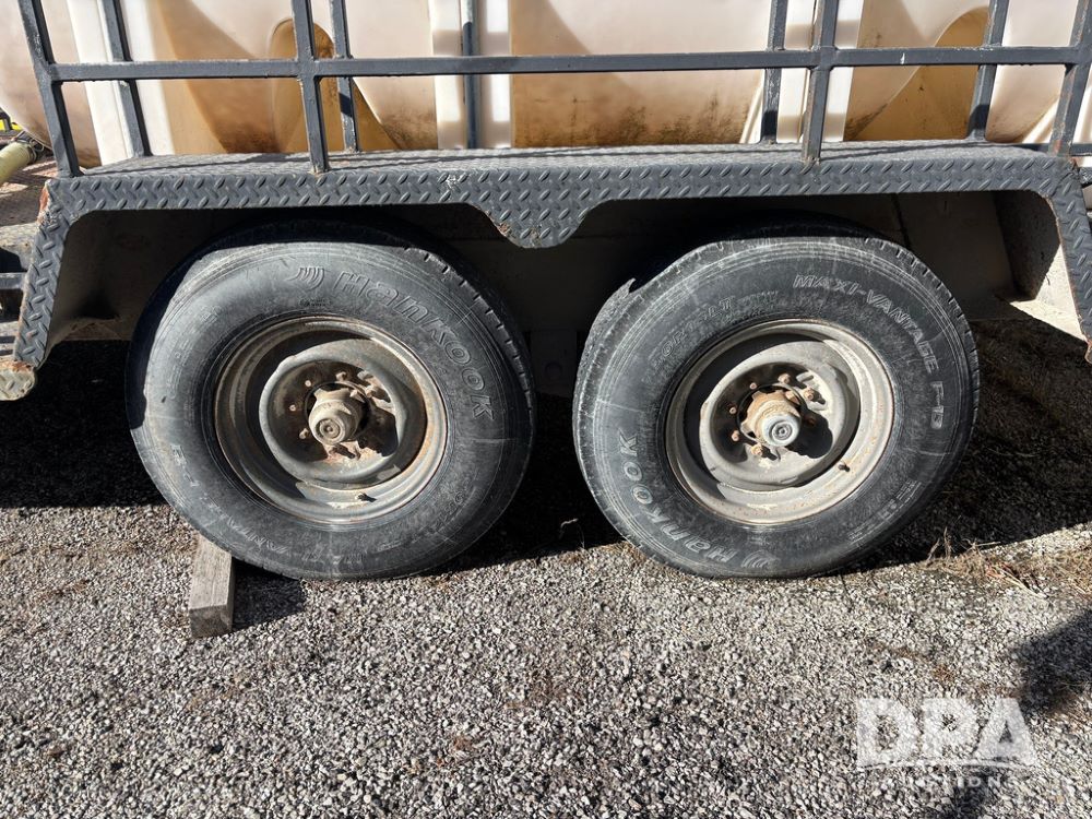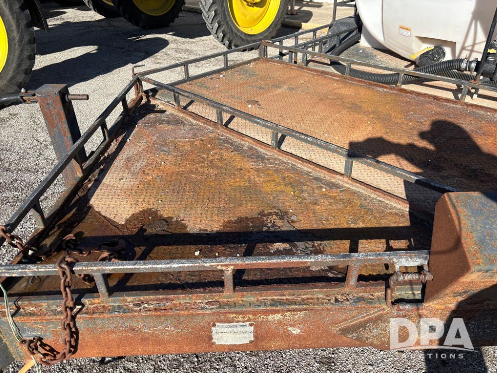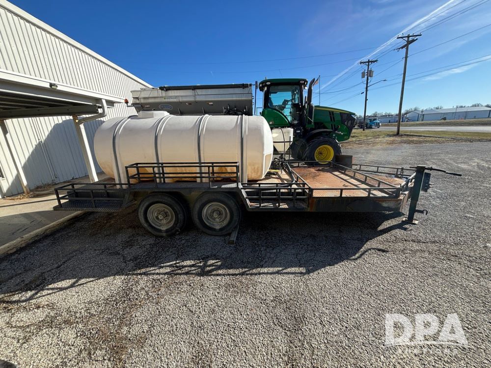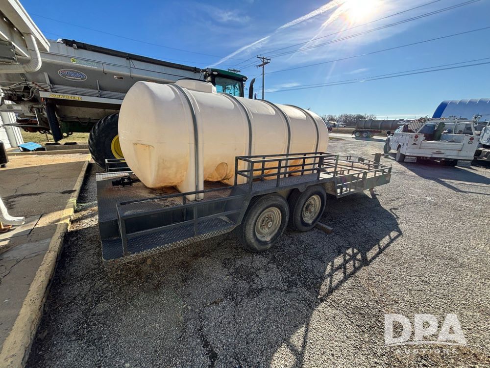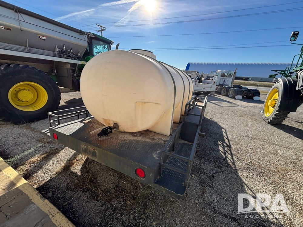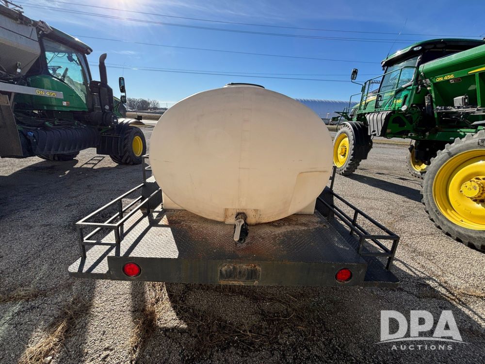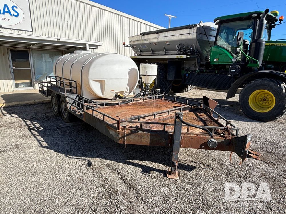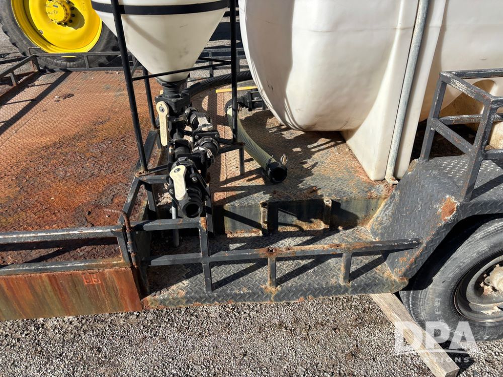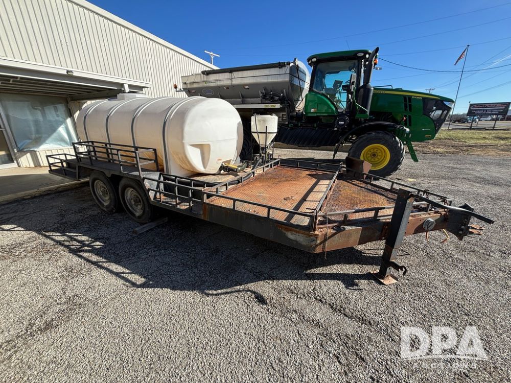 1991 Homemade Liquid Trailer (GP12478, Unit M9), tandem axle, spring suspension, front chemical platform, 1,250 gallon poly flat bottom liquid tank, 16 gallon poly cone bottom inductor tank, 7.50R16 tires.