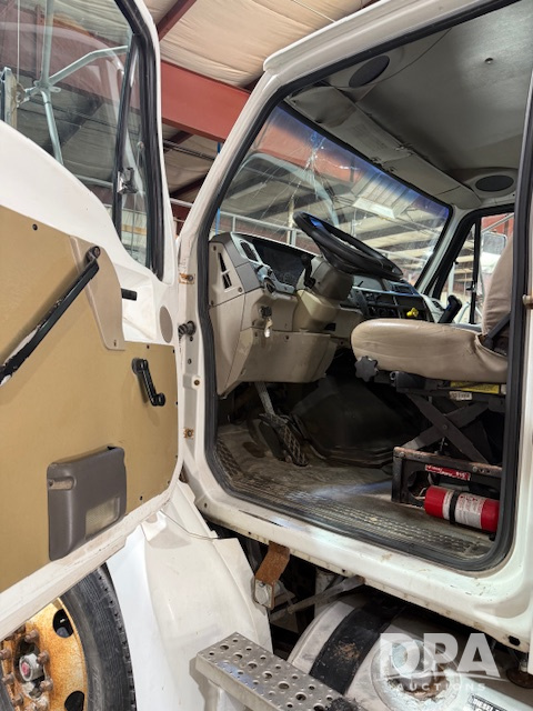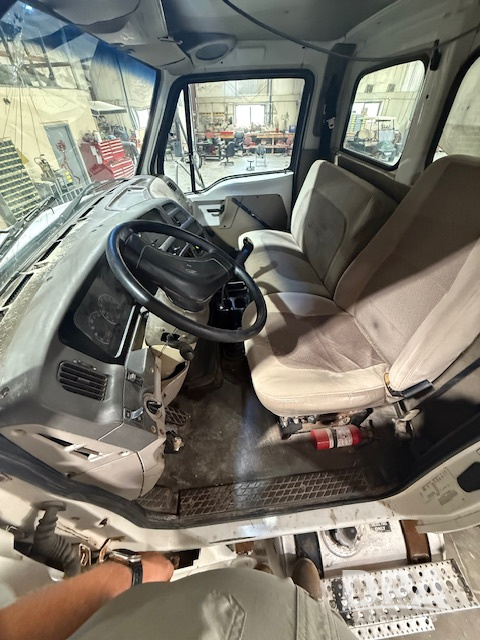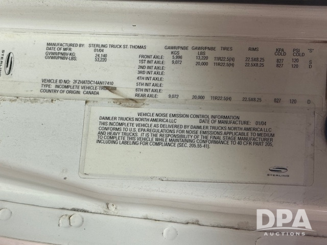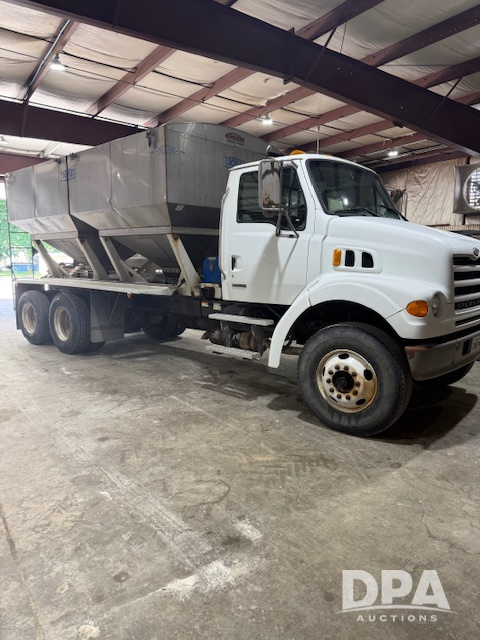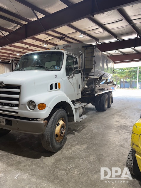 2004 Sterling Dry Tender Truck (PZ14336, Unit 28), Cat C7 diesel engine, Eaton Fuller 8LL transmission, air conditioning, heat, Am/Fm radio, tandem axle, full screw, Doyle 16 ton dry tender box, side discharge auger, all hydraulic, roll over tarp, 11R22.5 tires, shows 185,455 miles.