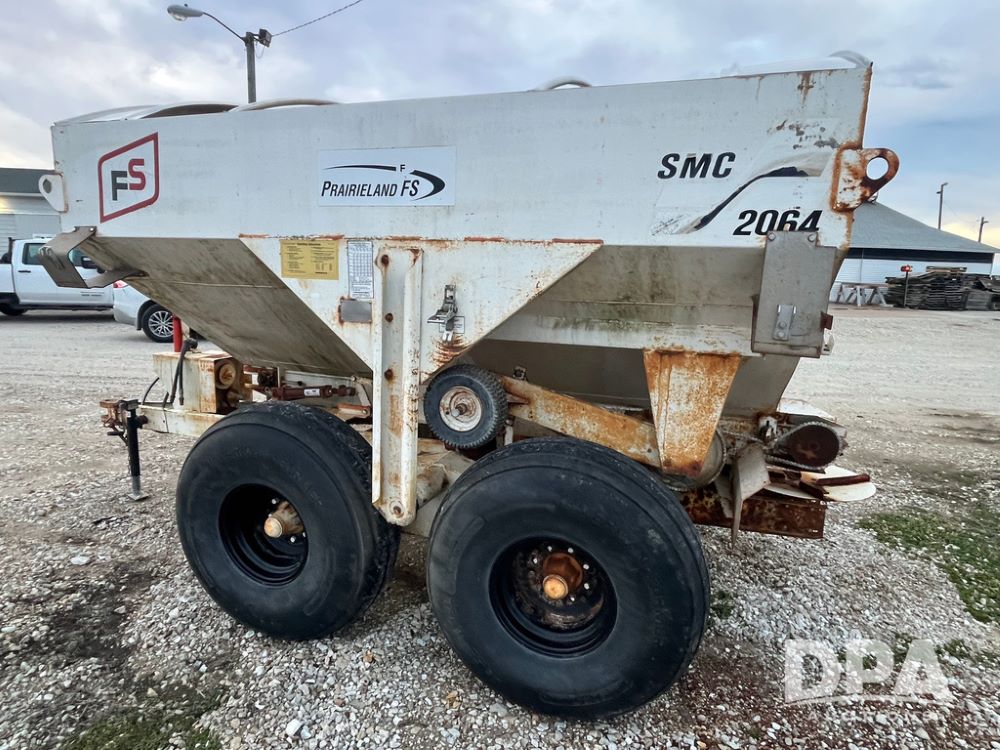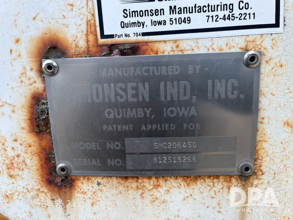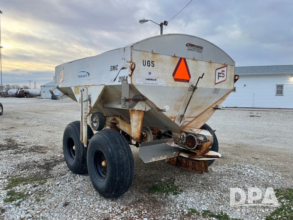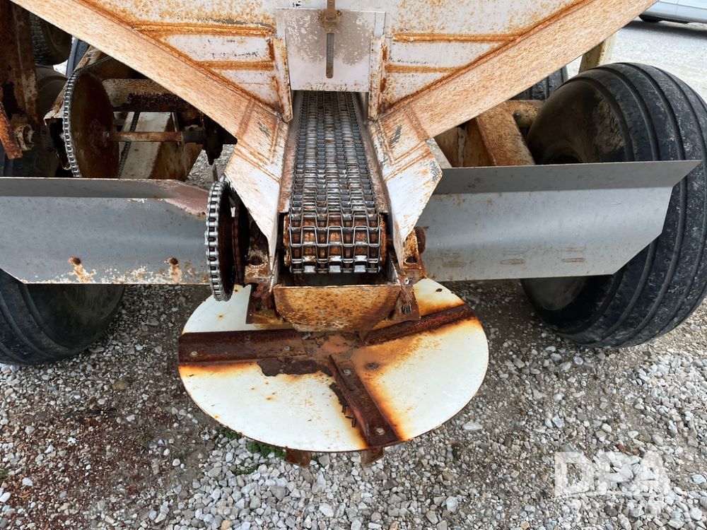 Simonsen Dry Spreader (JN3669, Unit U65), Simonsen 2064 dry spreader, single spinner, PTO, tandem axle, 16.5L-16.1 flotation tires.