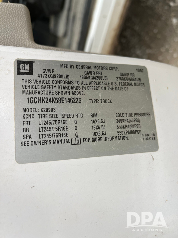 2008 Chevrolet 2500HD Pickup (JN3688, Unit 599), 4x4, Vortec 6.0L gas engine, automatic transmission, air conditioning, heat, Am/Fm CD radio, cruise control, power windows & locks, rear hitch, LT245/75R16 tires, shows 191,171 miles.