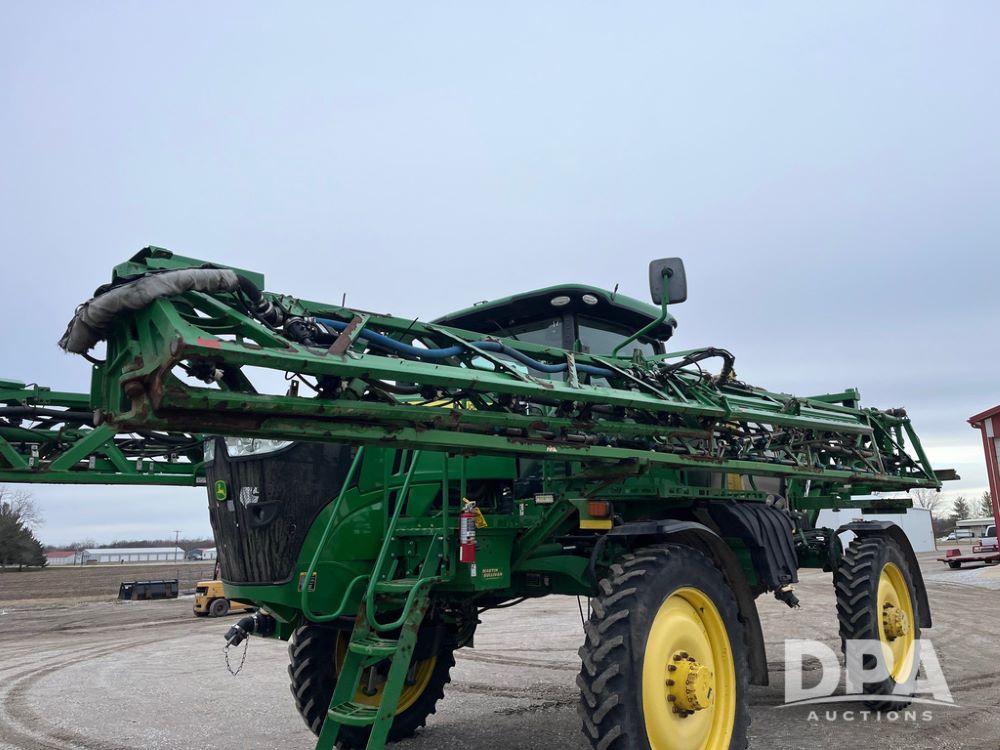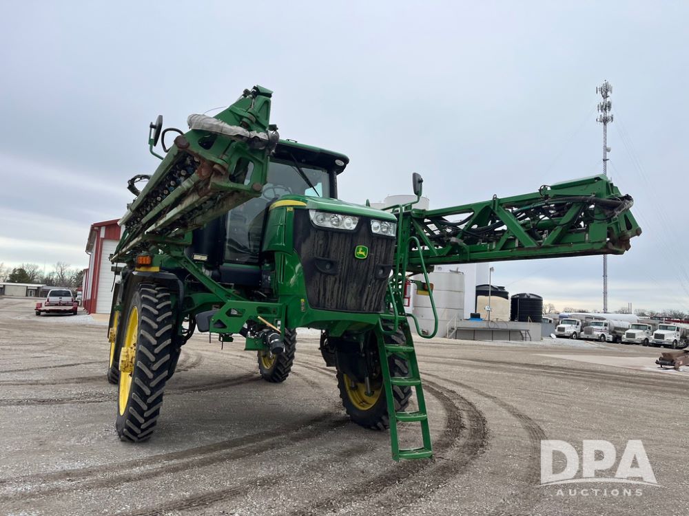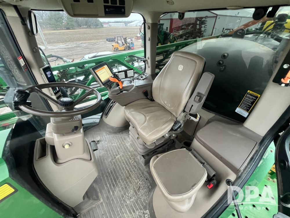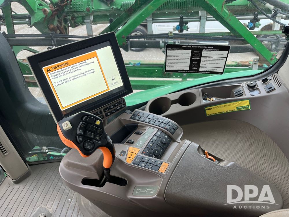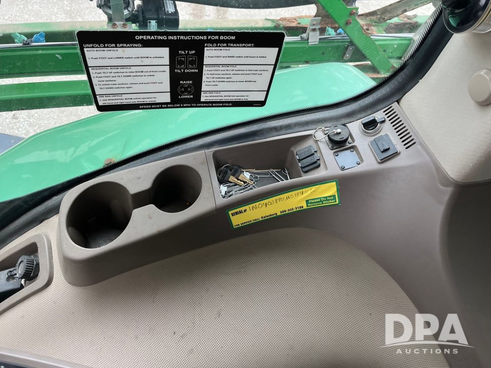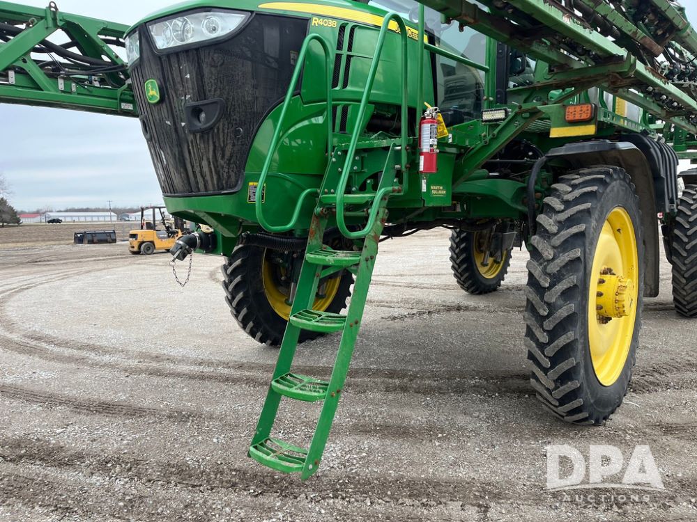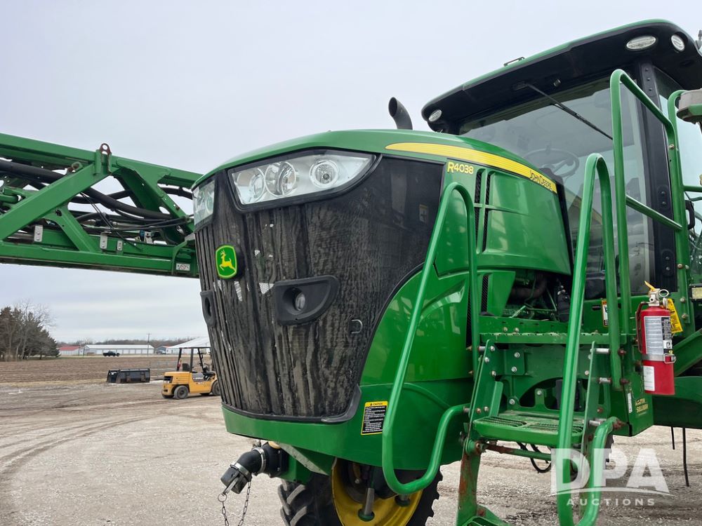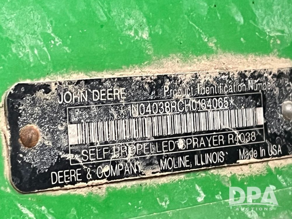 2018 John Deere R4038 Sprayer (JN3691, Unit 1021), John Deere diesel engine (S/N RG6090U043778), hydrostatic transmission, air conditioning, heat, Am/Fm CD radio, leather seat, buddy seat, 1000 gallon stainless steel liquid system, 120' boom, back poly rinse tank, 2 - 50 gallon poly direct injection tanks, Raven Sidekick Pro pump, front fill, Alliance Agriflex+ 354 VF320/105R46 tires, fenders, John Deere monitor, shows 4,065 hours.