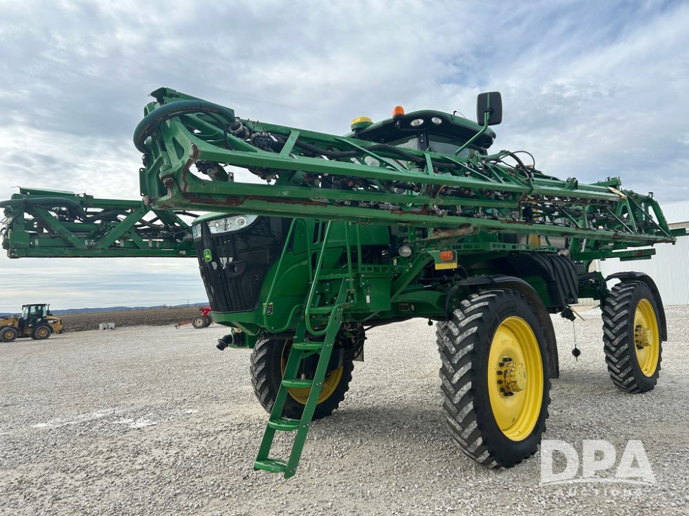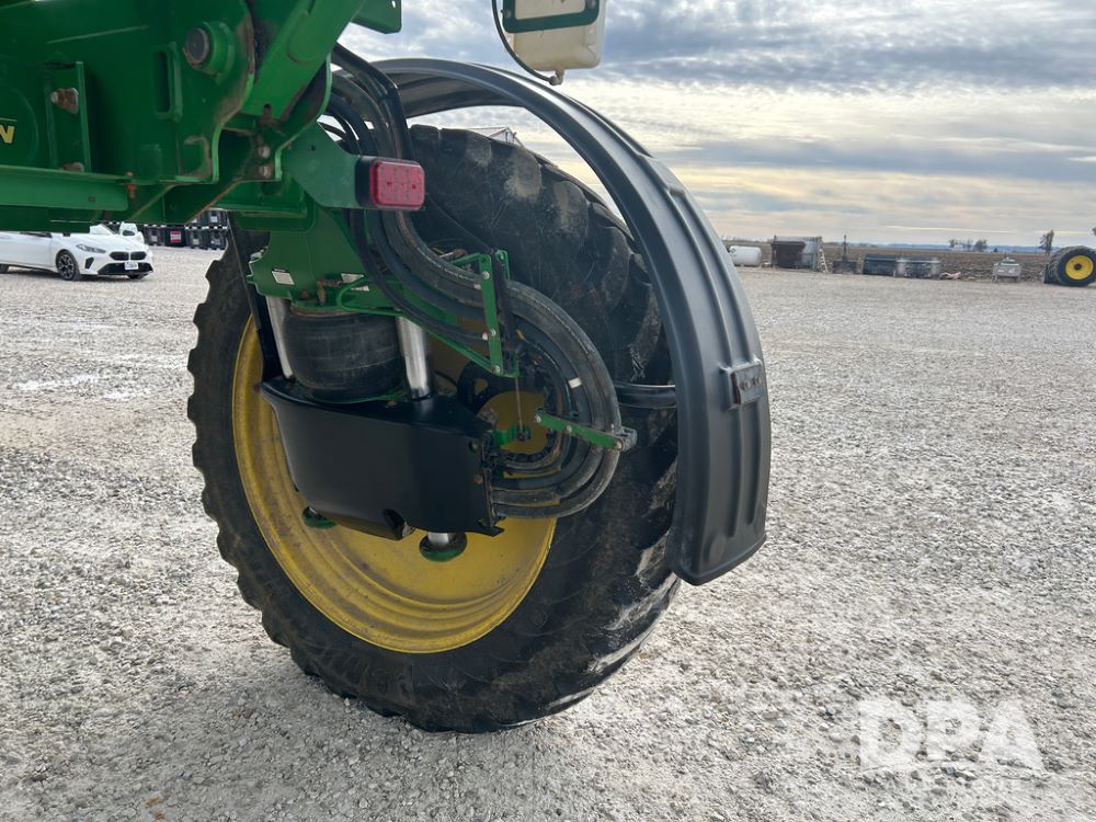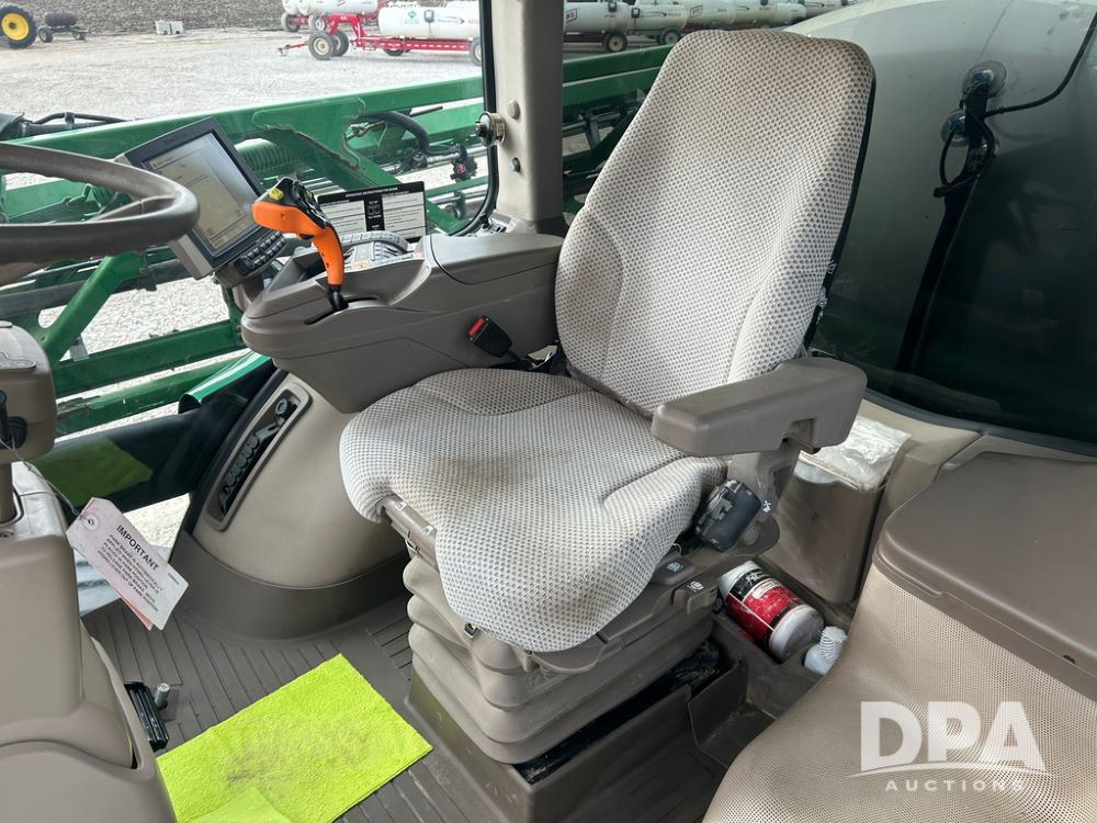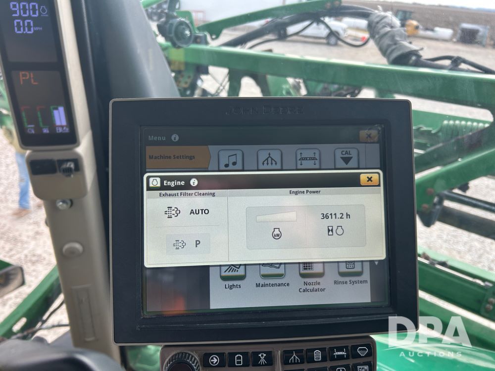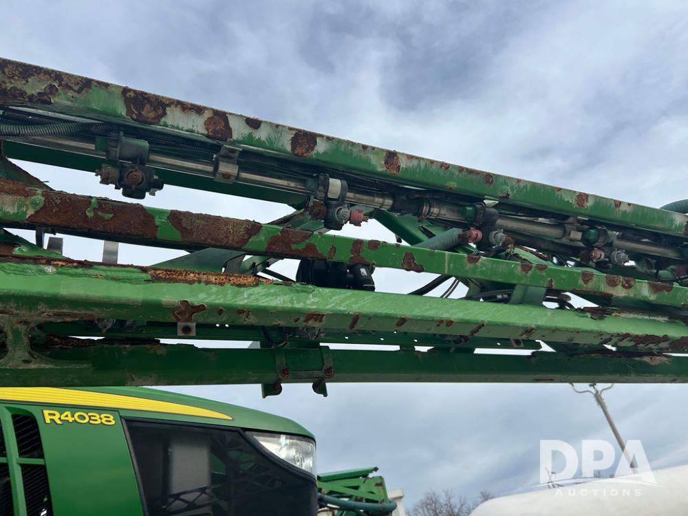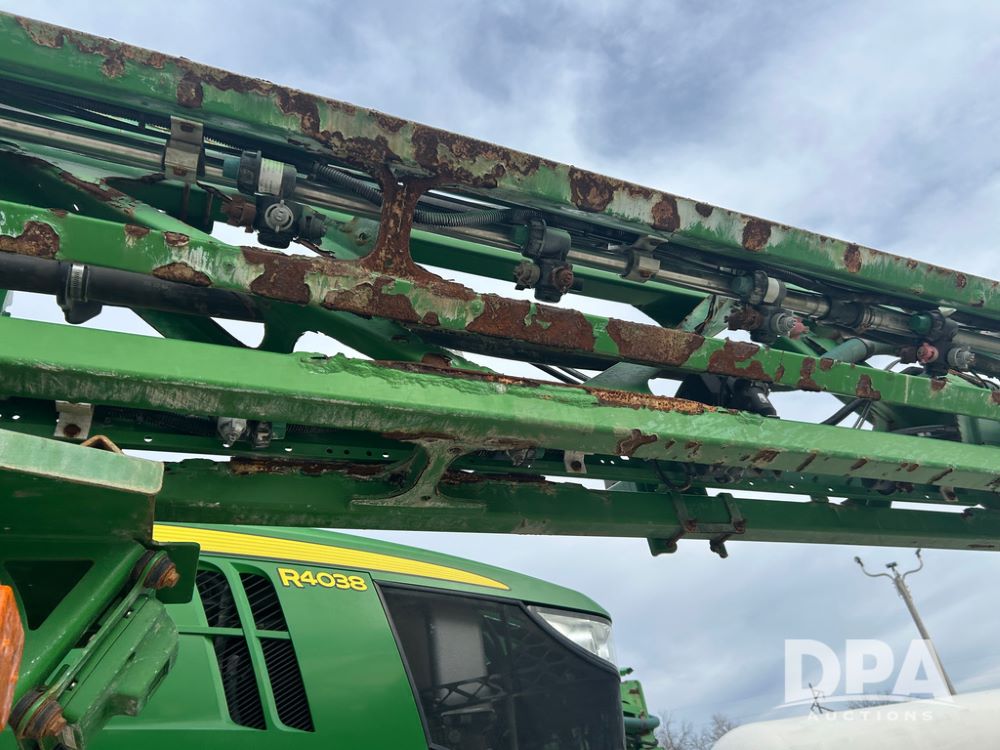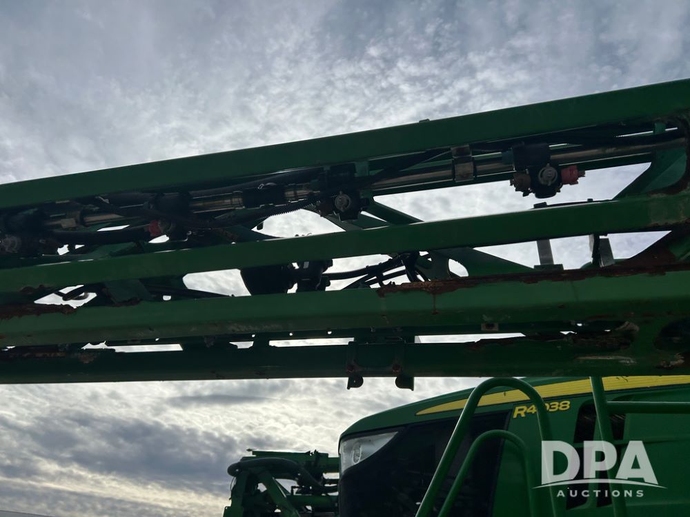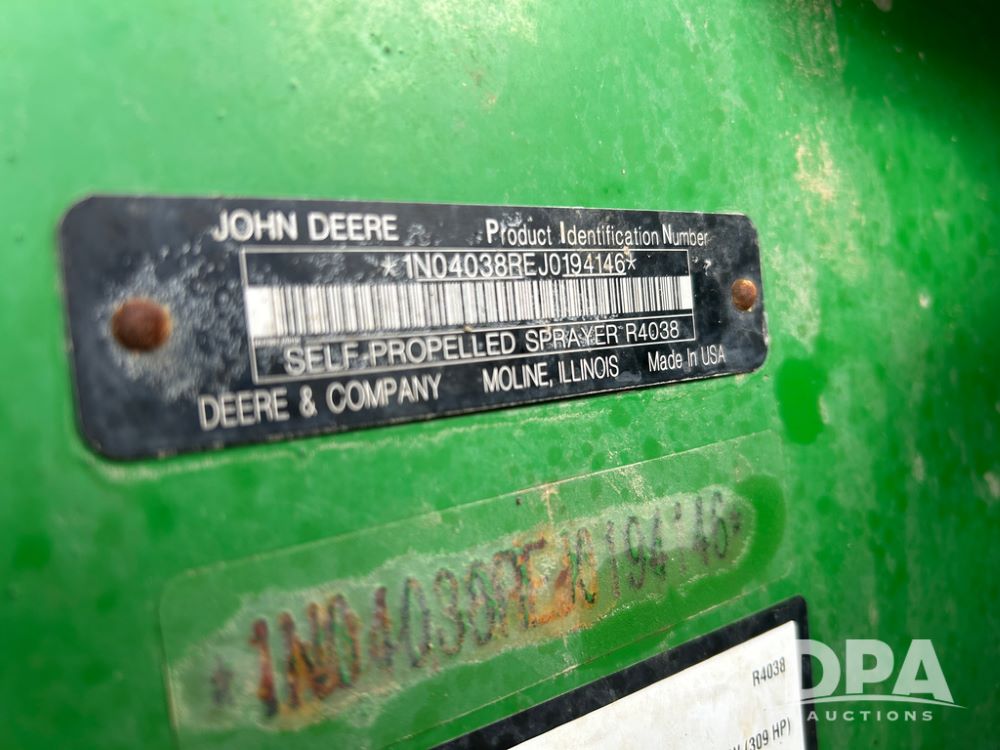 2019 John Deere R4038 Sprayer (CP1433, Unit 900), John Deere diesel engine, hydrostatic transmission, air conditioning, heat, Am/Fm radio, beacon light, 1000 gallon stainless steel liquid system, 120' boom, rear poly rinse tank, automatic solution control, front fill, Michelin Spraybib VF380/90R46 tires, fenders, John Deere StarFire 6000 globe, John Deere monitor, shows 3,611 hours.
