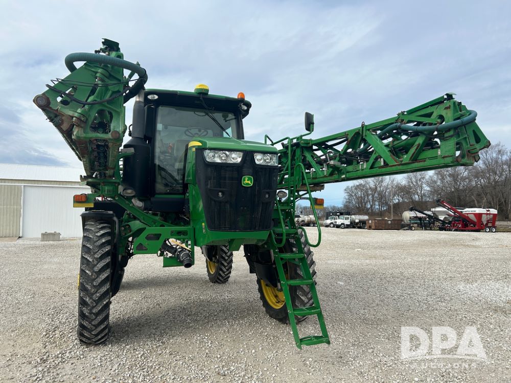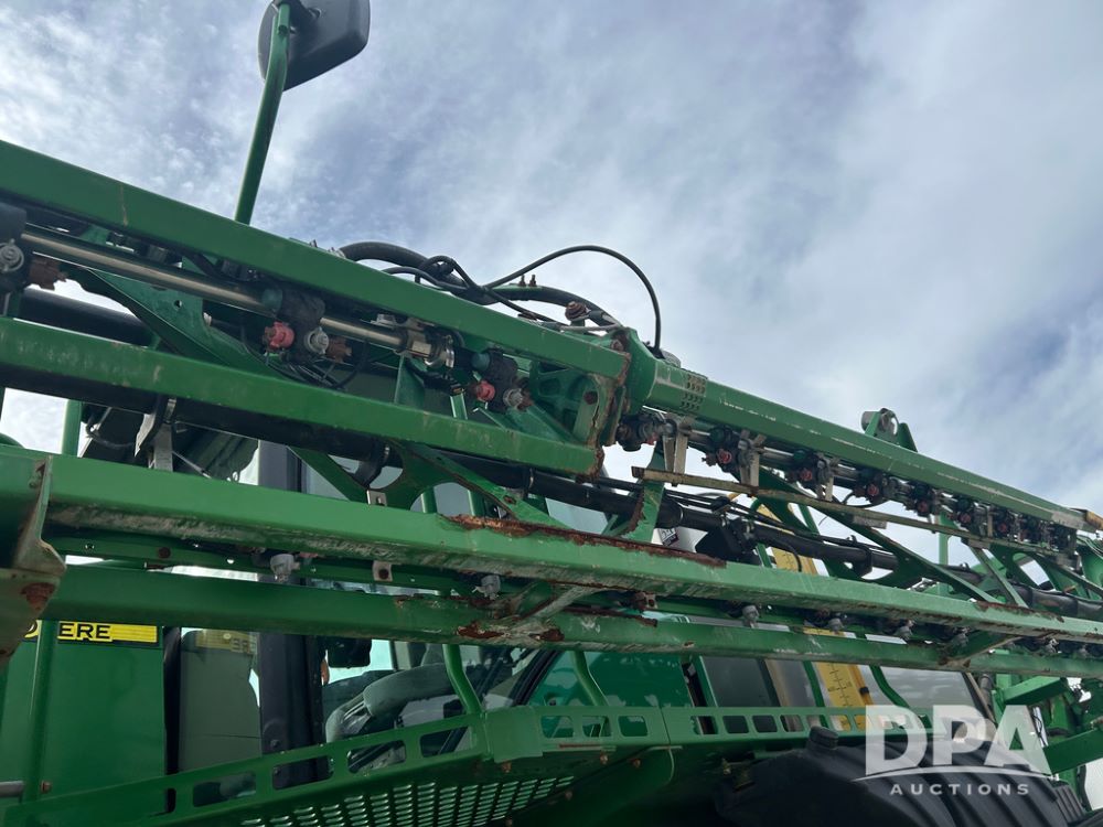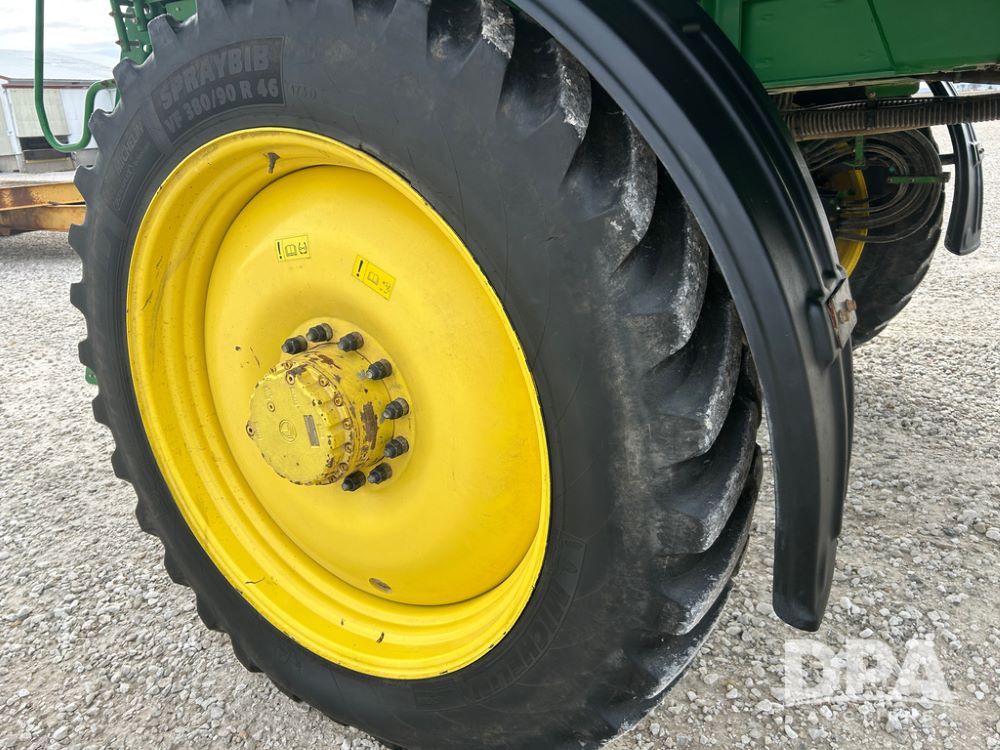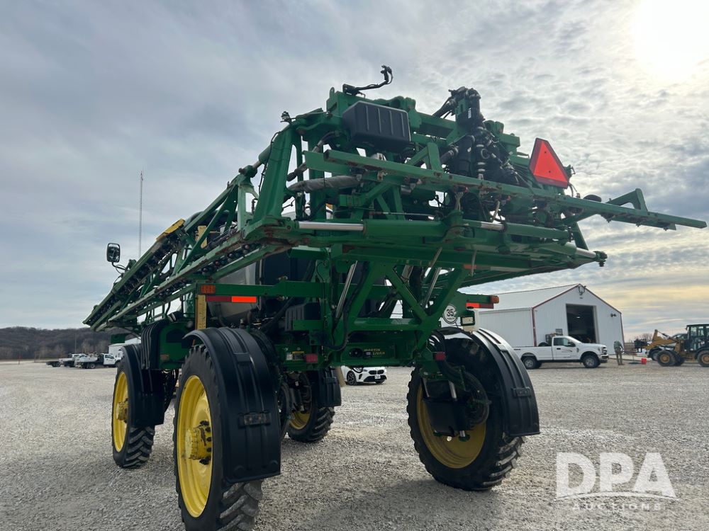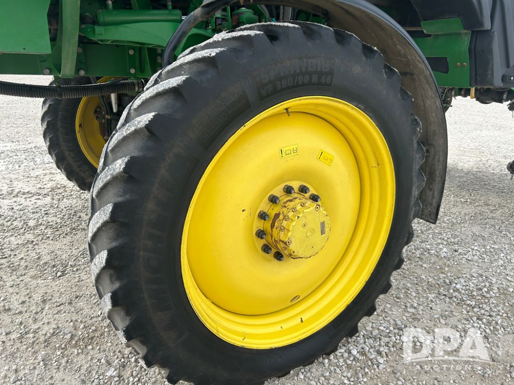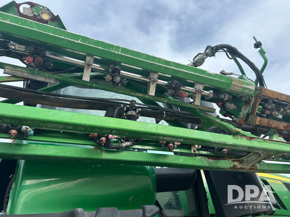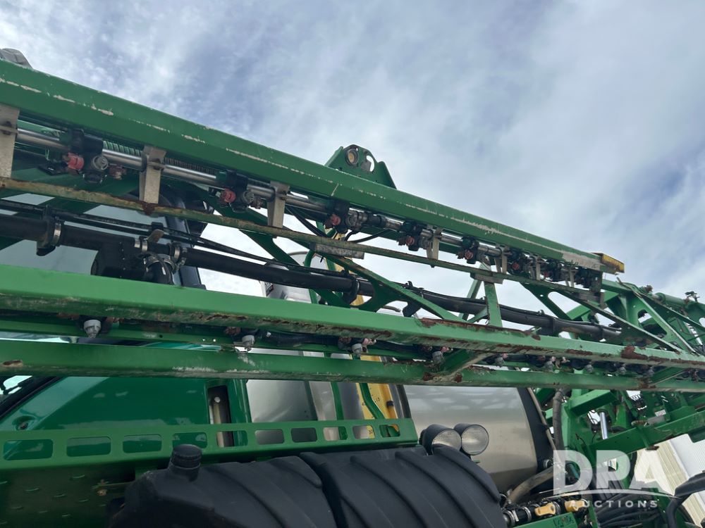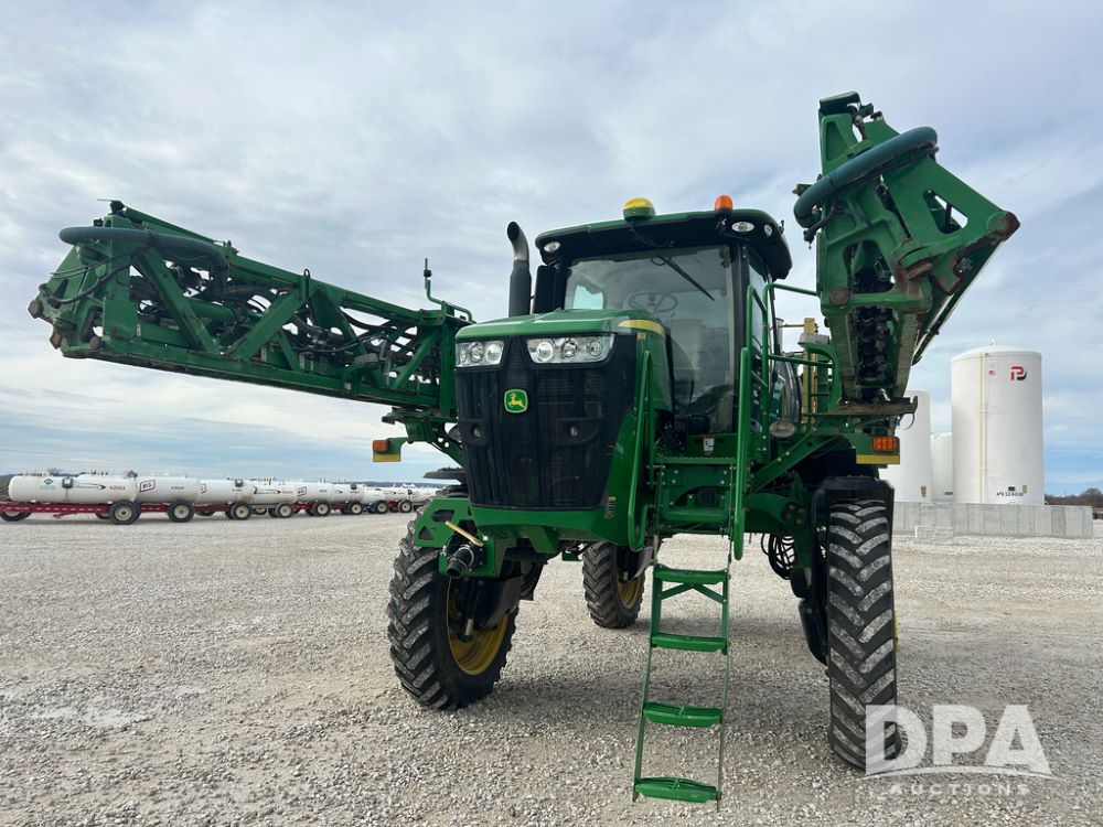 2019 John Deere R4038 Sprayer (CP1433, Unit 900), John Deere diesel engine, hydrostatic transmission, air conditioning, heat, Am/Fm radio, beacon light, 1000 gallon stainless steel liquid system, 120' boom, rear poly rinse tank, automatic solution control, front fill, Michelin Spraybib VF380/90R46 tires, fenders, John Deere StarFire 6000 globe, John Deere monitor, shows 3,611 hours.