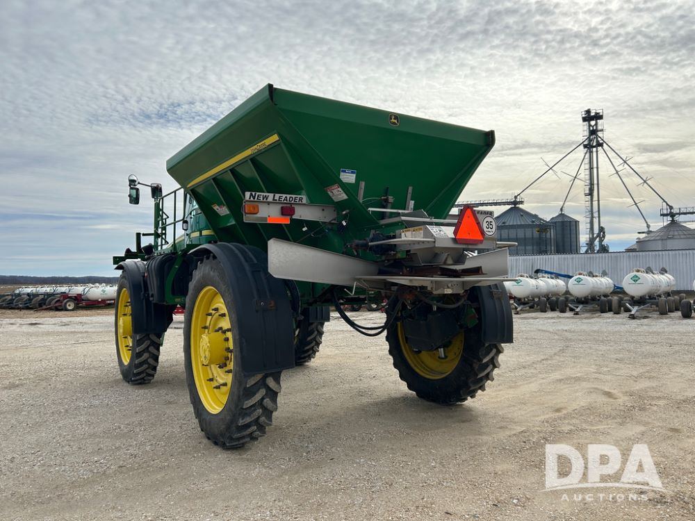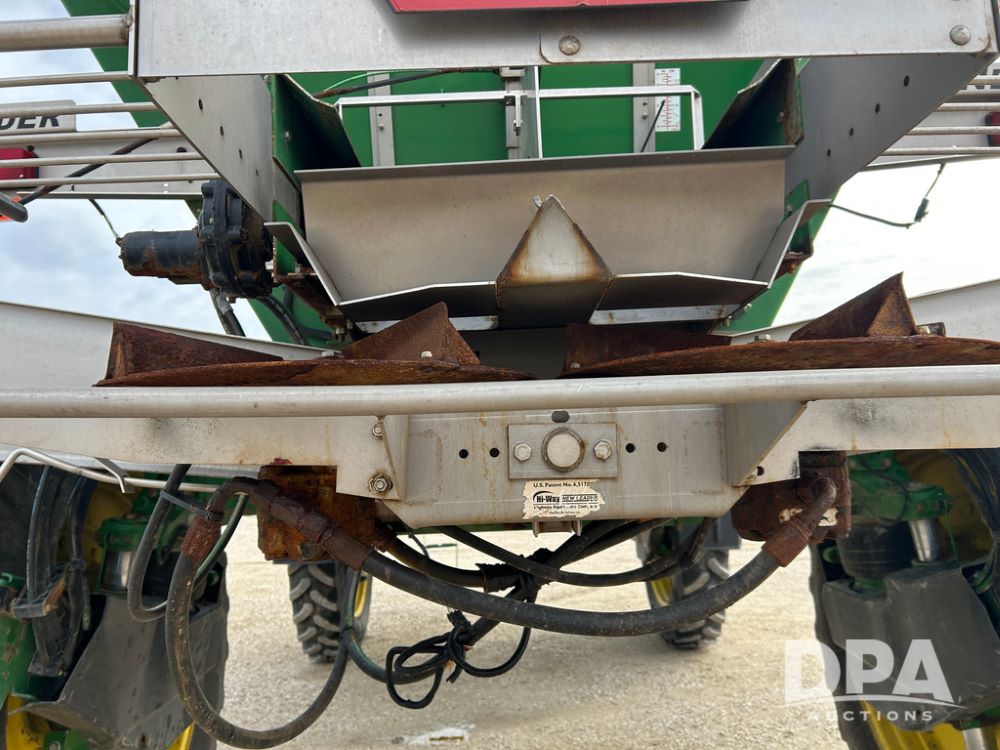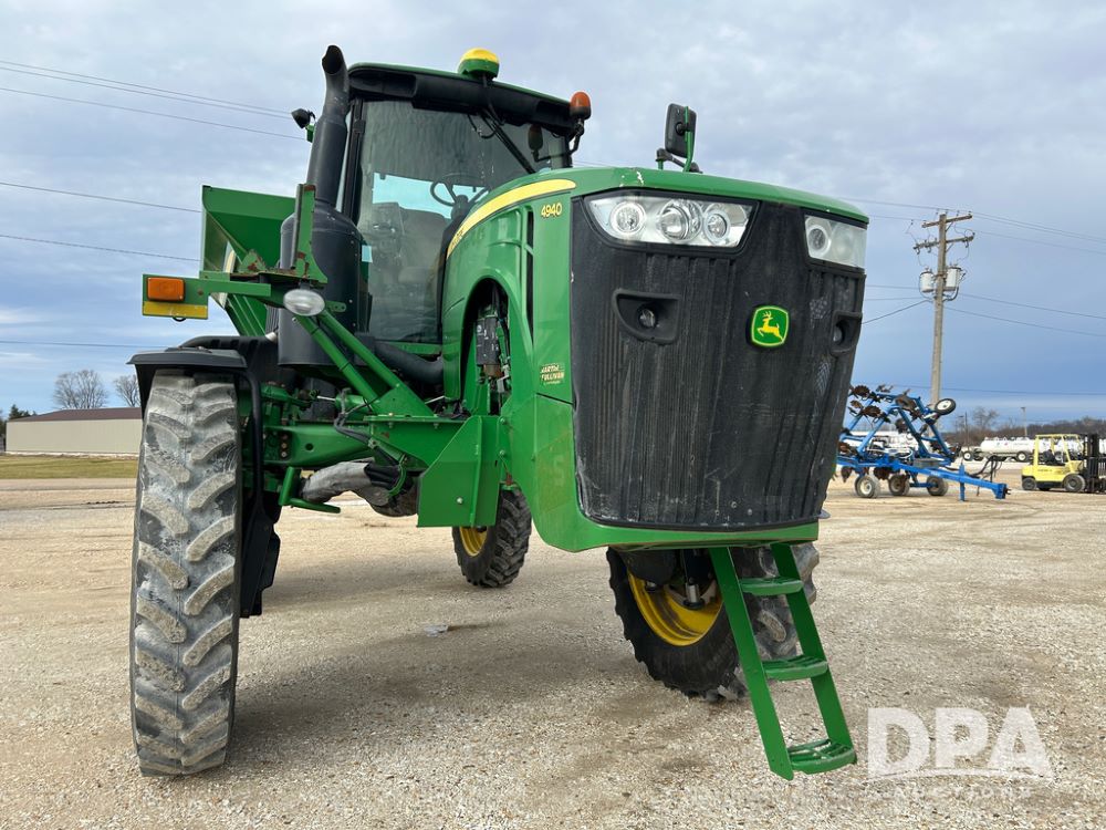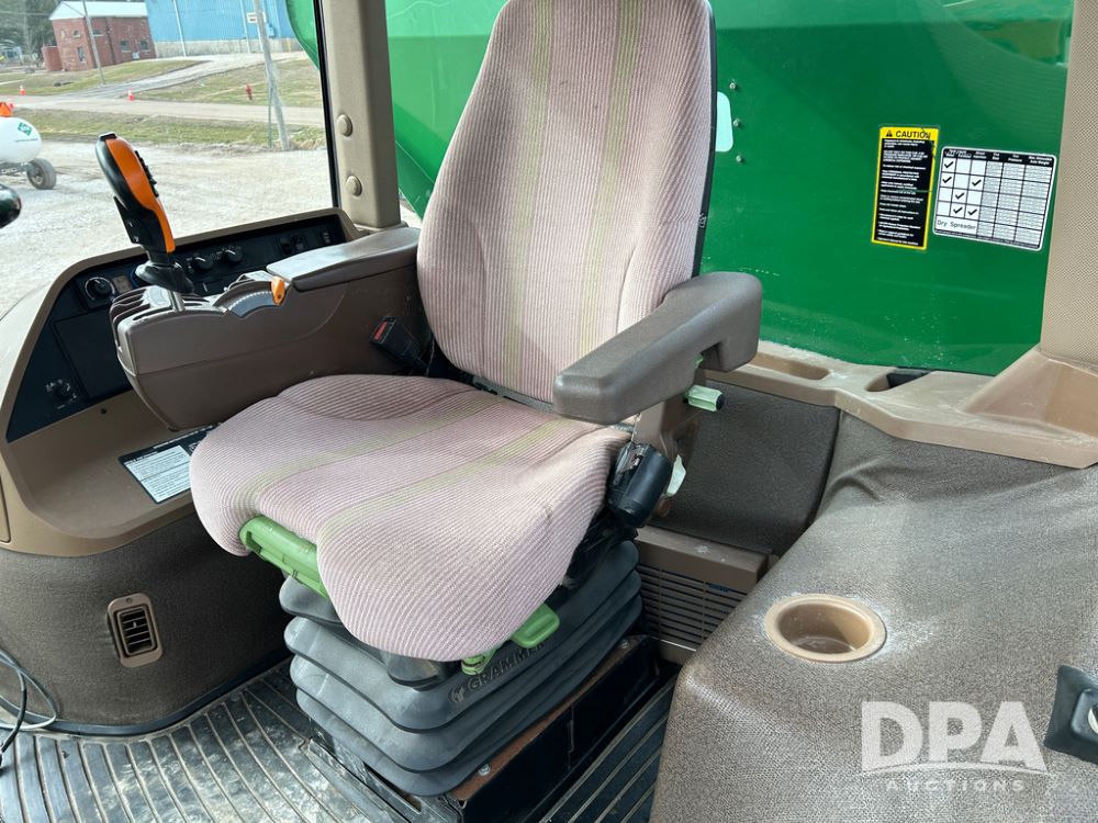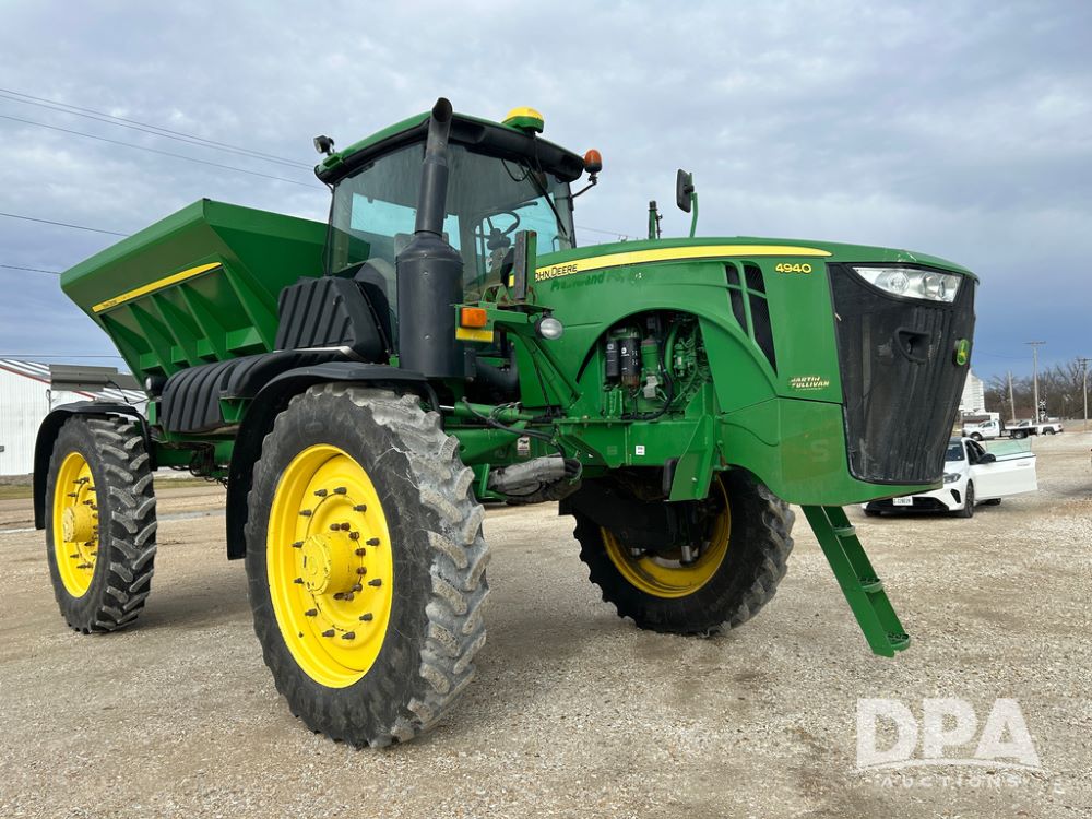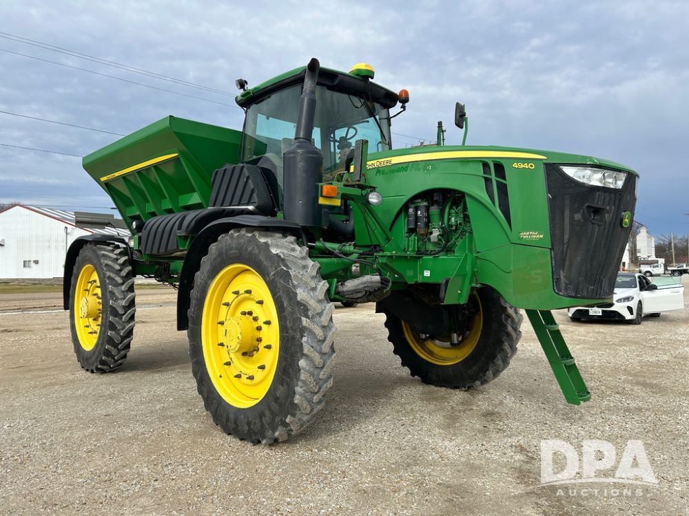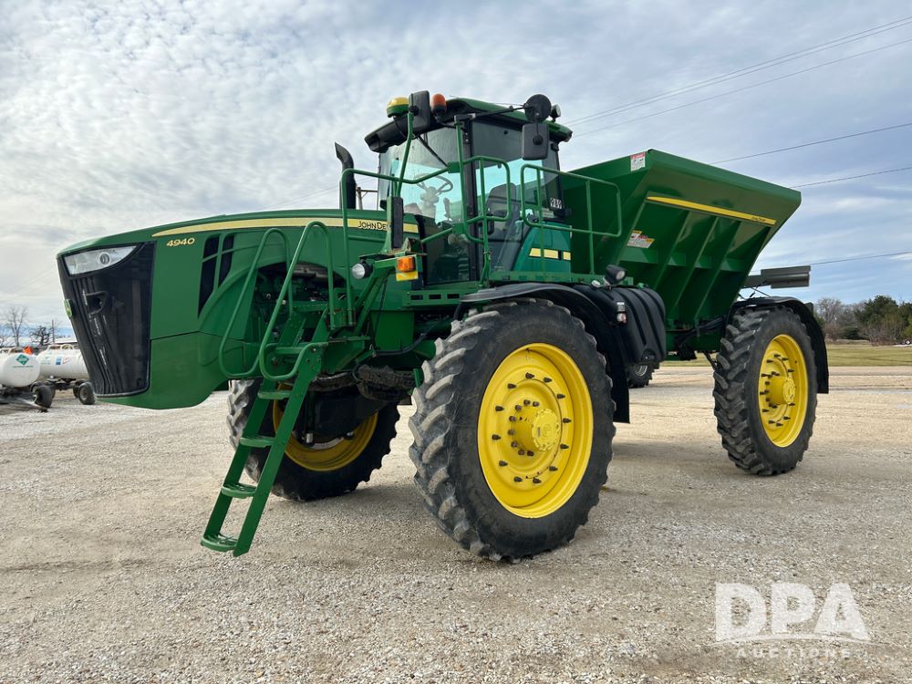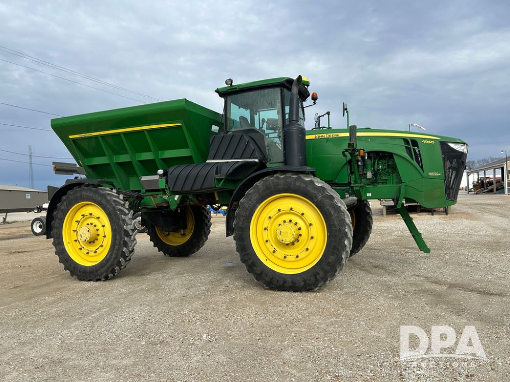 2014 John Deere 4940 Dry Machine (CP1437, Unit 989), John Deere diesel engine, hydrostatic transmission, air conditioning, heat, Am/Fm CD radio, beacon light, New Leader dry spreader box, twin spinner, all hydraulic, Firestone VF380/105R50 tires, fenders, John Deere StarFire 6000 globe, John Deer monitor, shows 4,662 hours.