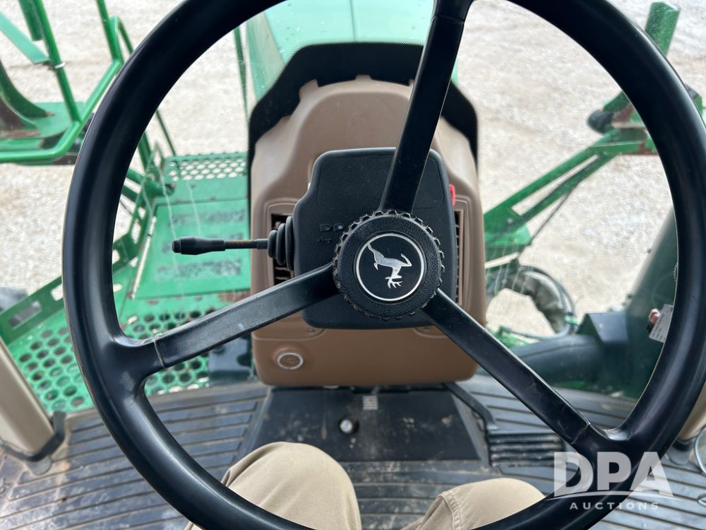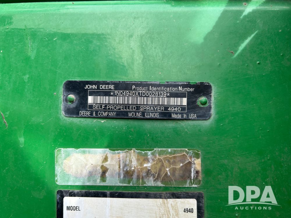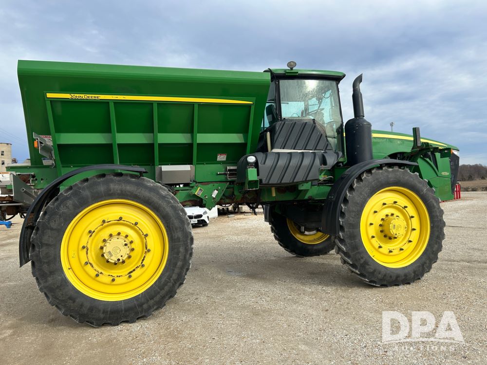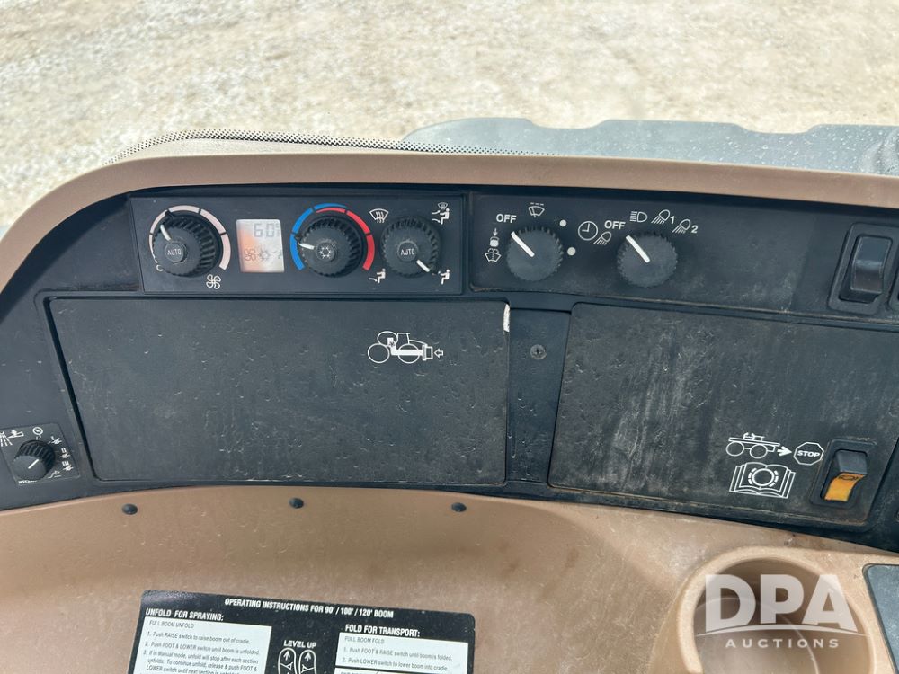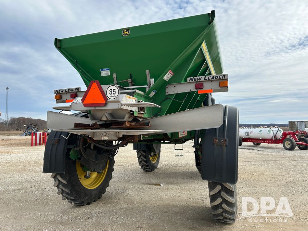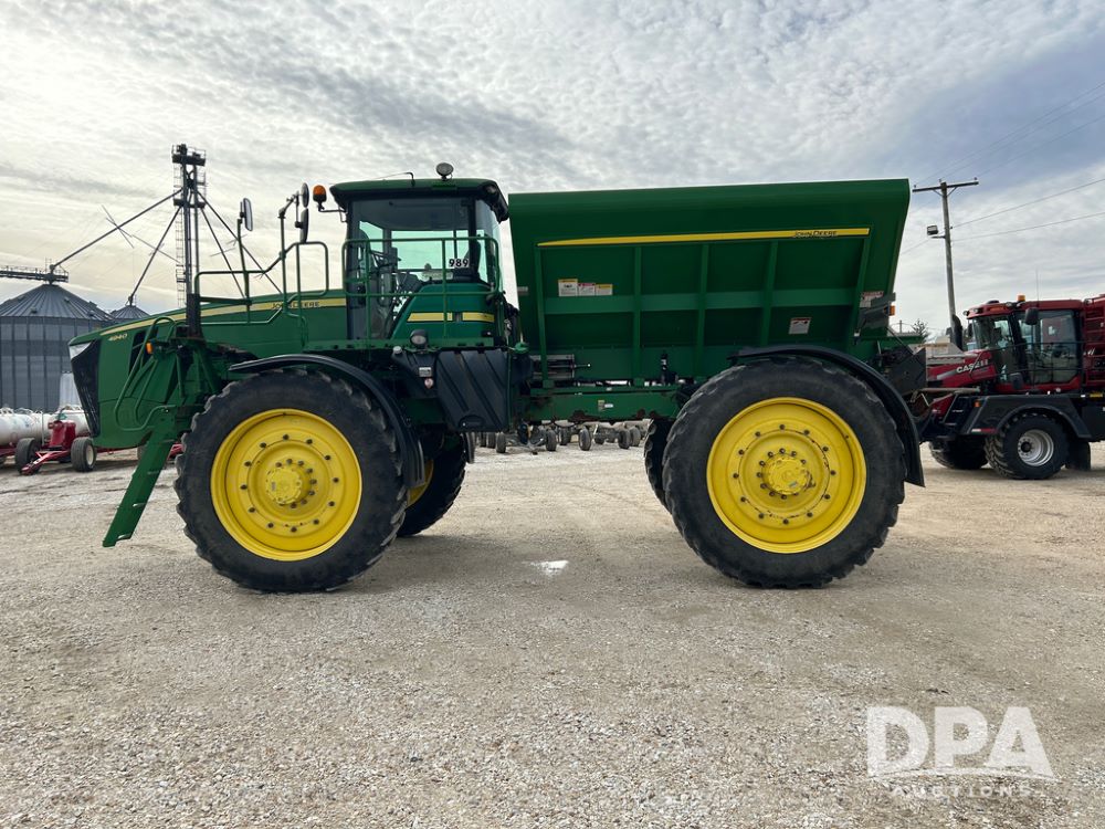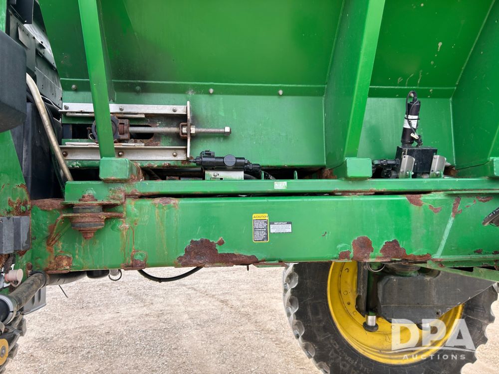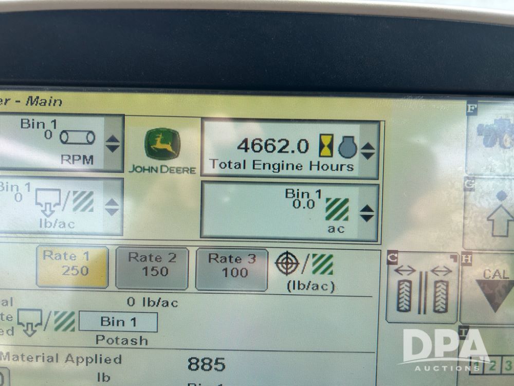 2014 John Deere 4940 Dry Machine (CP1437, Unit 989), John Deere diesel engine, hydrostatic transmission, air conditioning, heat, Am/Fm CD radio, beacon light, New Leader dry spreader box, twin spinner, all hydraulic, Firestone VF380/105R50 tires, fenders, John Deere StarFire 6000 globe, John Deer monitor, shows 4,662 hours.