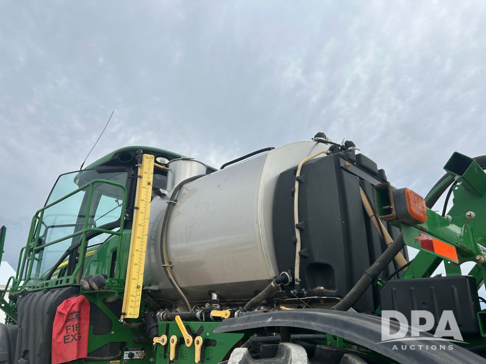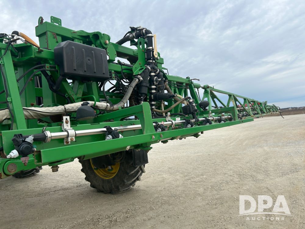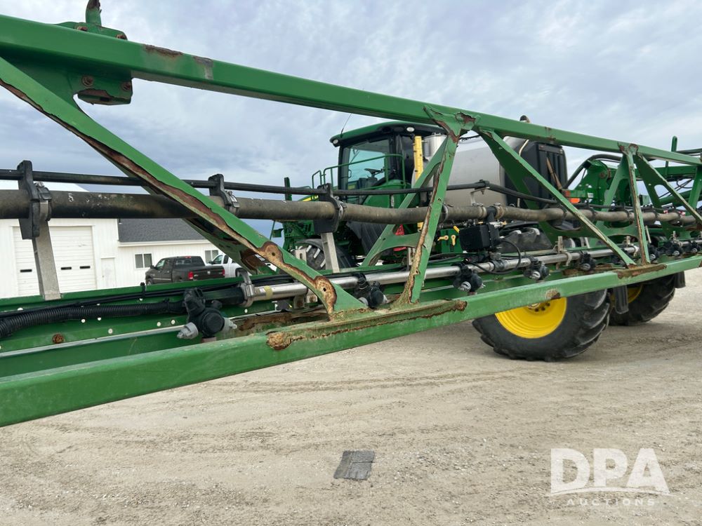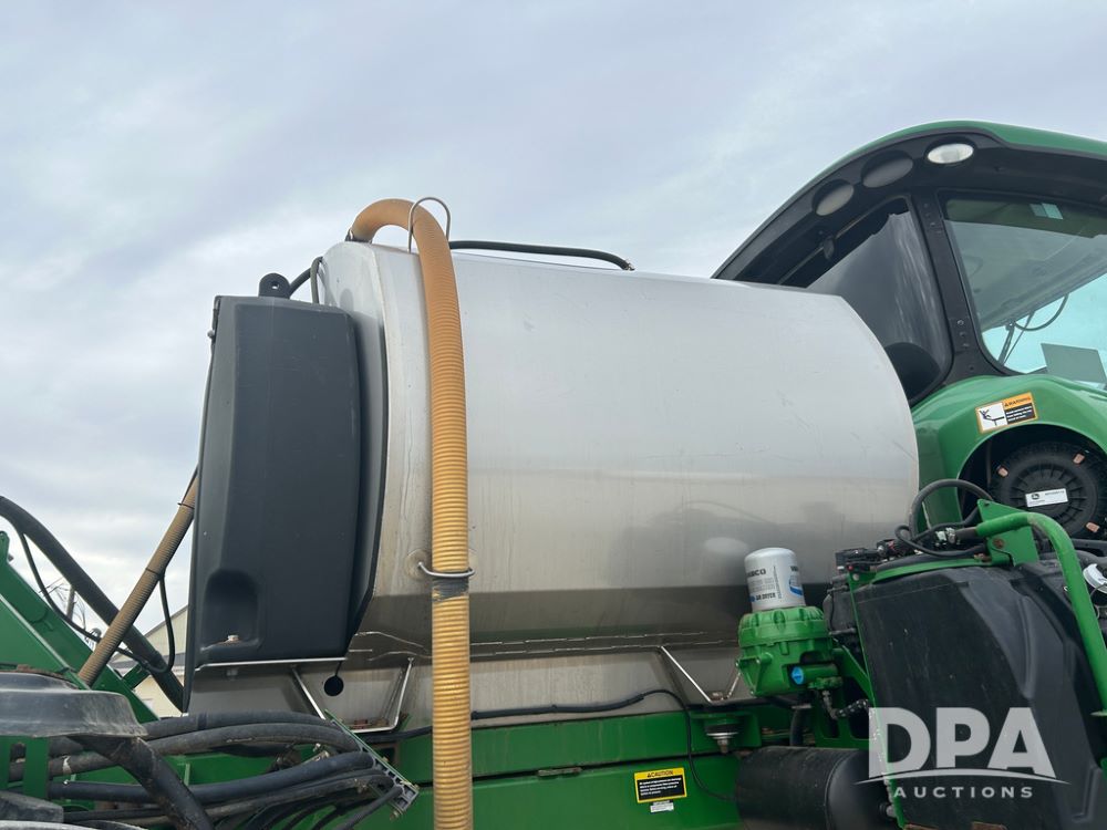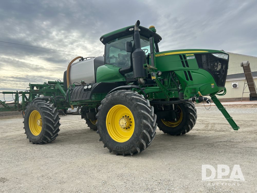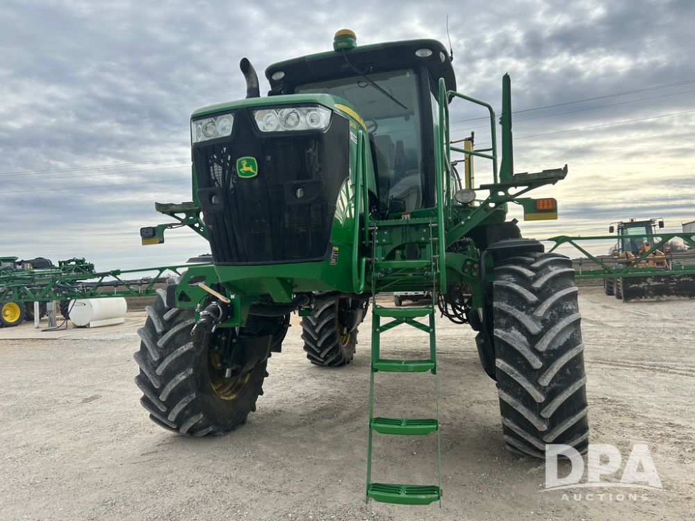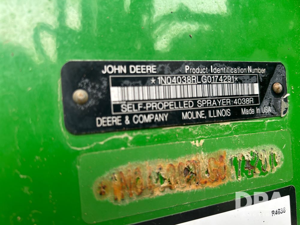 2017 John Deere R4038 Sprayer (CP1440, Unit 322), John Deere diesel engine, hydrostatic transmission, air conditioning, heat, Am/Fm CD radio, leather seat buddy seat, 1000 gallon stainless steel liquid system, 120' boom, rear poly rinse tank, front fill, Maximo 650/65R38 flotation tires, fenders, Voyager cab camera, John Deere StarFire 3000 globe, John Deere Gen 5 monitor, shows 3,534 hours.