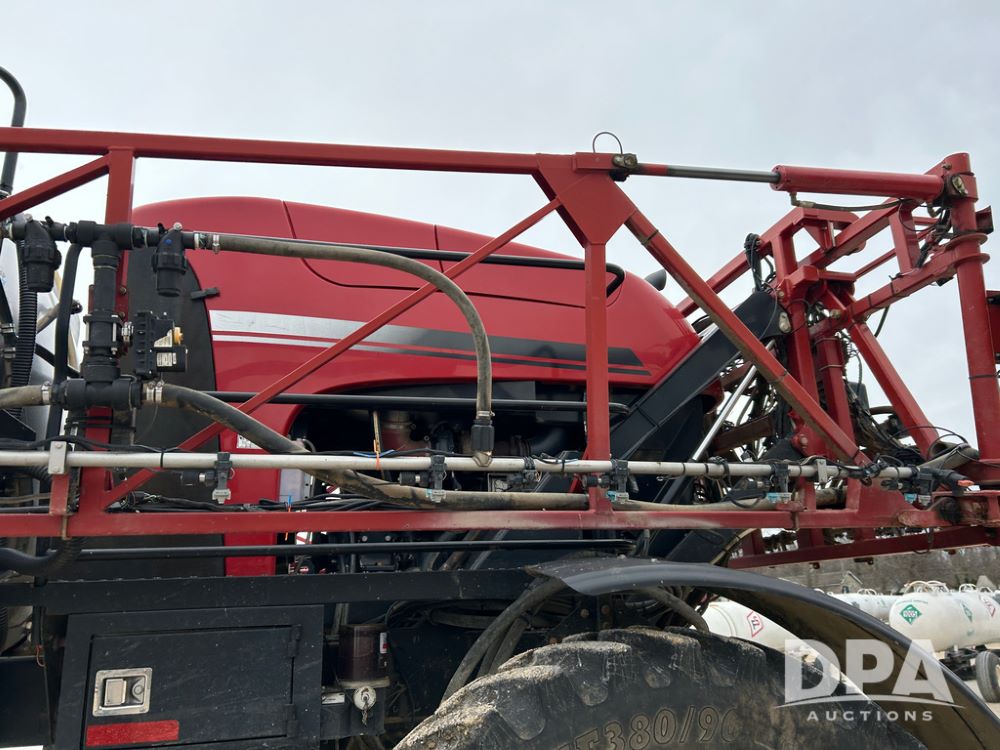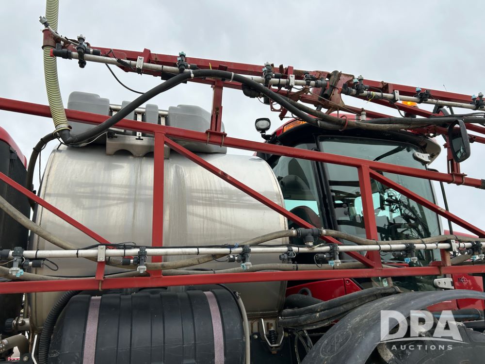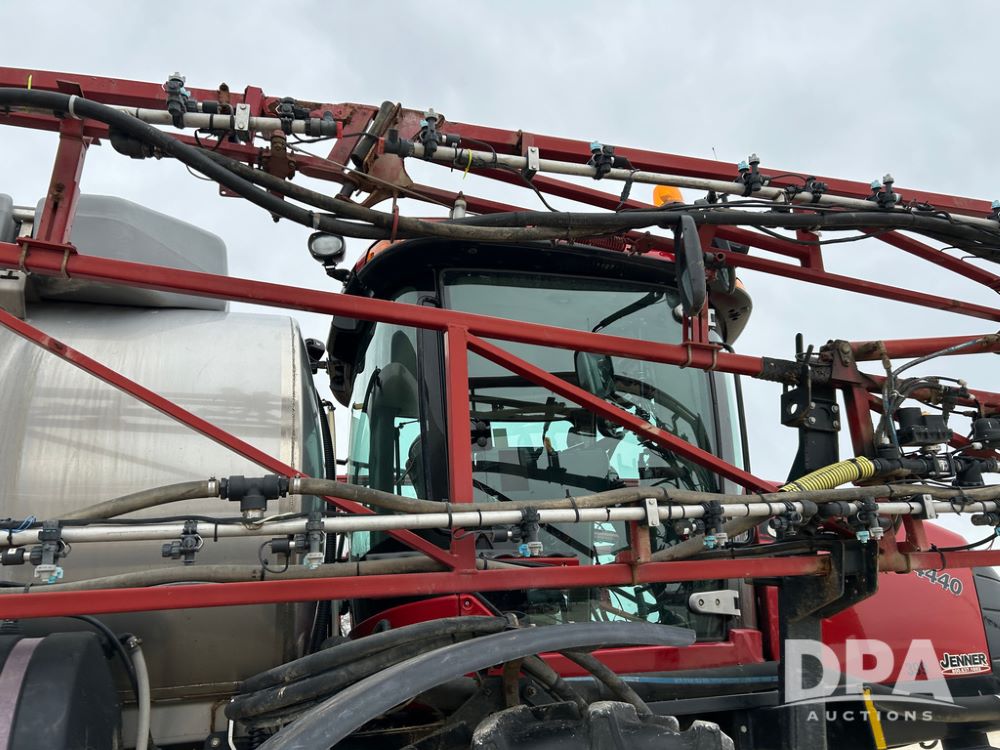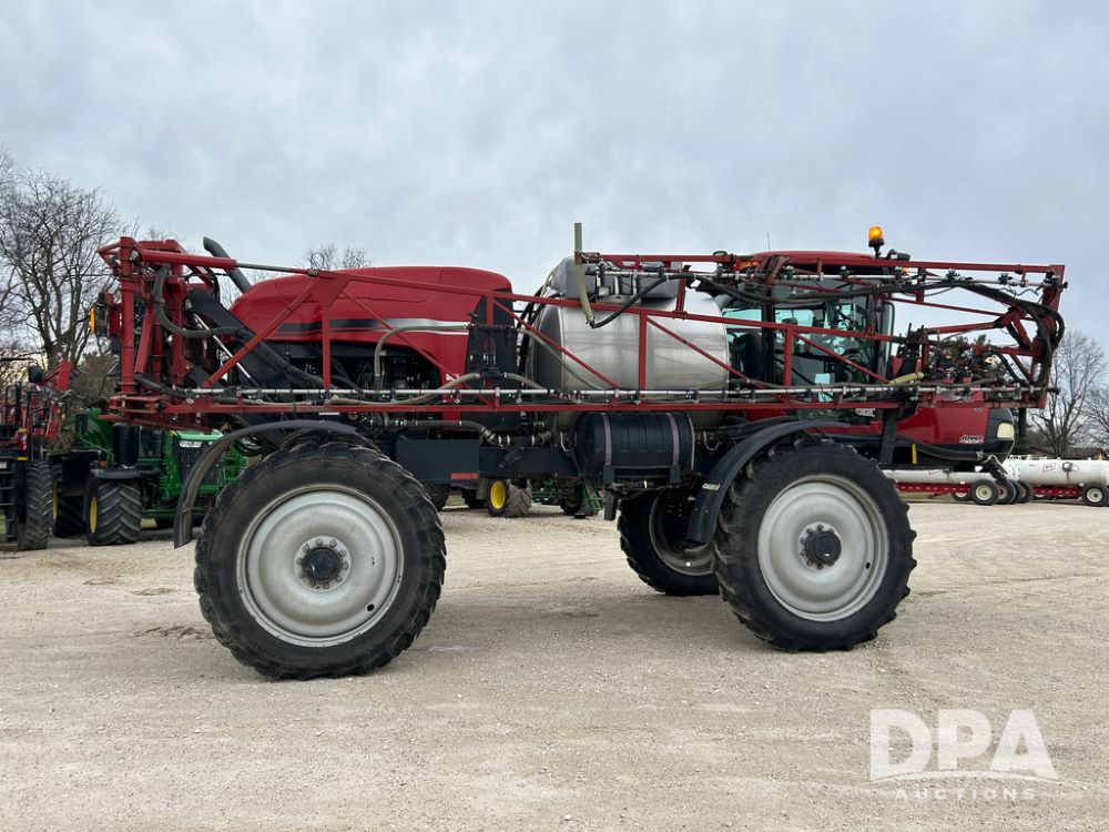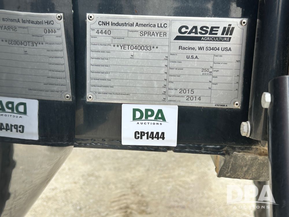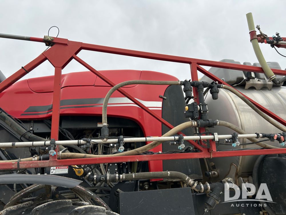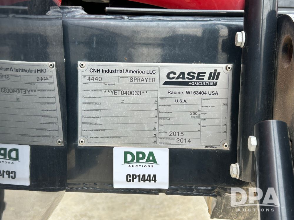2015 CaseIH Patriot 4440 Sprayer (CP1444, Unit 399), diesel engine, hydrostatic transmission, air conditioning, heat, Am/Fm CD radio, leather seat, buddy seat, beacon light, 1200 gallon stainless steel liquid system, 90' boom, foam marker, poly foam marker tank, top poly rinse tank, stainless steel chemical inductor, front fill, Maxam - BKT - Titan 380/90R46 tires, fenders, AIM Command Pro, lightbar, NO monitor or globe, shows 4,850 hours.