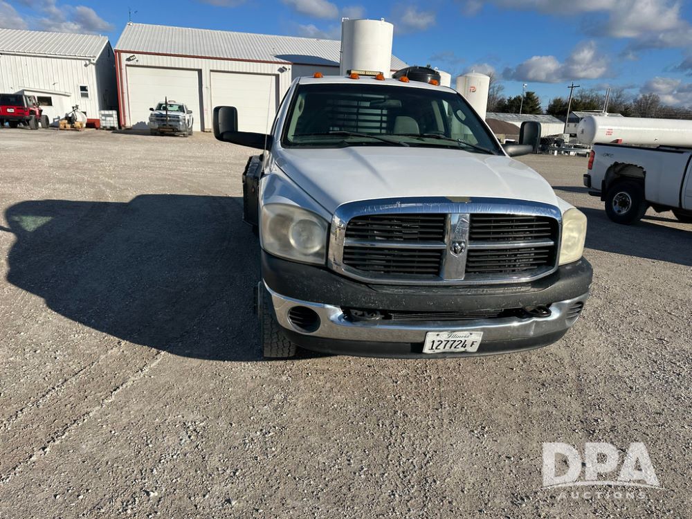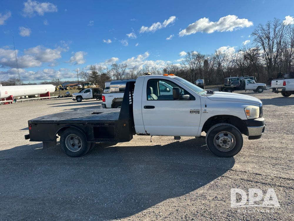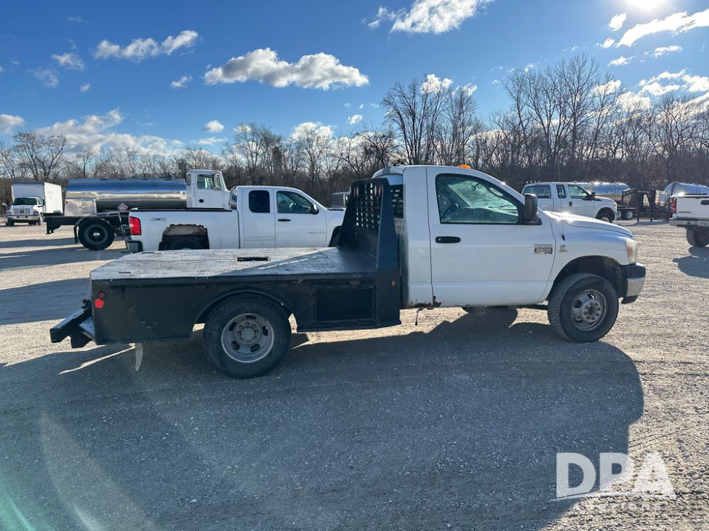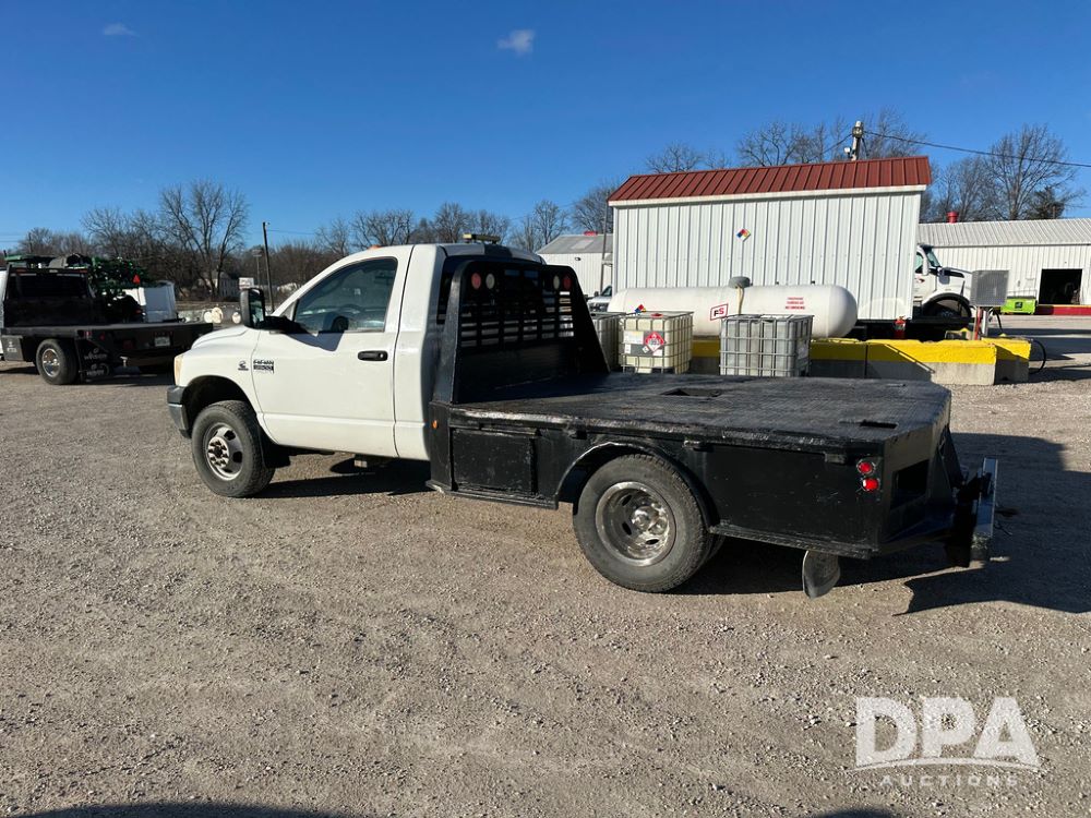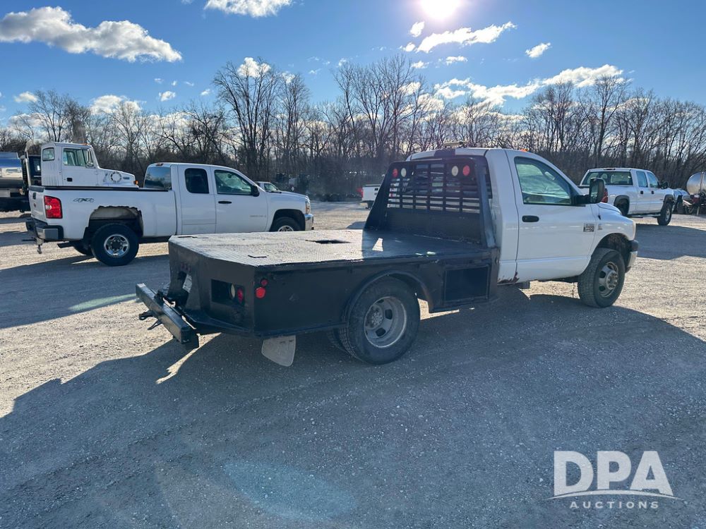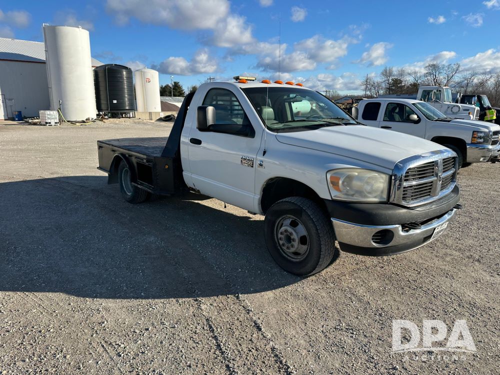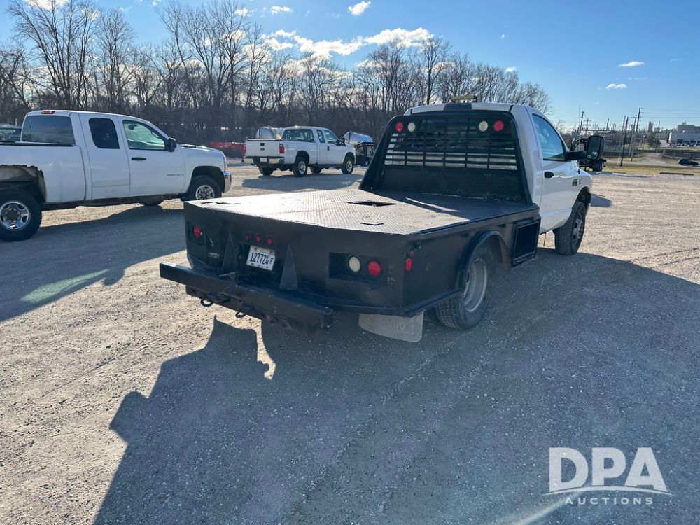 2007 Dodge Ram 3500 Super Duty Flatbed (CP1453, Unit 575), 4X4, Cummins 6.7L Turbo diesel engine, automatic transmission, air conditioning, heat, Am/Fm CD radio, cruise control, dually, steel flatbed, headache rack, 5th wheel, rear hitch, LT245/75R17 tires, shows 284,230 miles.