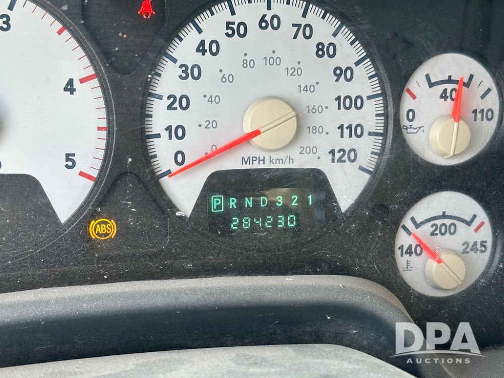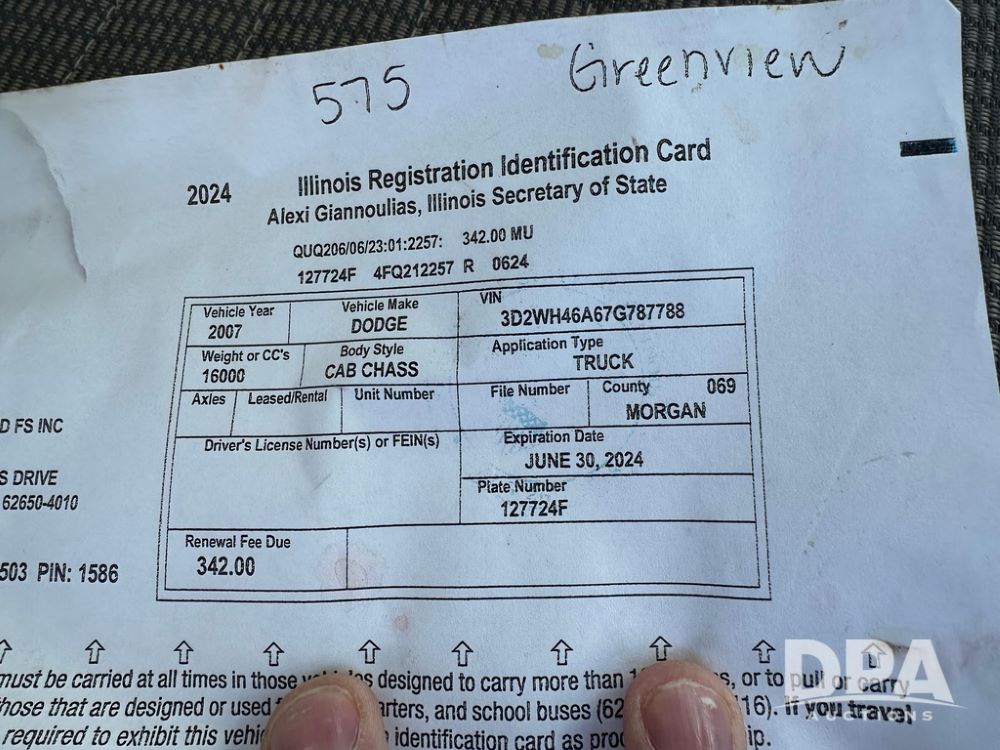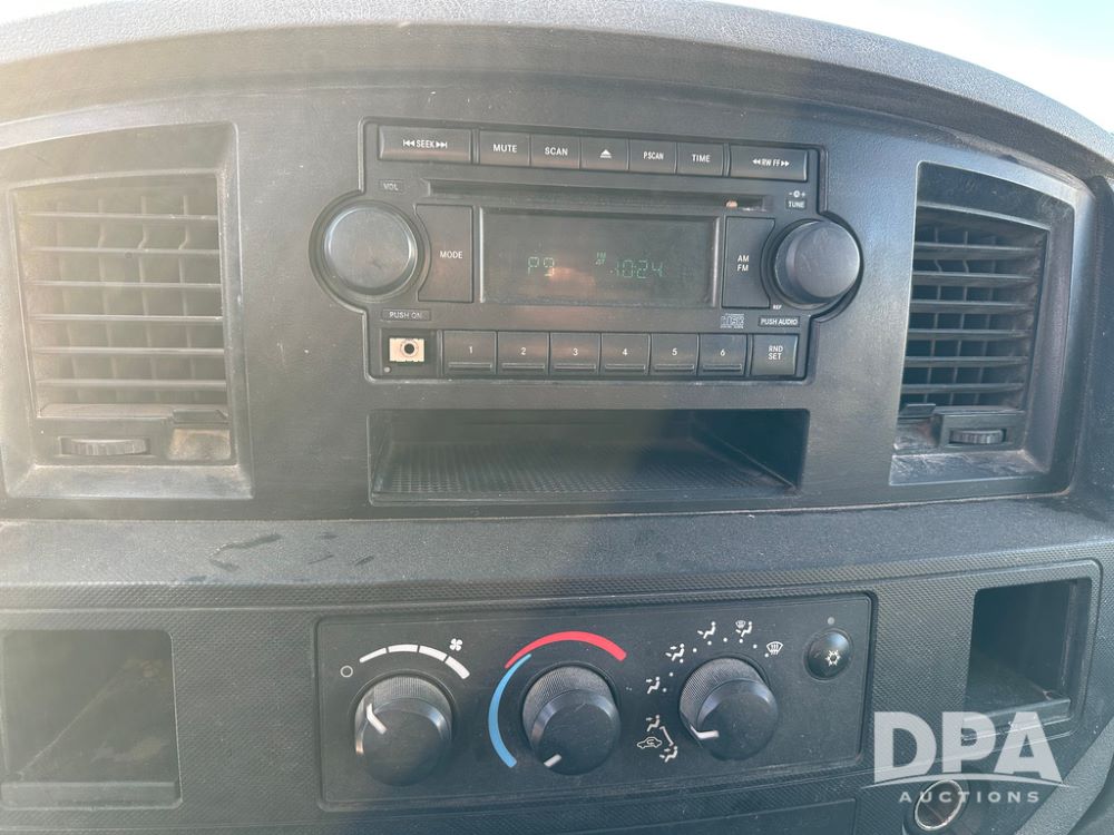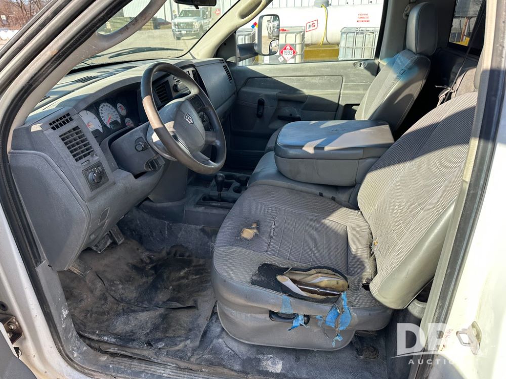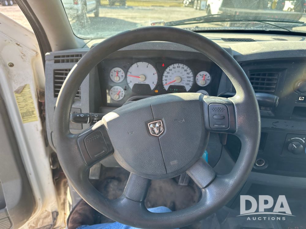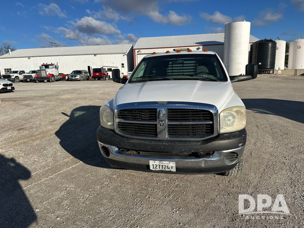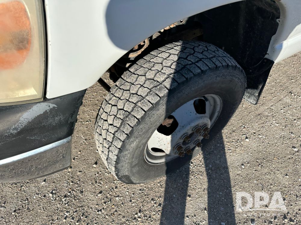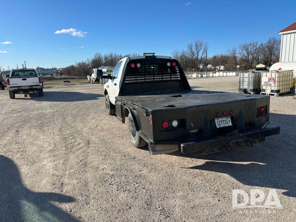 2007 Dodge Ram 3500 Super Duty Flatbed (CP1453, Unit 575), 4X4, Cummins 6.7L Turbo diesel engine, automatic transmission, air conditioning, heat, Am/Fm CD radio, cruise control, dually, steel flatbed, headache rack, 5th wheel, rear hitch, LT245/75R17 tires, shows 284,230 miles.