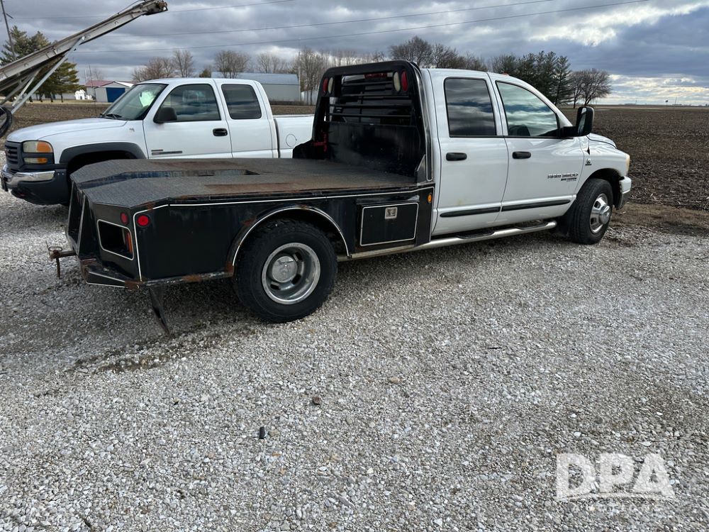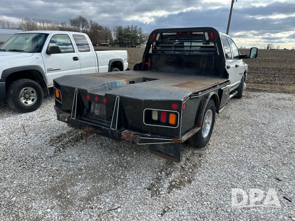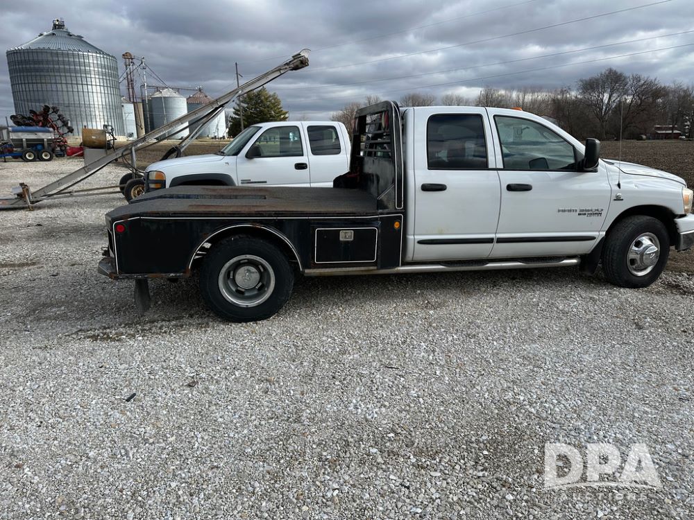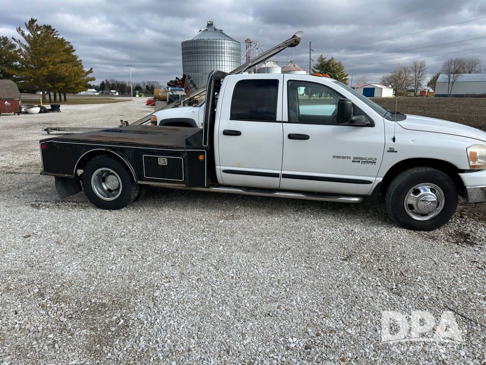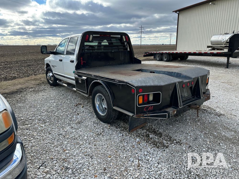 2006 Dodge Ram 3500 Big Horn Edition Flatbed (CP1468, Unit 819), Cummins Turbo diesel engine, automatic transmission, air conditioning, heat, Am/Fm CD radio, cruise control, power windows & locks, power drivers seat, running boards, dually, CM steel flatbed, headache rack, 5th wheel, rear hitch, LT235/80R17 tires,