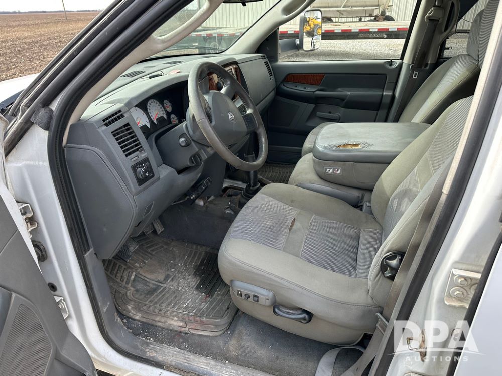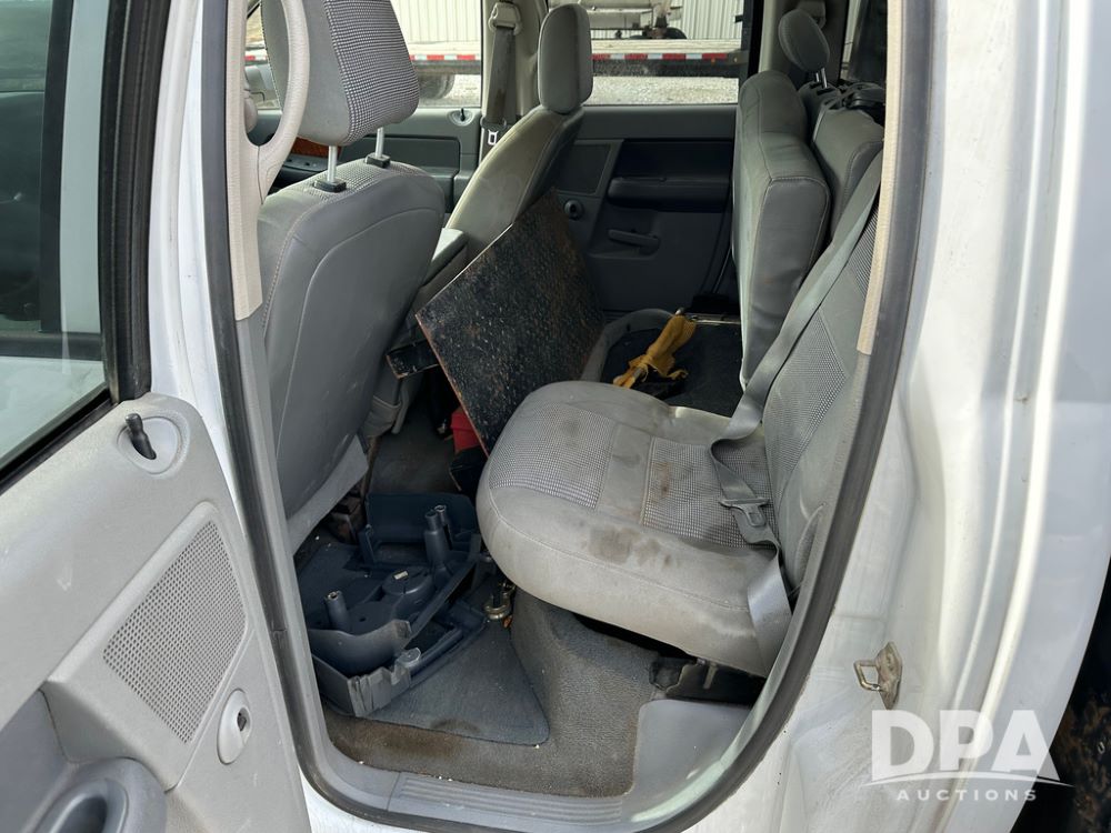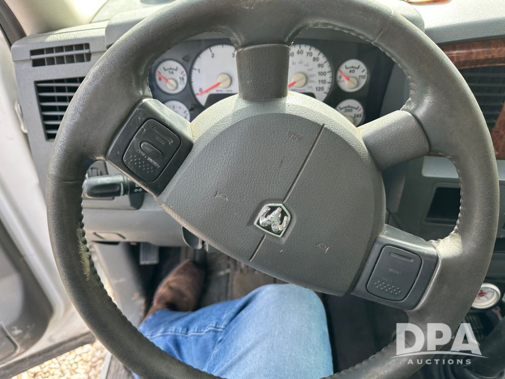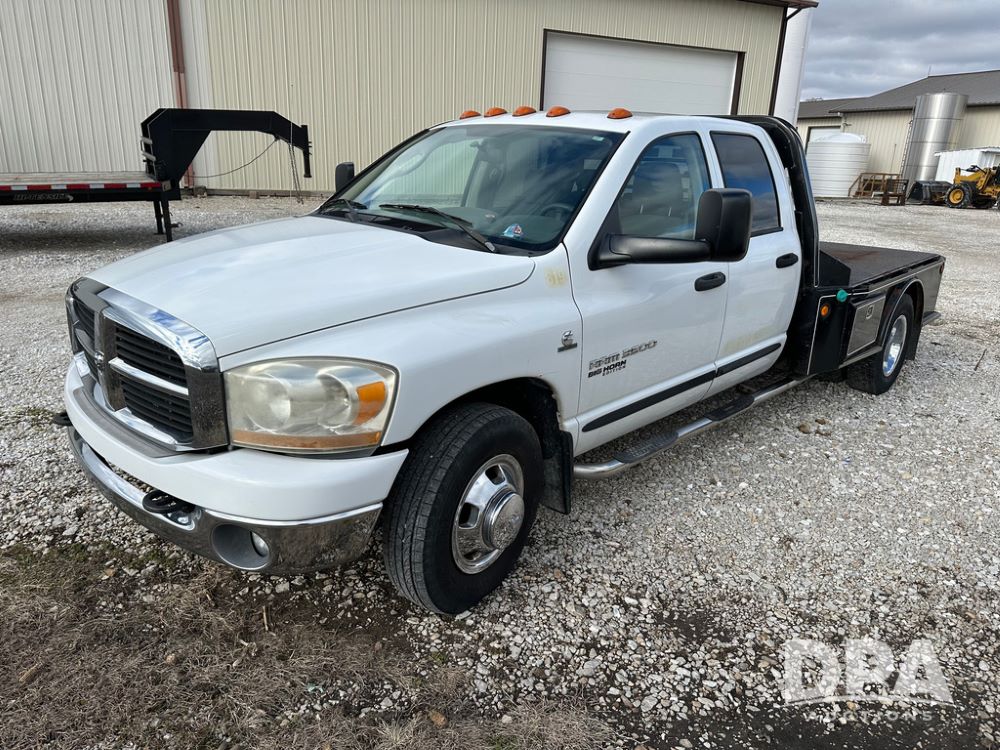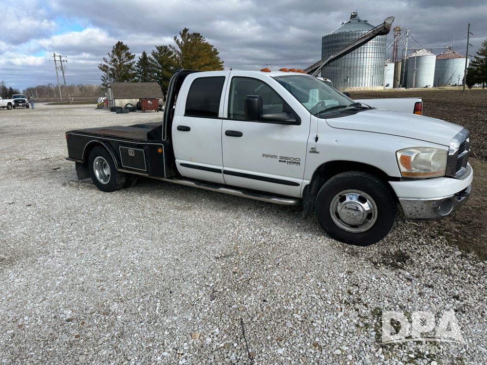 2006 Dodge Ram 3500 Big Horn Edition Flatbed (CP1468, Unit 819), Cummins Turbo diesel engine, automatic transmission, air conditioning, heat, Am/Fm CD radio, cruise control, power windows & locks, power drivers seat, running boards, dually, CM steel flatbed, headache rack, 5th wheel, rear hitch, LT235/80R17 tires,