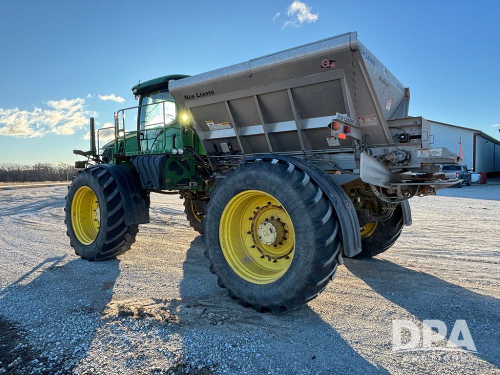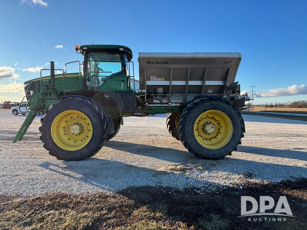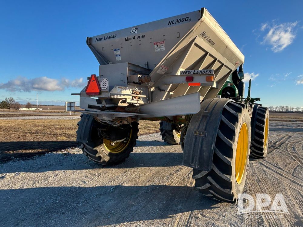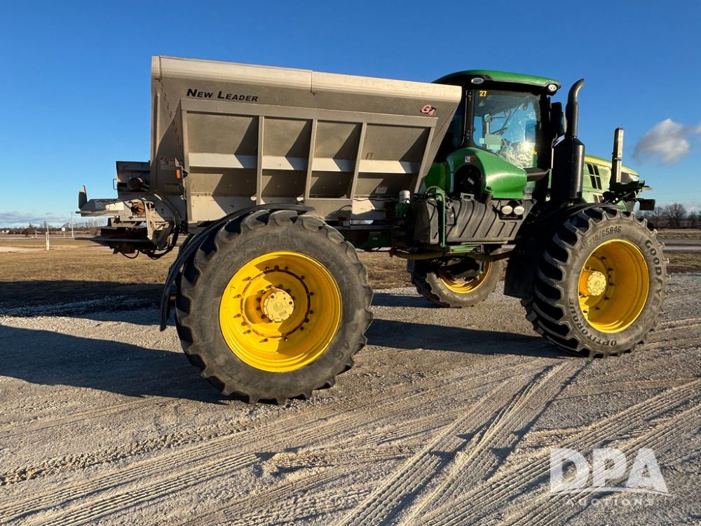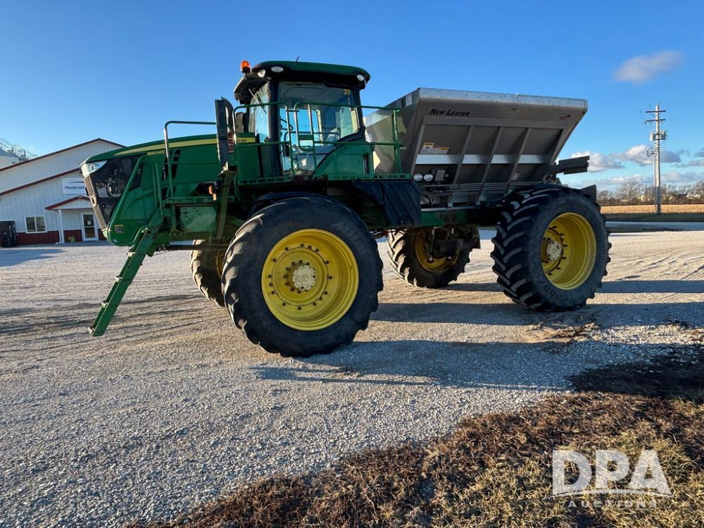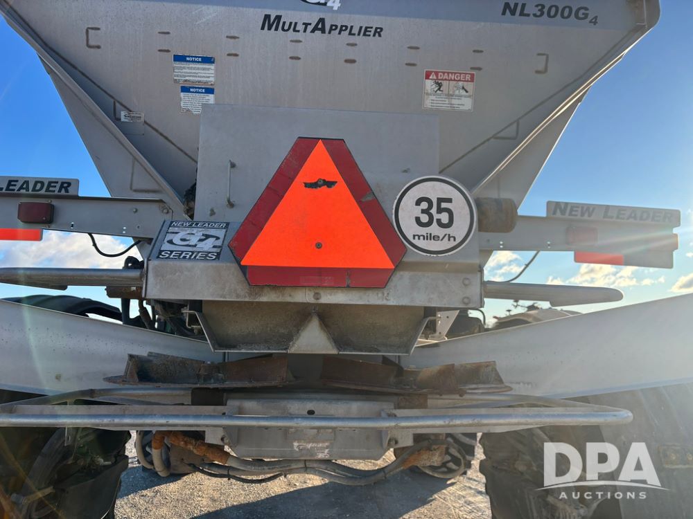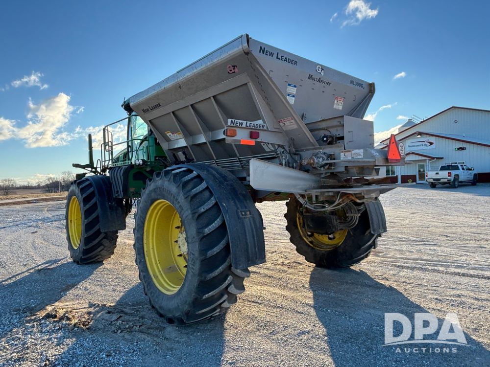 2018 John Deere R4045 Dry Machine (GP12506, Unit 27), John Deere diesel engine, hydrostatic transmission, air conditioning, heat, Am/Fm CD radio, leather seat, buddy seat, beacon light, New Leader NL300 G4 - 11' stainless steel dry spreader box (S/N 503959), twin spinner, all hydraulic, New Leader stainless steel insert, MItas SFT & Good Year LSW 710/65R46 tires, fenders, John Deere monitor, shows 4,920 hours.