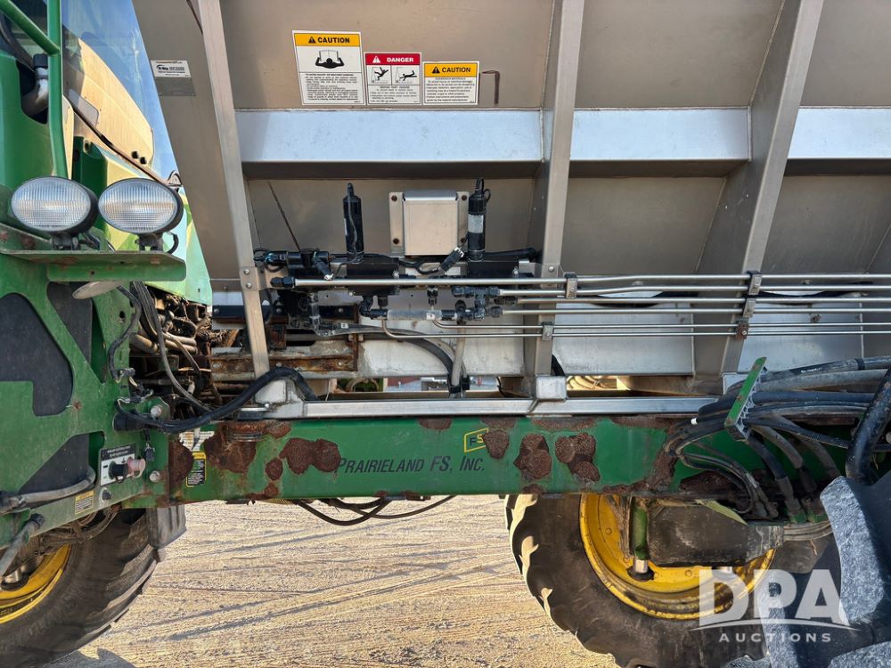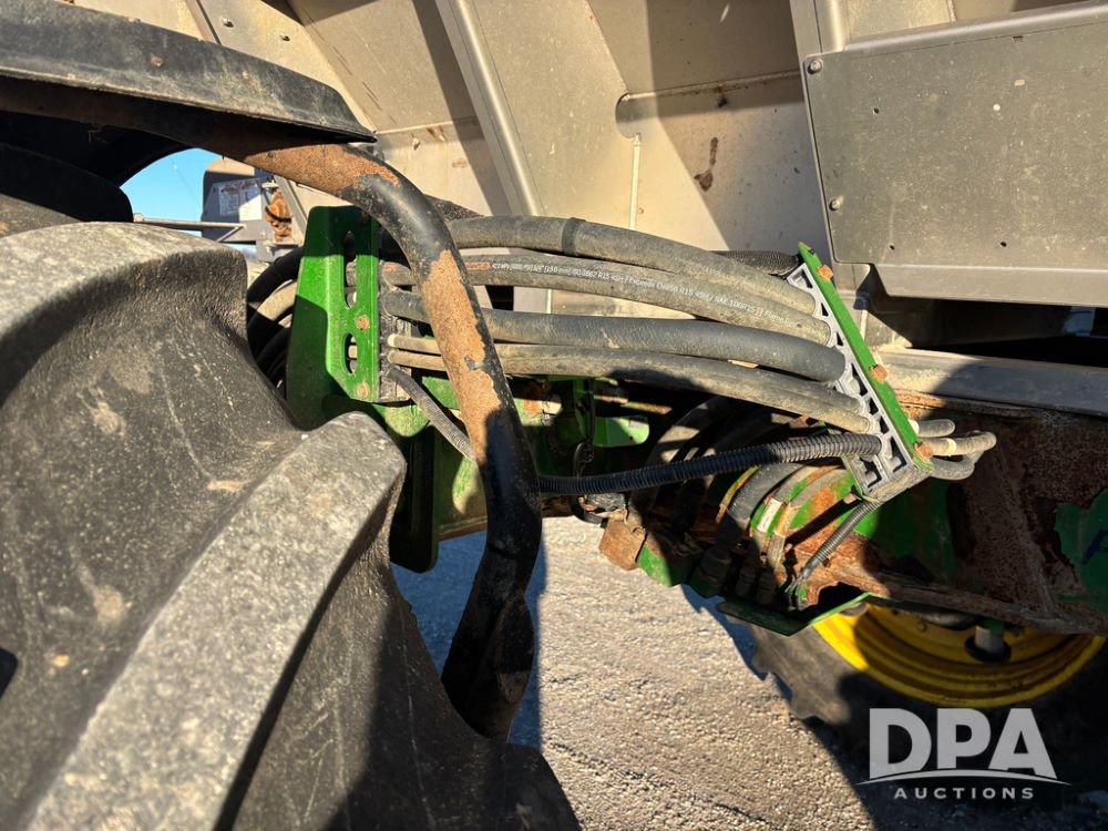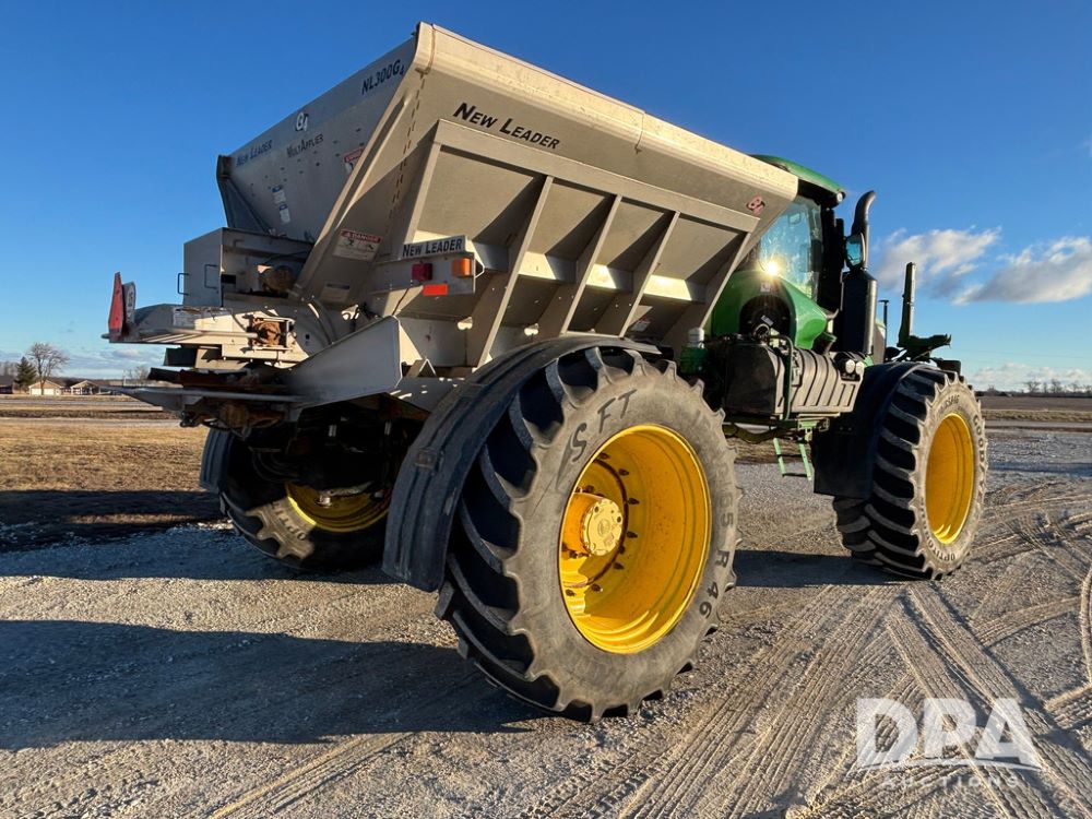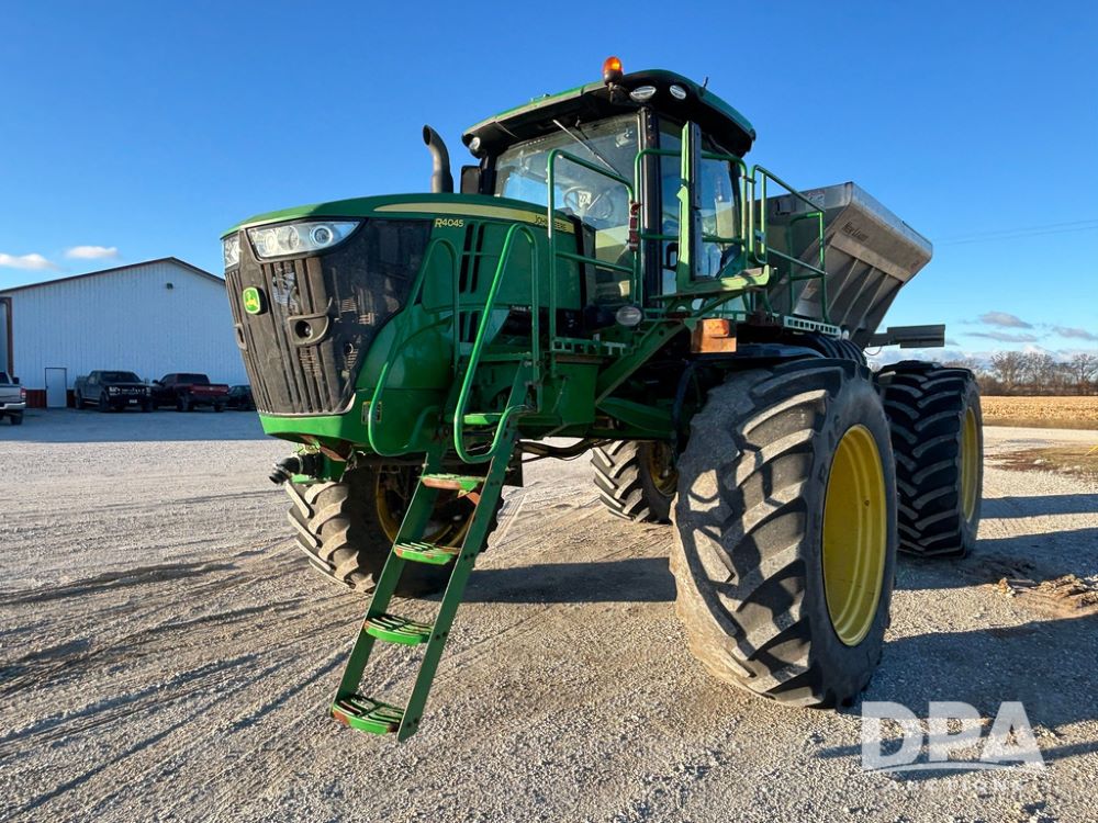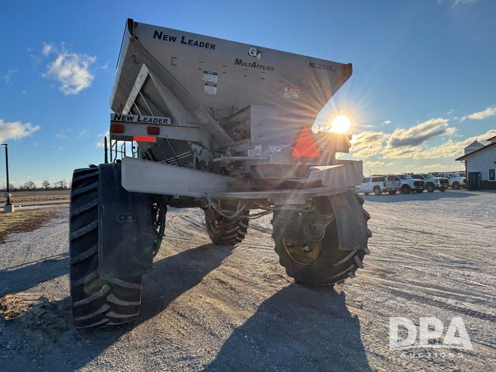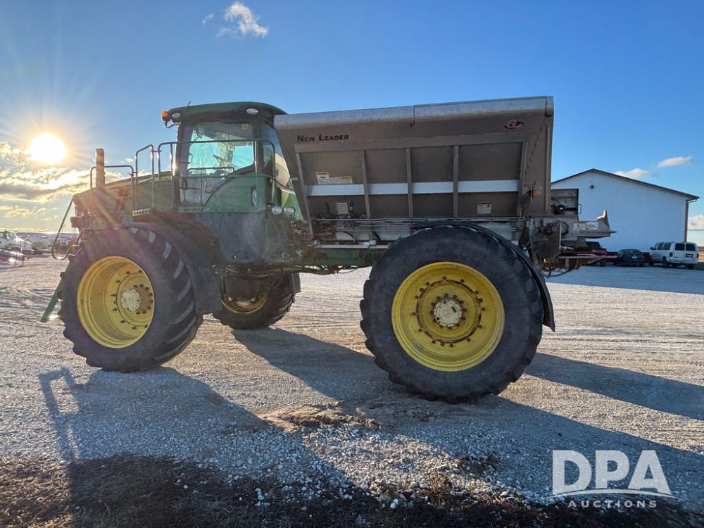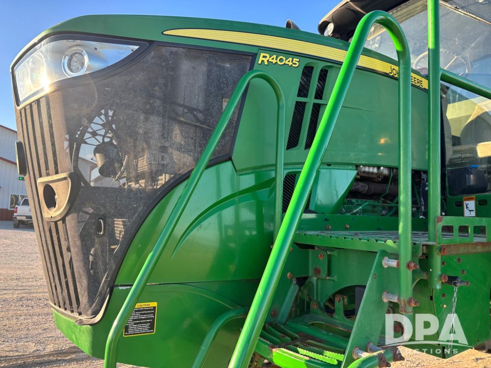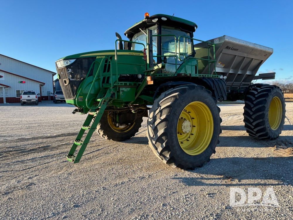 2018 John Deere R4045 Dry Machine (GP12506, Unit 27), John Deere diesel engine, hydrostatic transmission, air conditioning, heat, Am/Fm CD radio, leather seat, buddy seat, beacon light, New Leader NL300 G4 - 11' stainless steel dry spreader box (S/N 503959), twin spinner, all hydraulic, New Leader stainless steel insert, MItas SFT & Good Year LSW 710/65R46 tires, fenders, John Deere monitor, shows 4,920 hours.