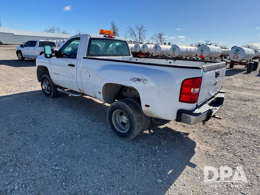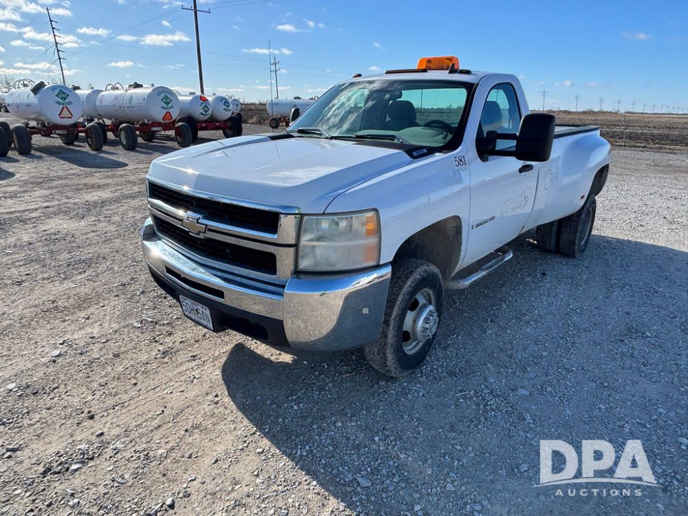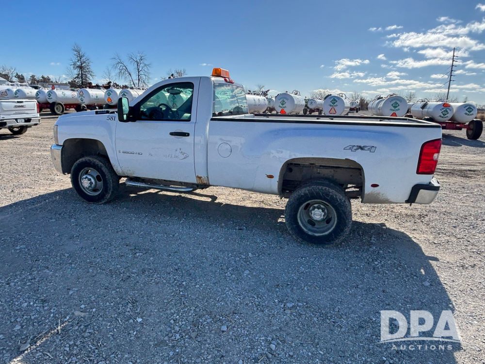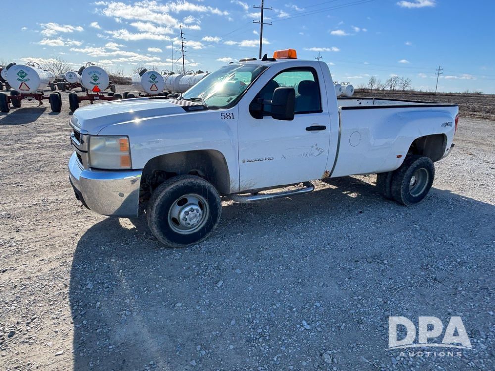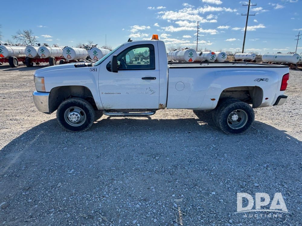 2007 Chevrolet 3500HD Dually Pickup (GP12523, Unit 581), 4x4, Vortec gas engine, automatic transmission, air conditioning, heat, Am/Fm radio, cruise control, running boards, 5th wheel, rear hitch, LT215/85R16 tires, shows 68,804 miles.