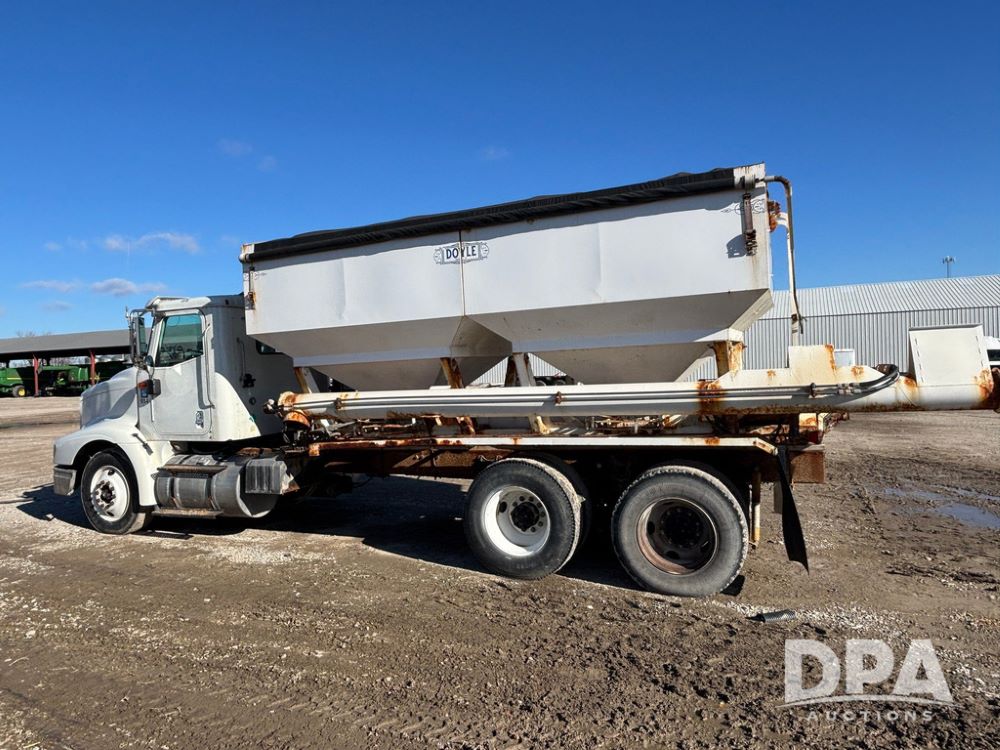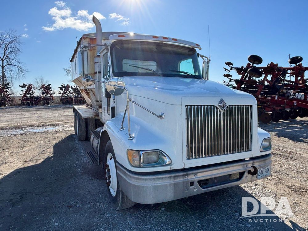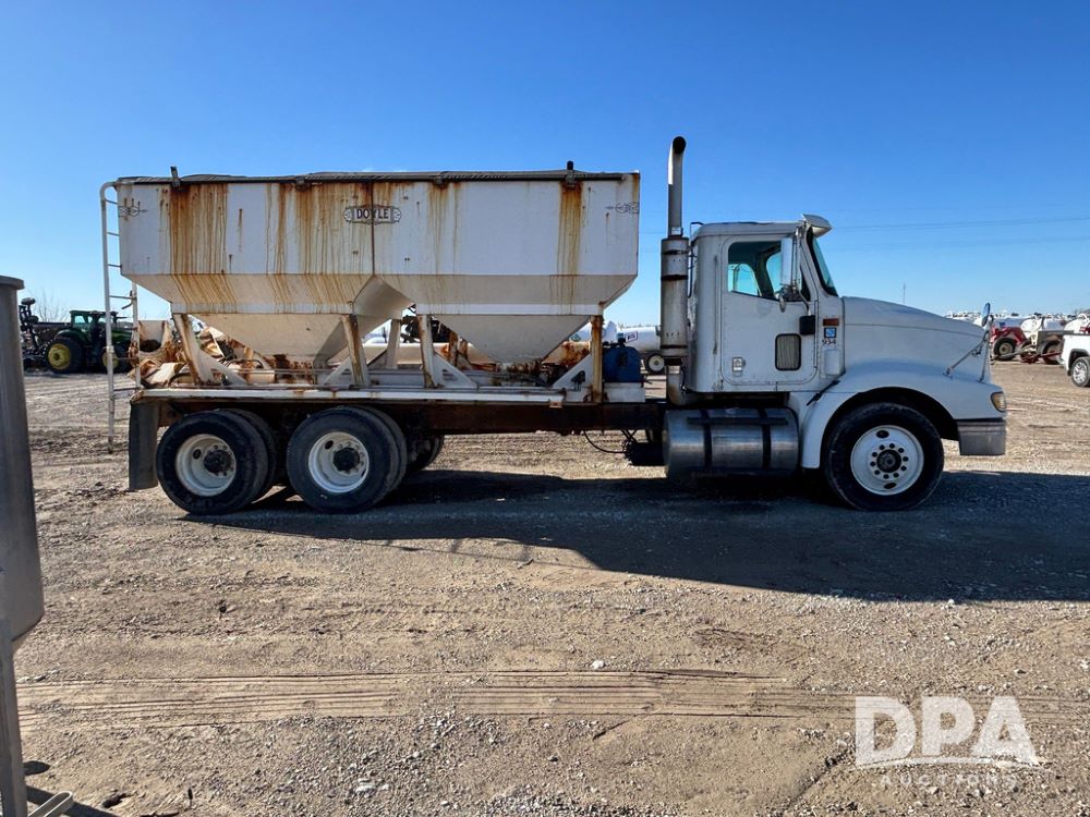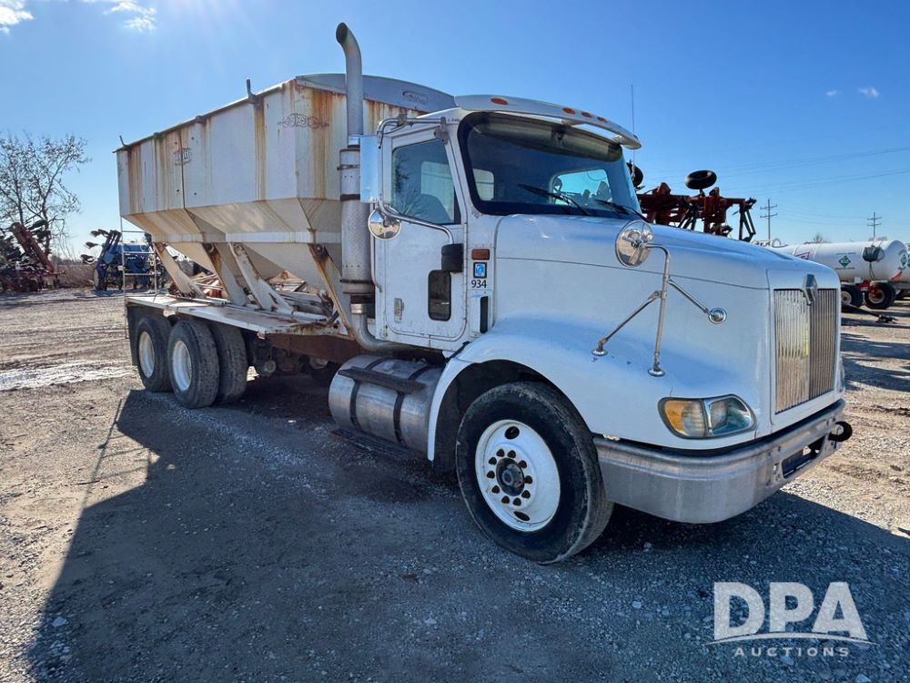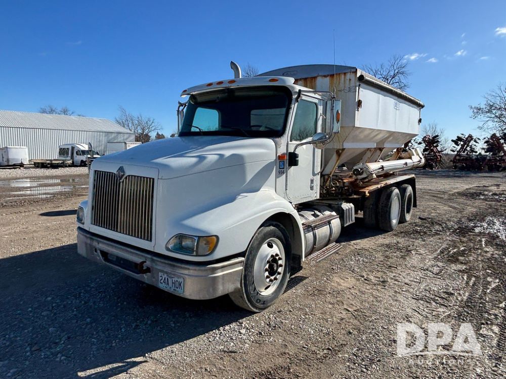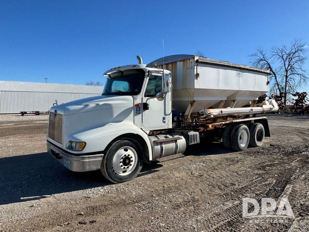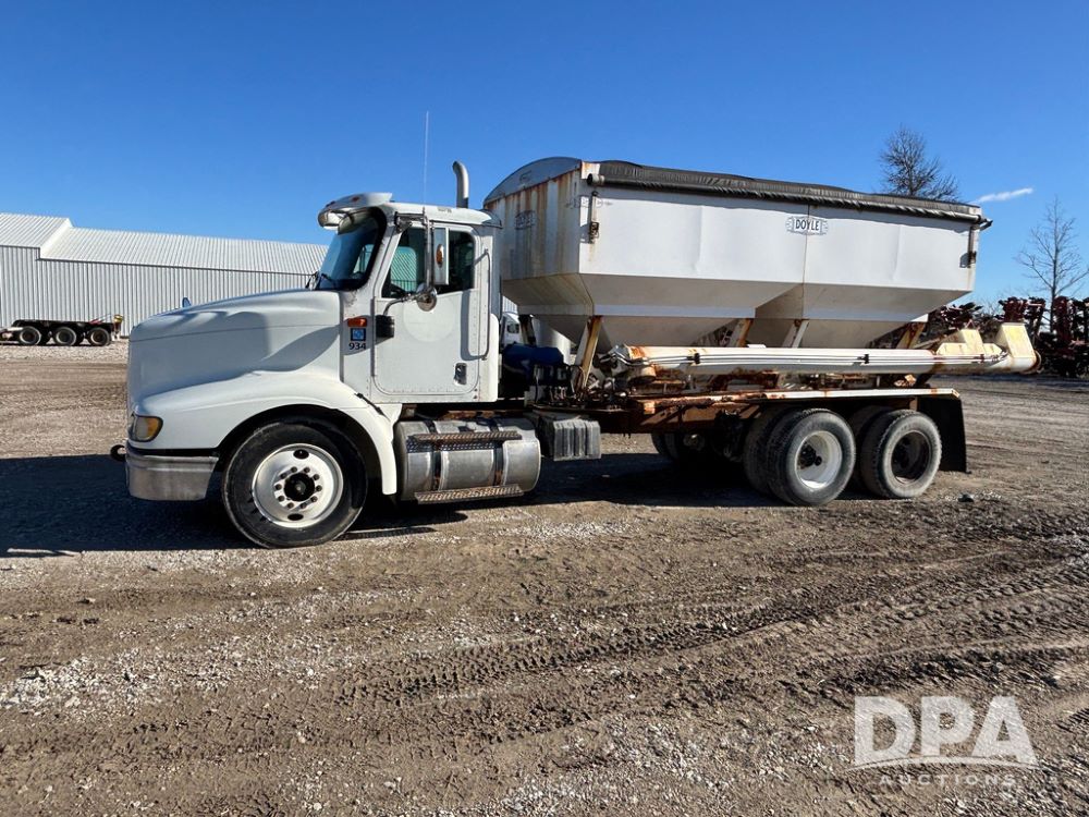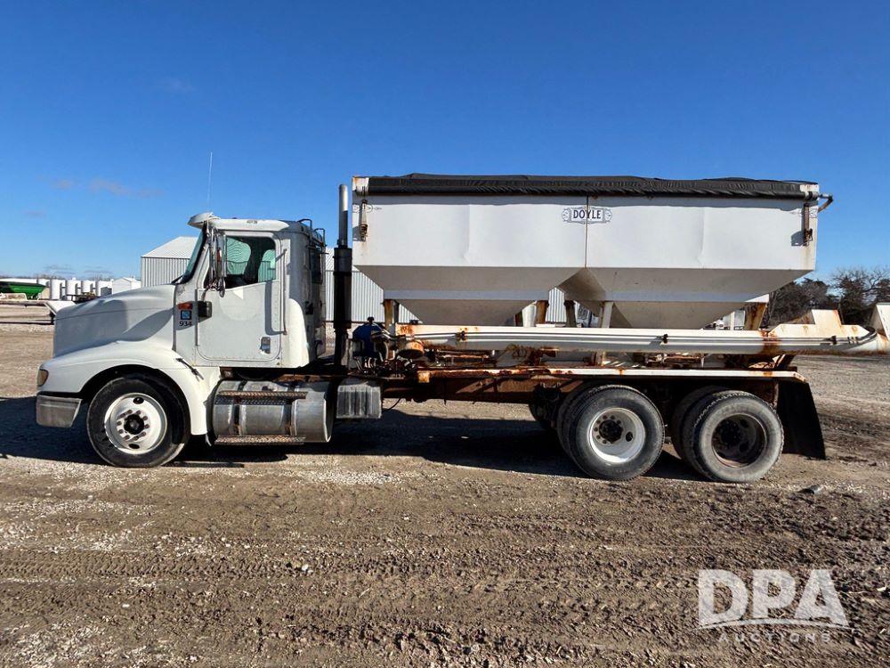 2001 IHC 9100i Dry Tender Truck (GP12521, Unit 934), Cat C-12 diesel engine, Eaton Fuller 10 speed transmission, air conditioning, heat, Am/Fm radio, cruise control, engine brake, tandem axle, full screw, air ride suspension, Doyle 16 ton dry tender box, side discharge auger, all hydraulic, roll over tarp, 285/75R24.5 tires, shows 537,809 miles.