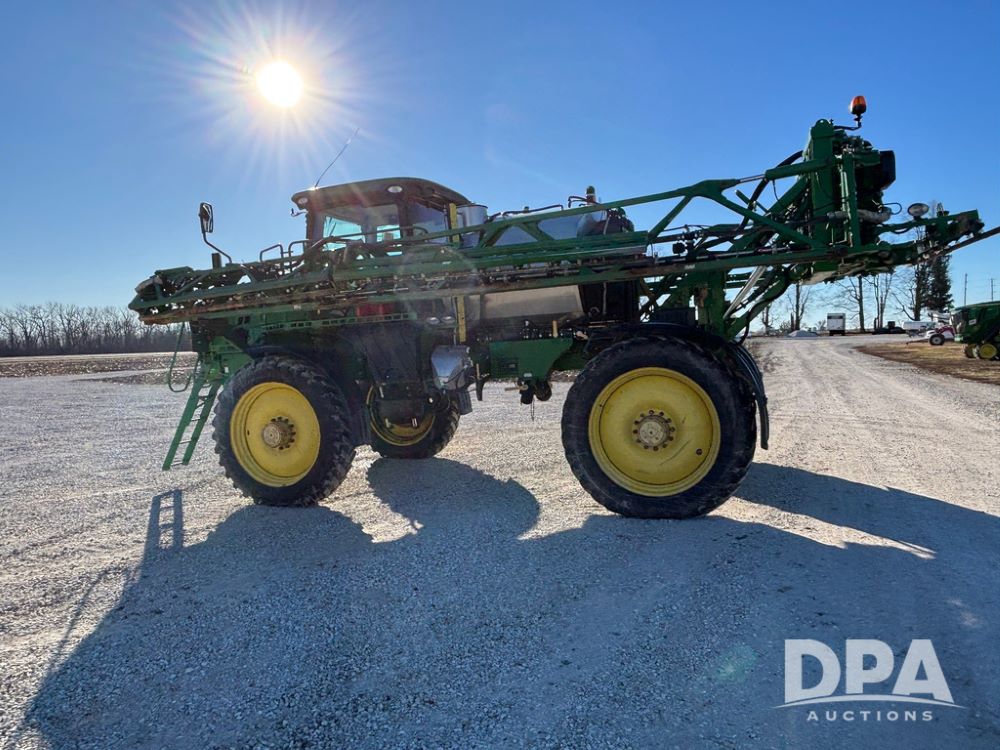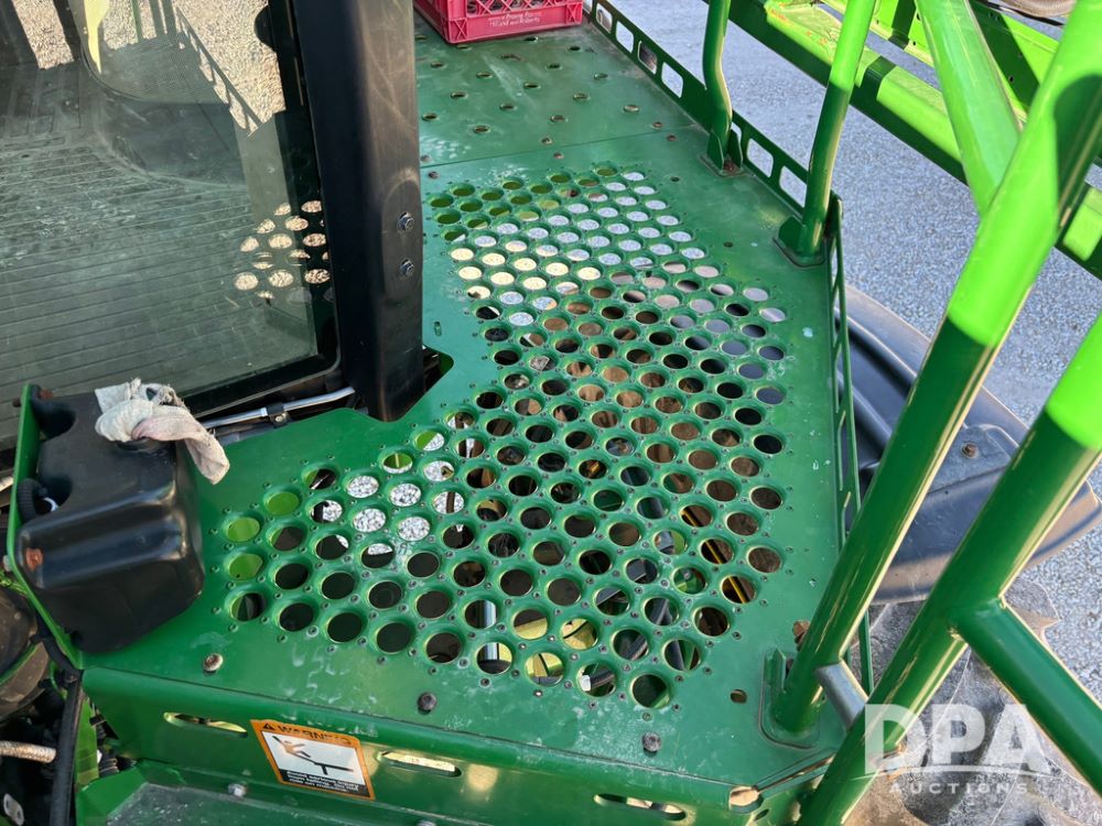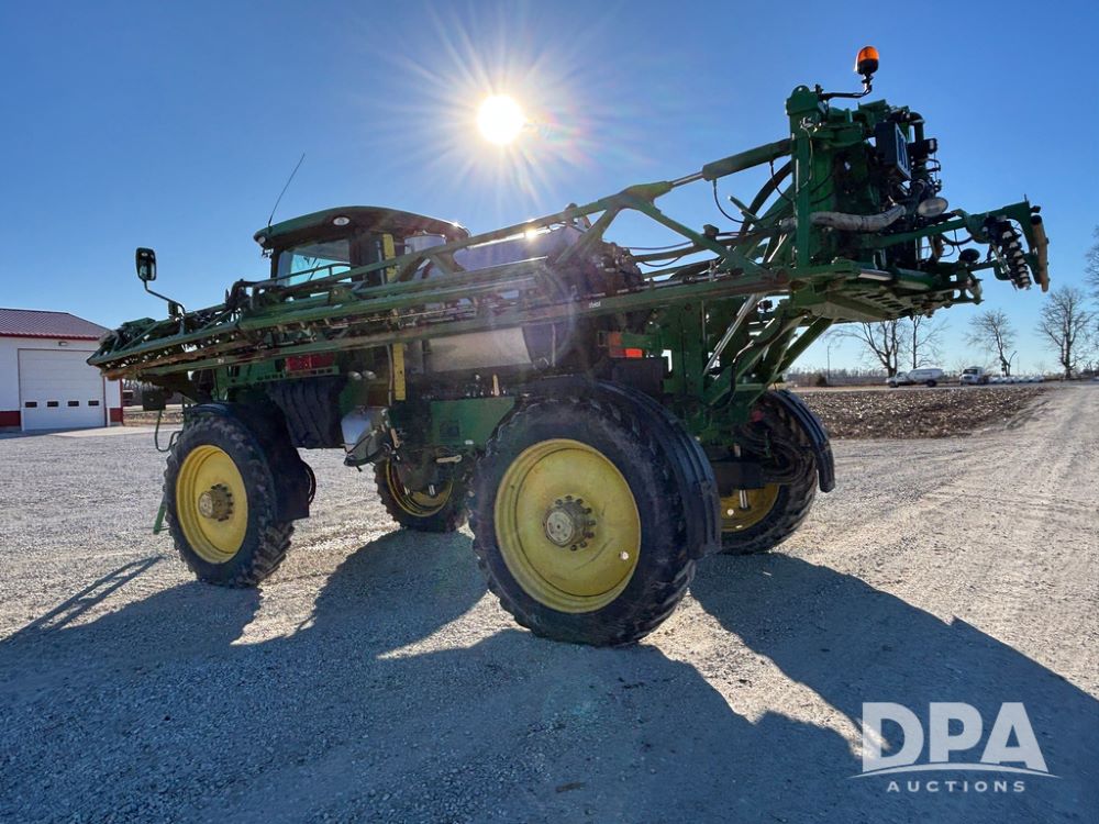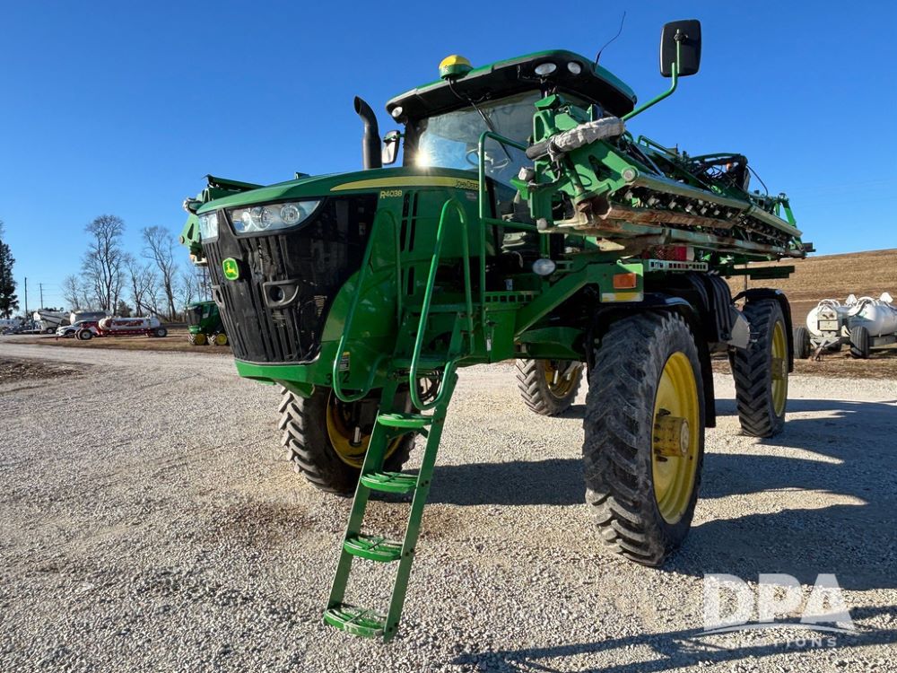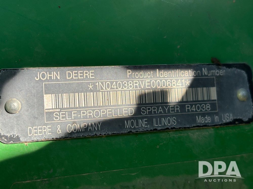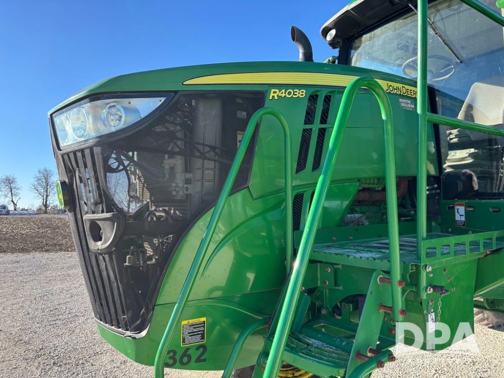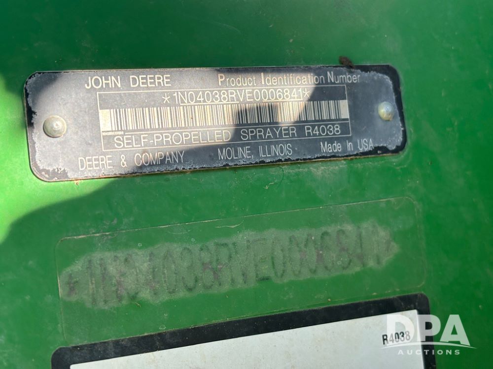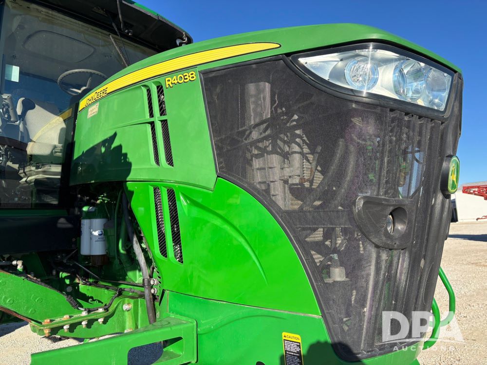 2015 John Deere R4038 Sprayer (GP12538, Unit 362), John Deere diesel engine, hydrostatic transmission, air conditioning, heat, Am/Fm radio, beacon light, 1000 gallon stainless steel liquid system, 100' boom, rear poly rinse tank, stainless steel chemical inductor, automatic solution control, Mitas HC1000 & Michelin VF380/90R46 tires, fenders, John Deere StarFire 6000 globe, John Deere monitor, shows 4,050 hours.