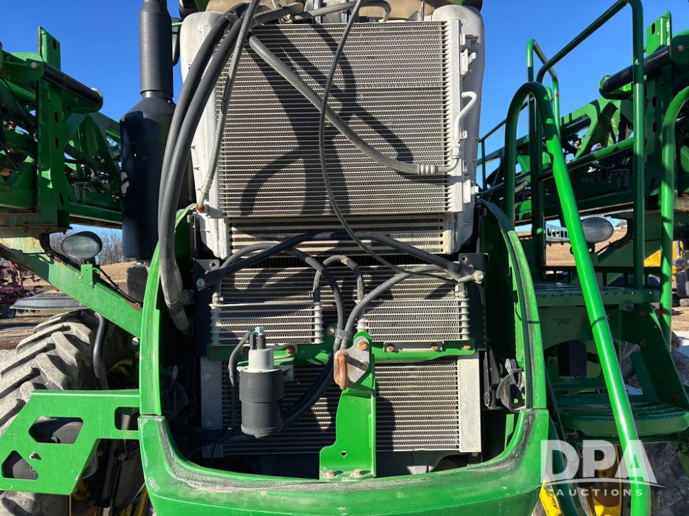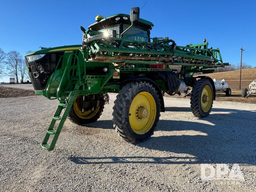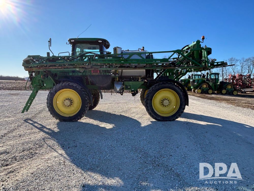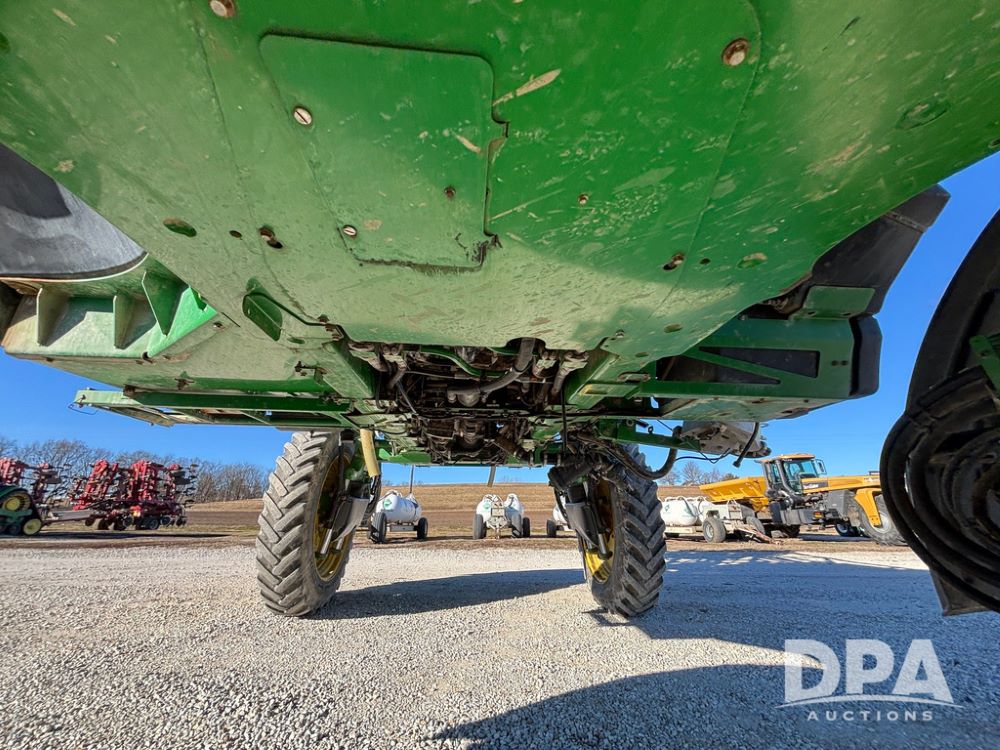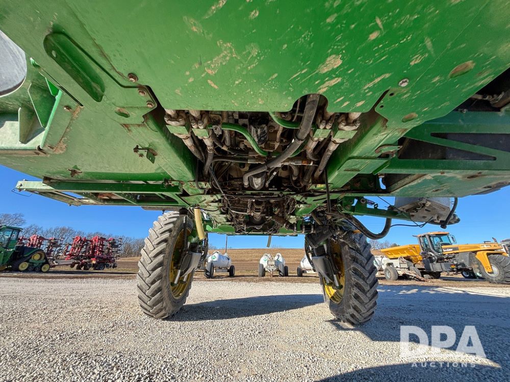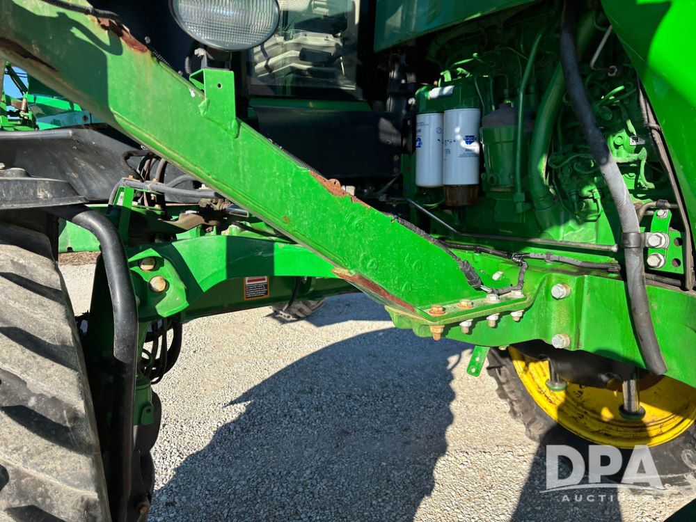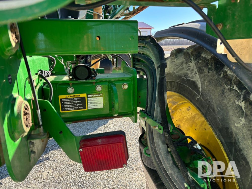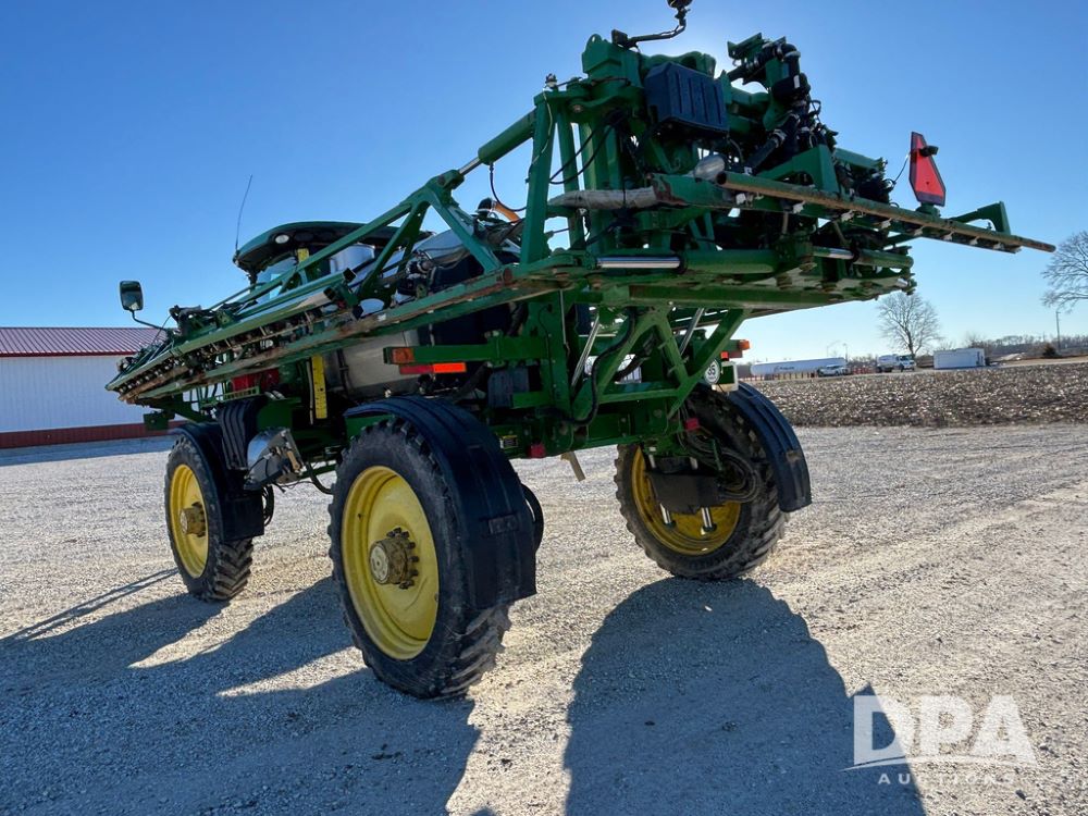 2015 John Deere R4038 Sprayer (GP12538, Unit 362), John Deere diesel engine, hydrostatic transmission, air conditioning, heat, Am/Fm radio, beacon light, 1000 gallon stainless steel liquid system, 100' boom, rear poly rinse tank, stainless steel chemical inductor, automatic solution control, Mitas HC1000 & Michelin VF380/90R46 tires, fenders, John Deere StarFire 6000 globe, John Deere monitor, shows 4,050 hours.