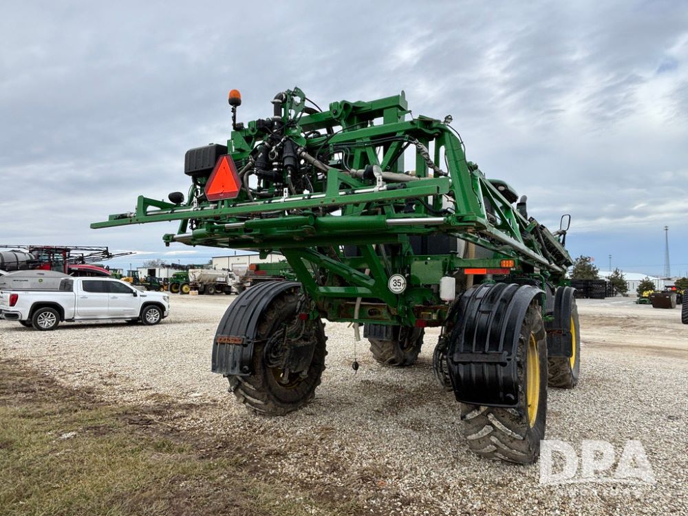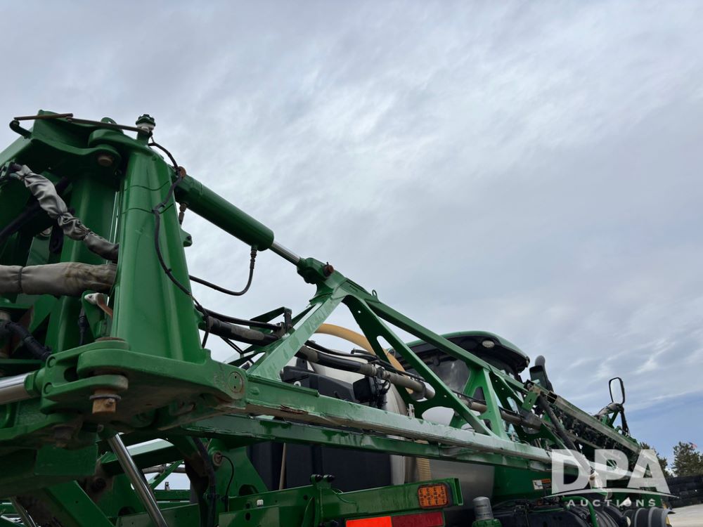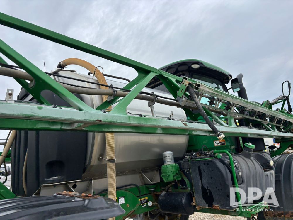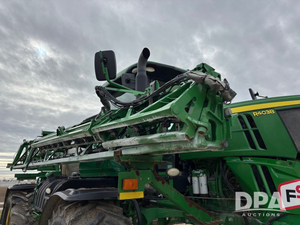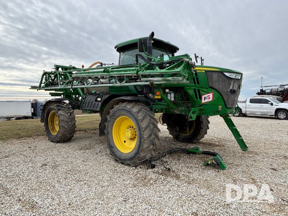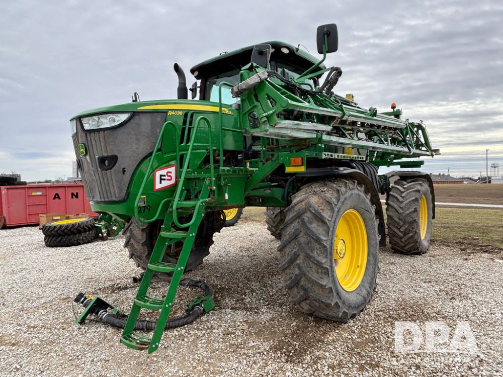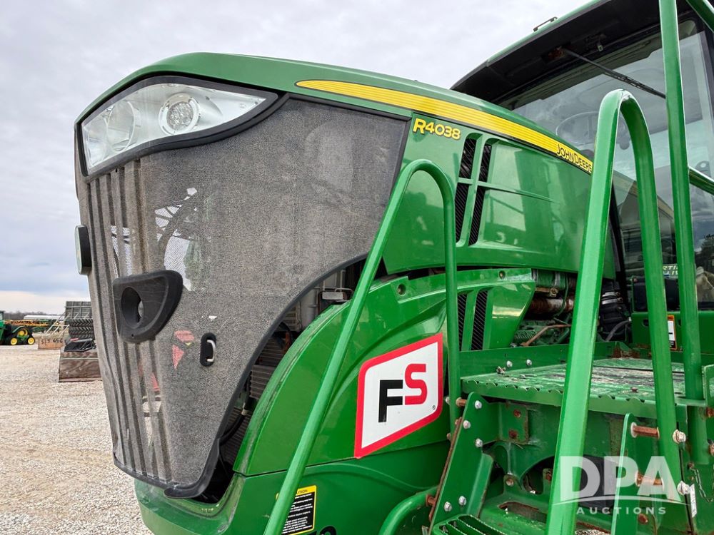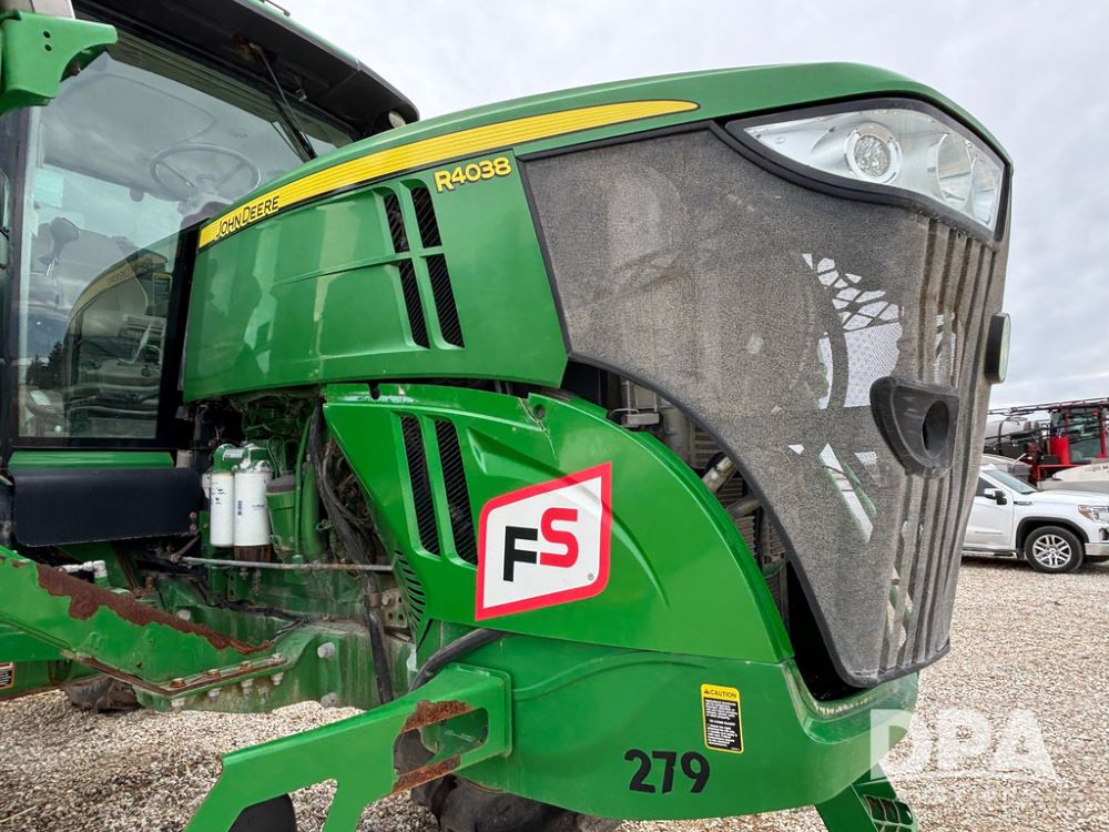 2014 John Deere R4038 Sprayer (GP12503, Unit 279), John Deere diesel engine (S/N RG6090U003536), hydrostatic transmission, air conditioning, heat, Am/Fm radio, leather seat, buddy seat, beacon light, 1000 gallon stainless steel liquid system, 100' boom, rear poly rinse tank, automatic solution control, front fill, Mitas AC65 650/65R38 flotation tires, fenders, John Deere monitor, approx. 4,366 hours.