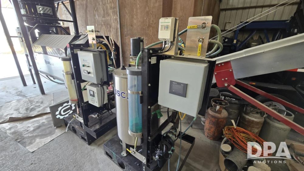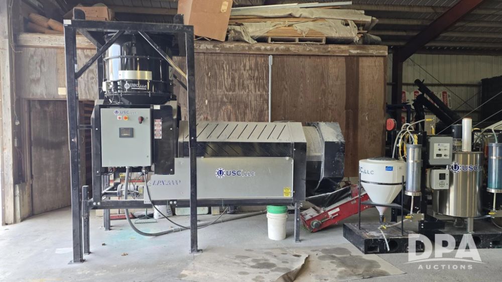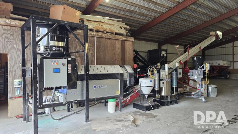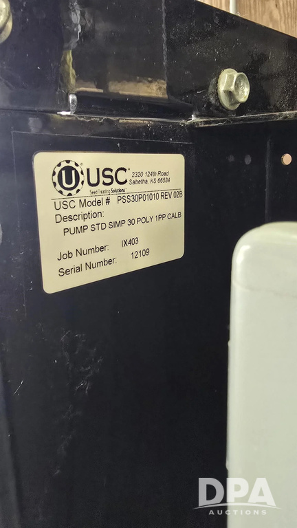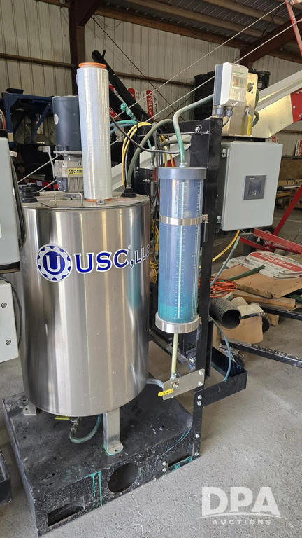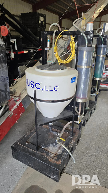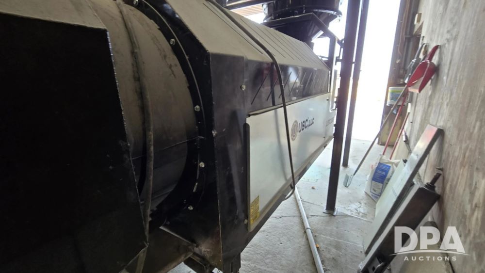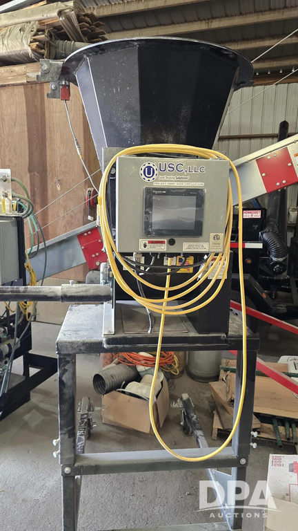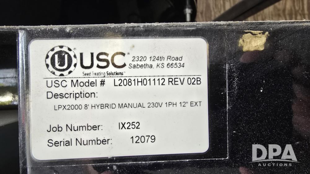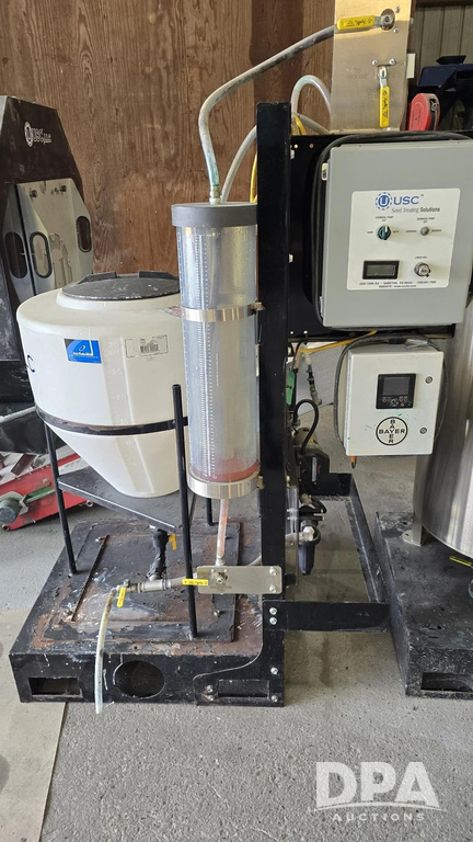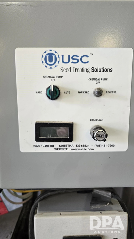 USC LPX2000 Drum Seed Treater Setup (NP6418), USC LPX2000 8' drum seed treater (S/N 12079), seed wheel, Ace Roto-Mold 30 gallon poly innoculant tank w/ poly calibration tube, stainless steel mix tank w/ poly calibration tube, digital screen, KSI Model 1212 31' Series II portable discharge conveyor (S/N 12369), electric motor, hopper with electric vibrator, automated box opener is included, USC dry talc applicator.