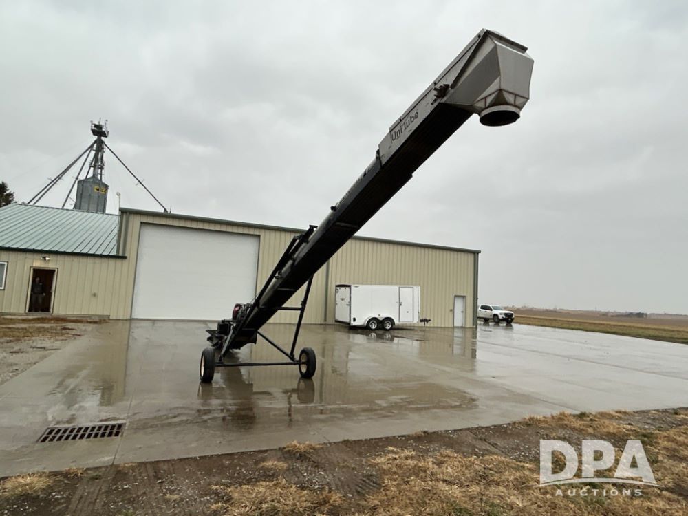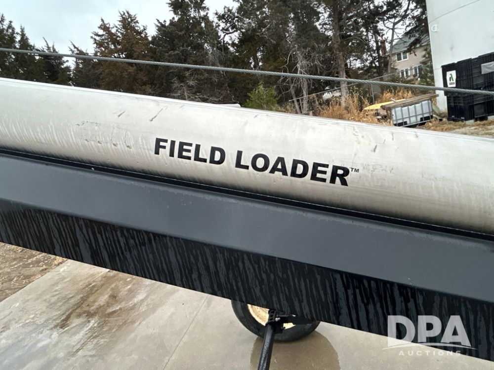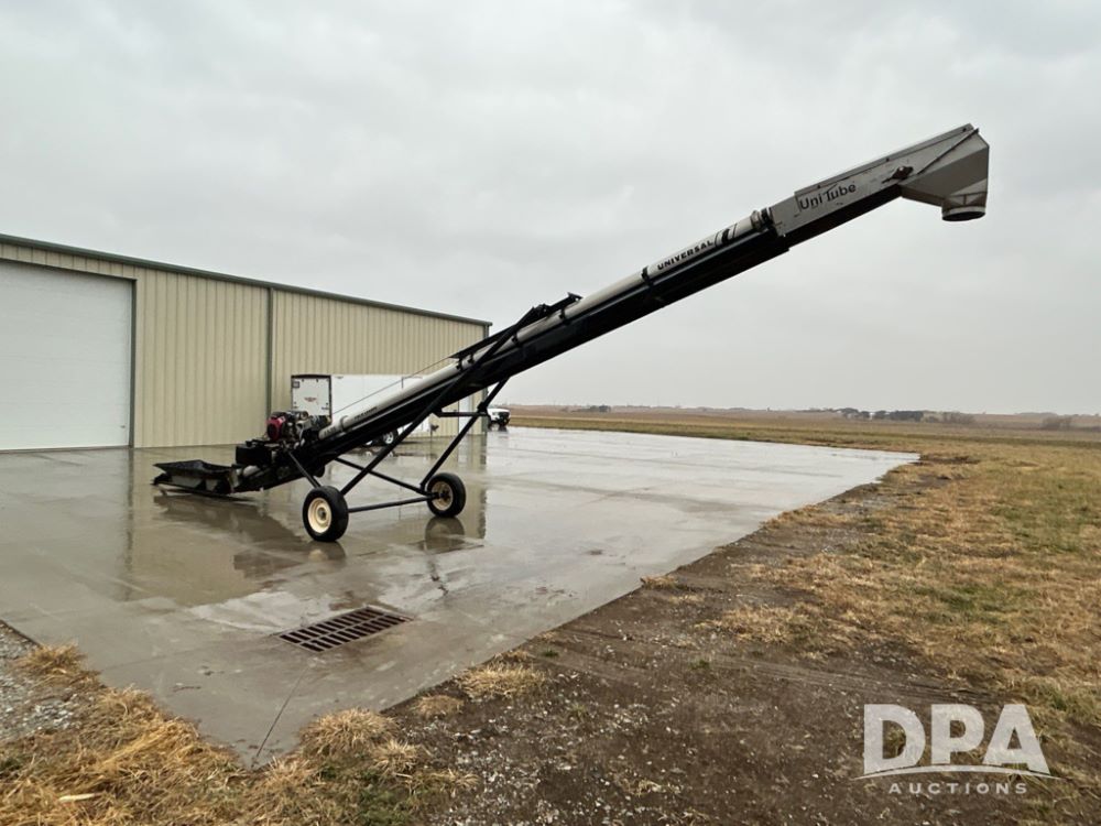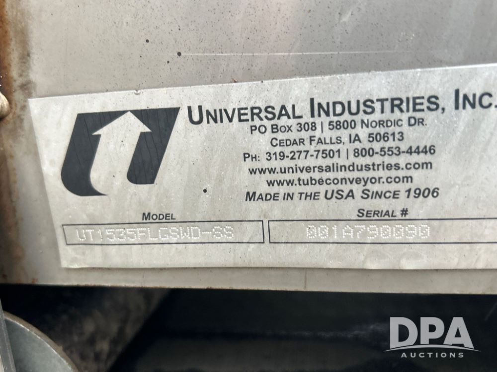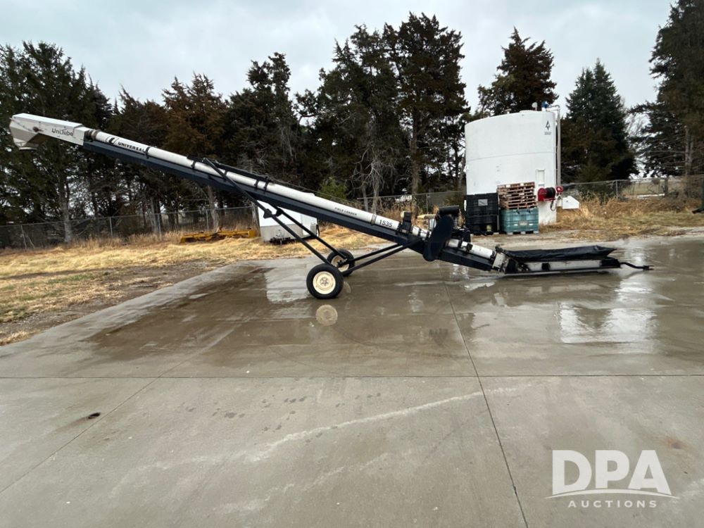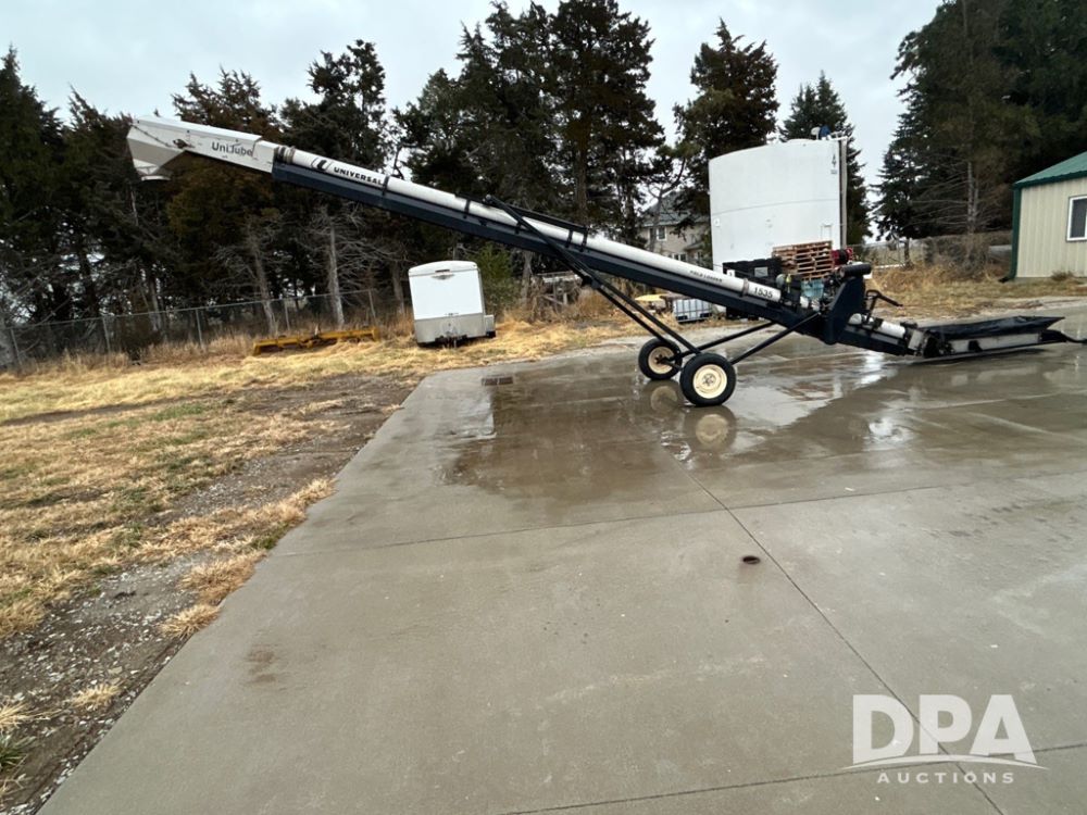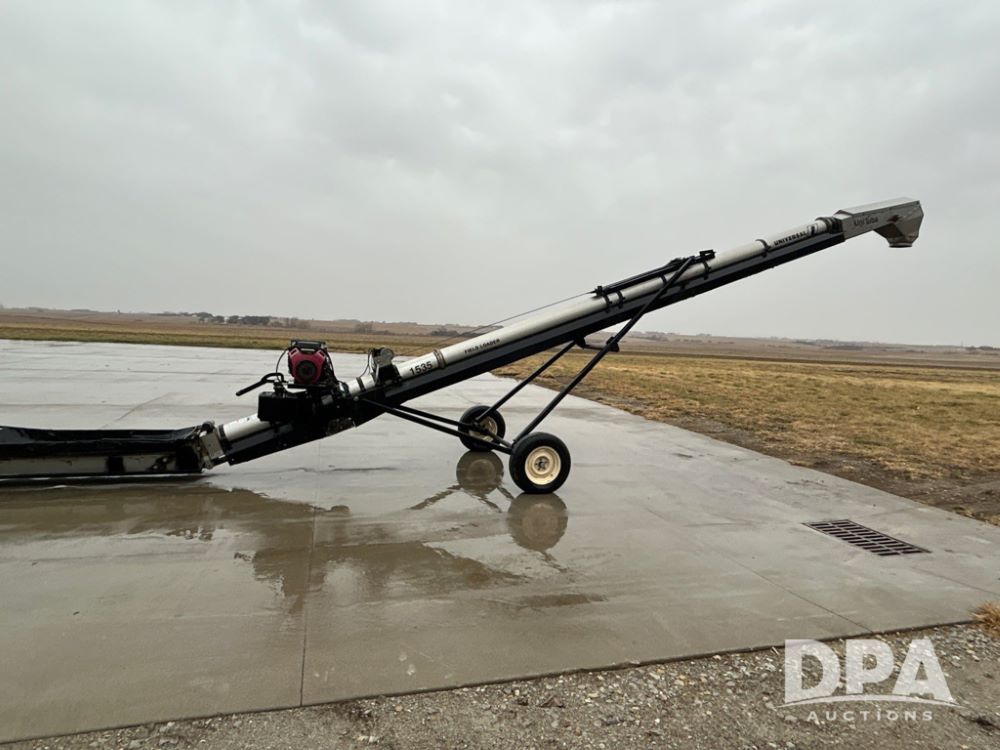 Universal 1535 Field Loader Conveyor (JM738), portable, 35 feet, 15-inch wide 2-ply chevron-patterned conveyor belt, Honda 630 gas motor, collapsible hopper canvas.