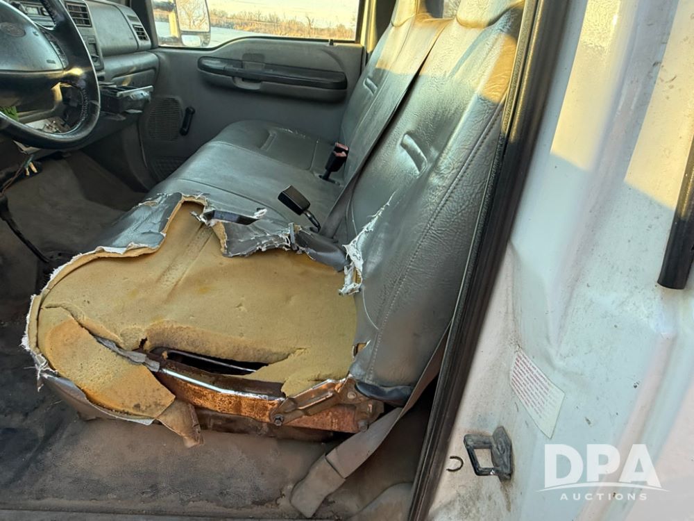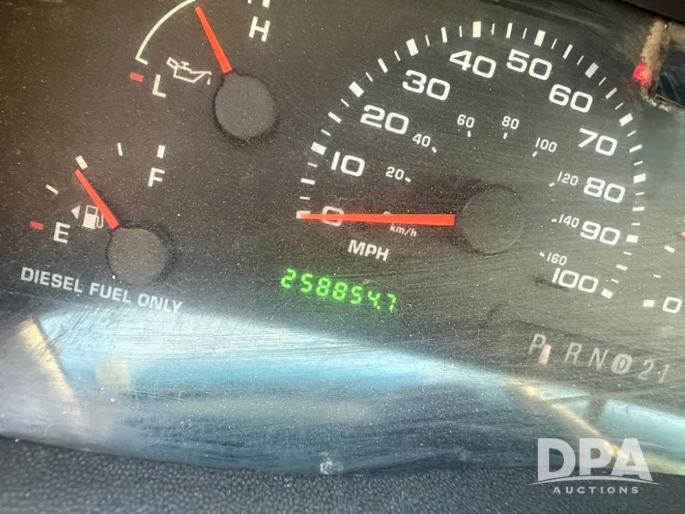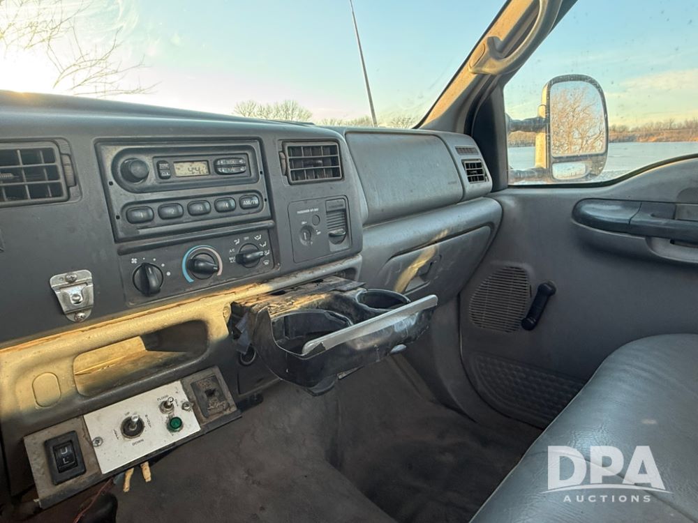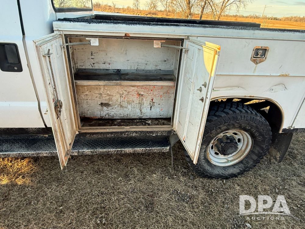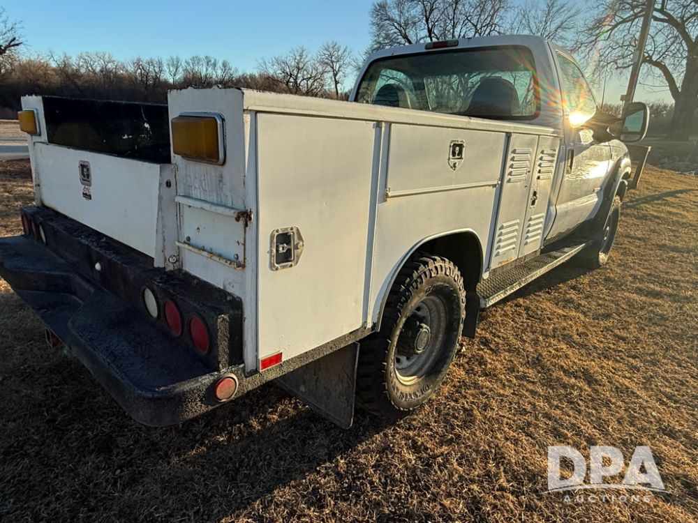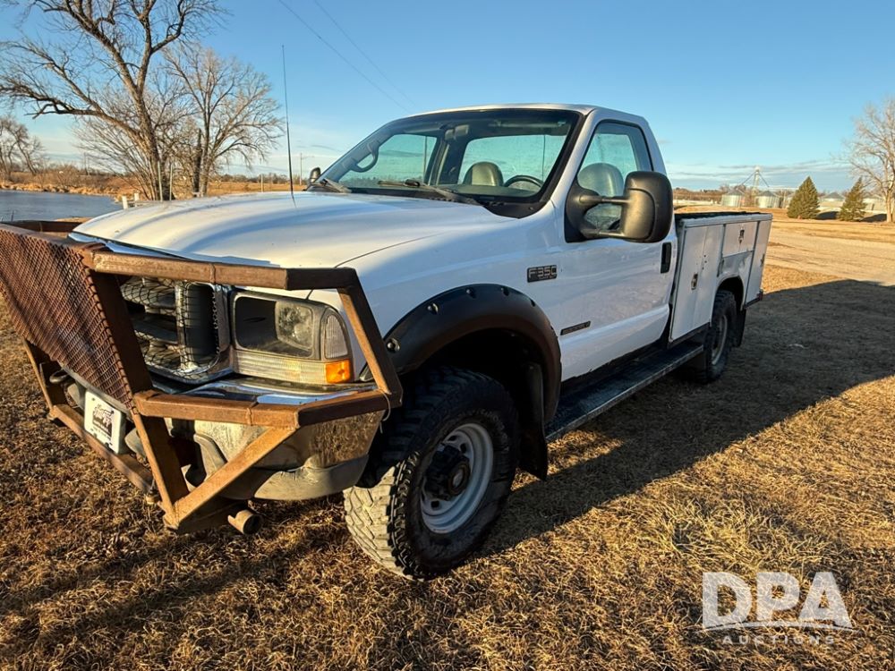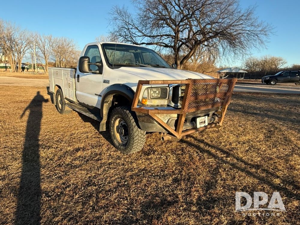 2002 Ford F350 Super Duty Service Truck (LLD1621), 7.3L diesel engine, automatic transmission, 4WD, heat, air conditioning, radio, grill guard, tow hitch, shows 258,854 miles.