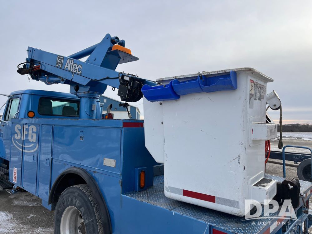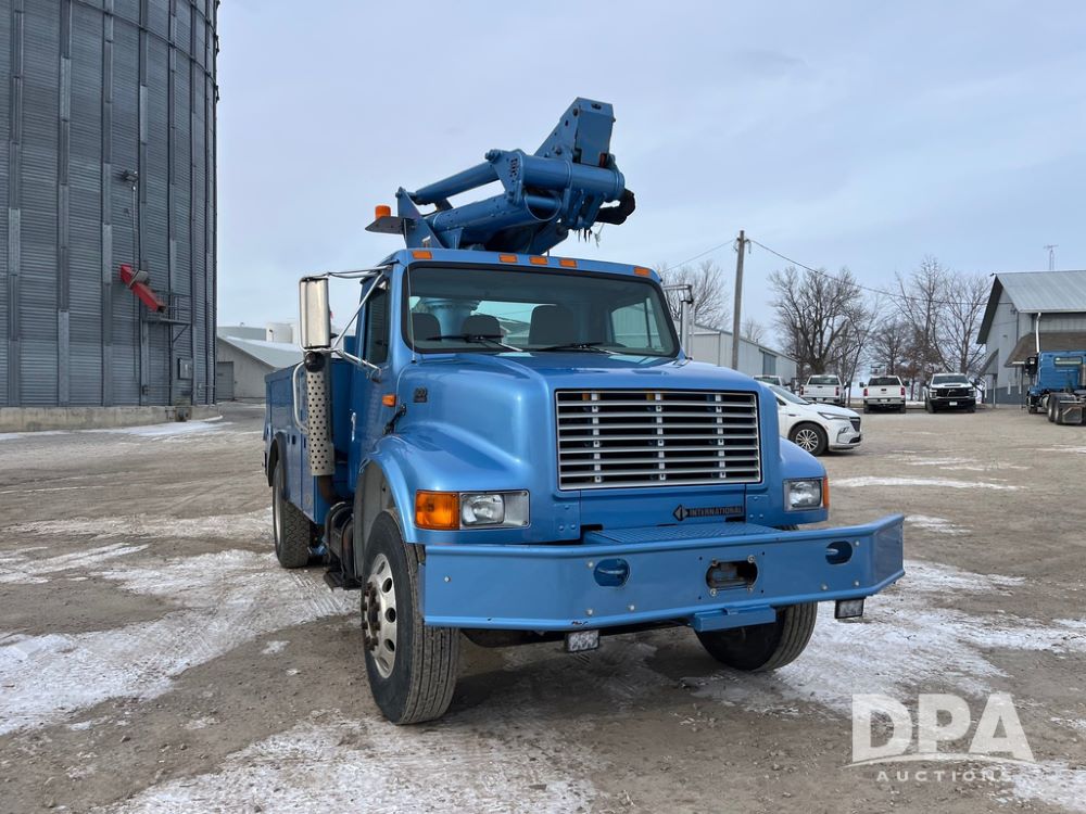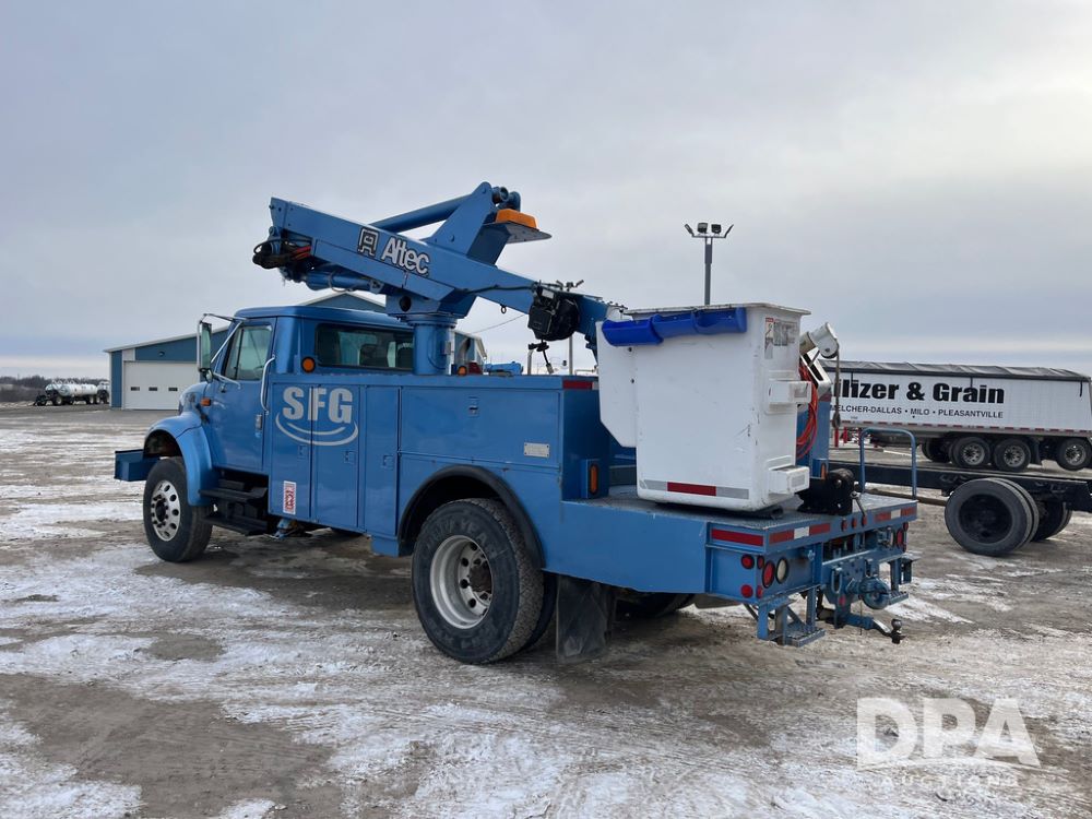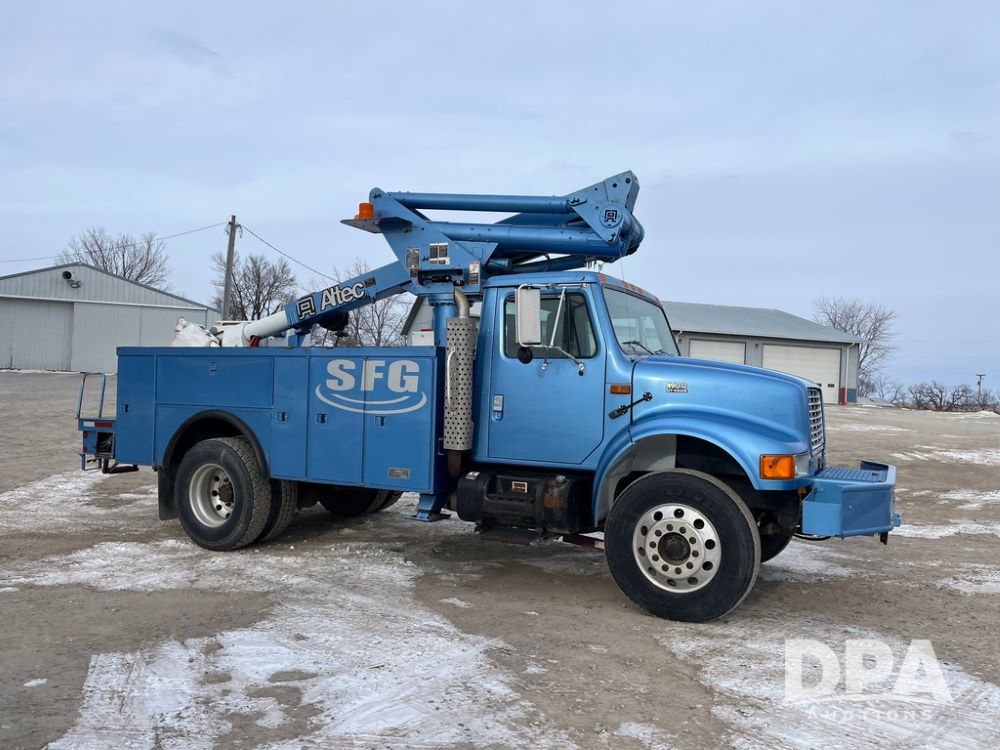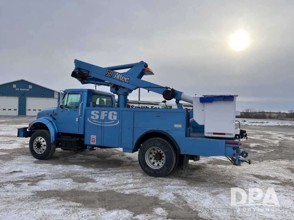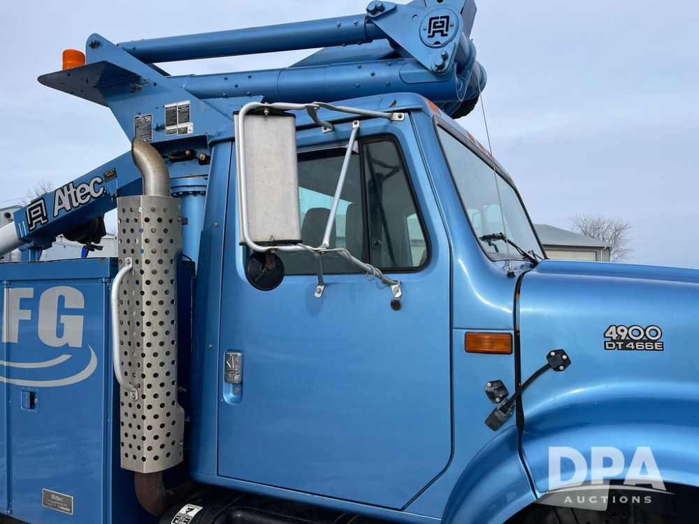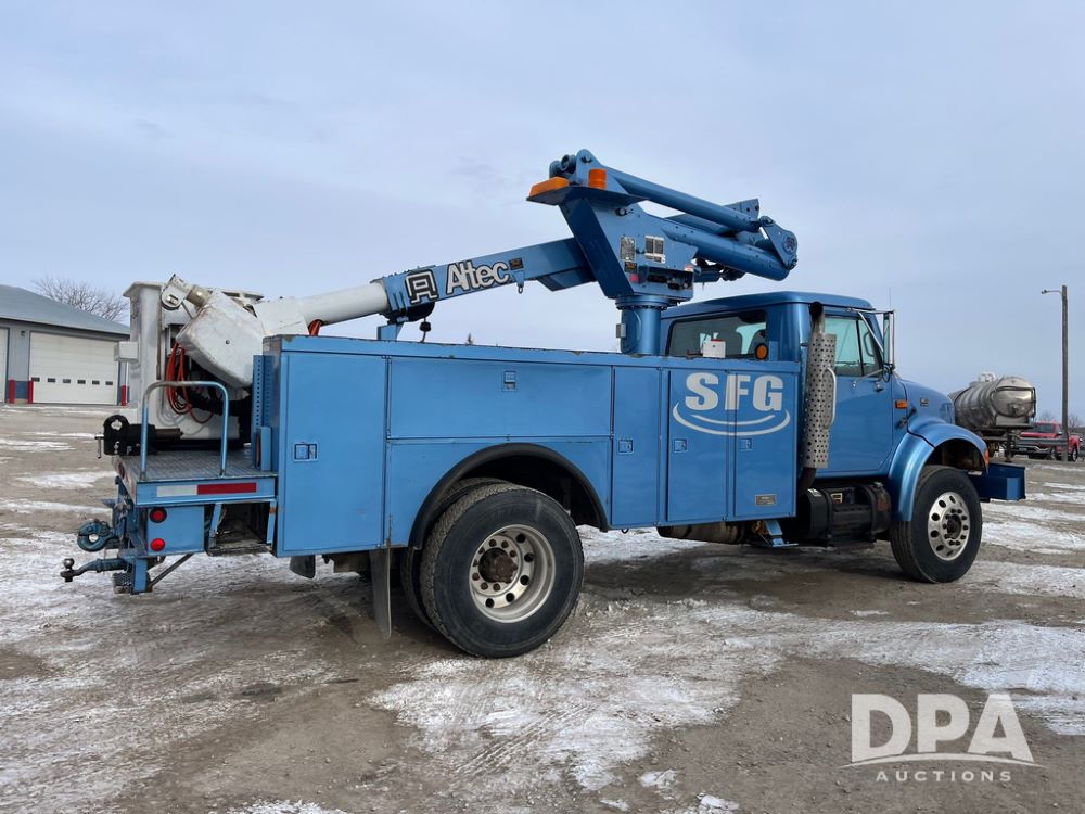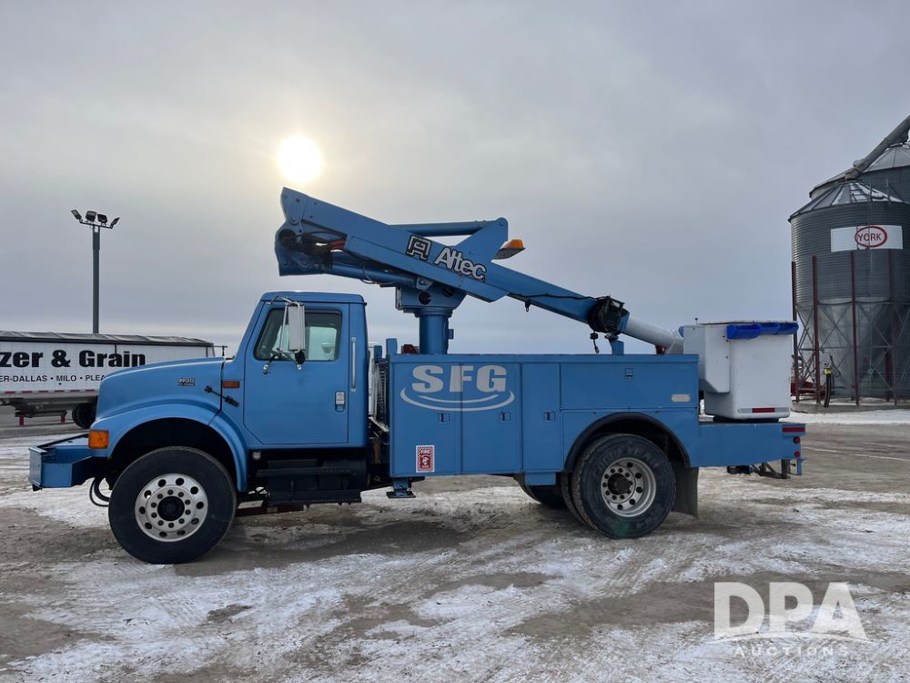 1998 IHC 4900 Bucket Truck (JN3723), DT466E diesel engine, Allison automatic transmission, air conditioning, heat, Am/Fm radio, cruise control, tandem axle, spring suspension, 1998 Altec Service body with bucket (S/N 37-66692), down riggers, pintal hitch, 11R22.5 tires, aluminum rims, shows 243,855 miles.