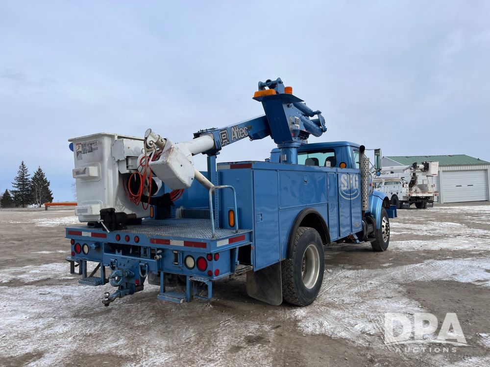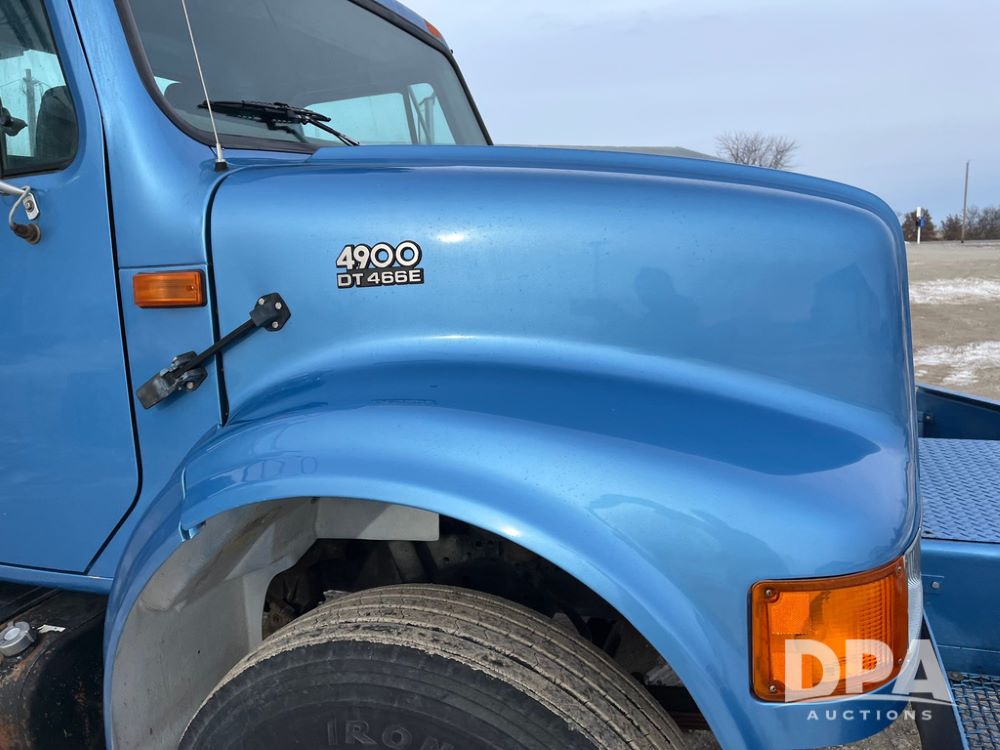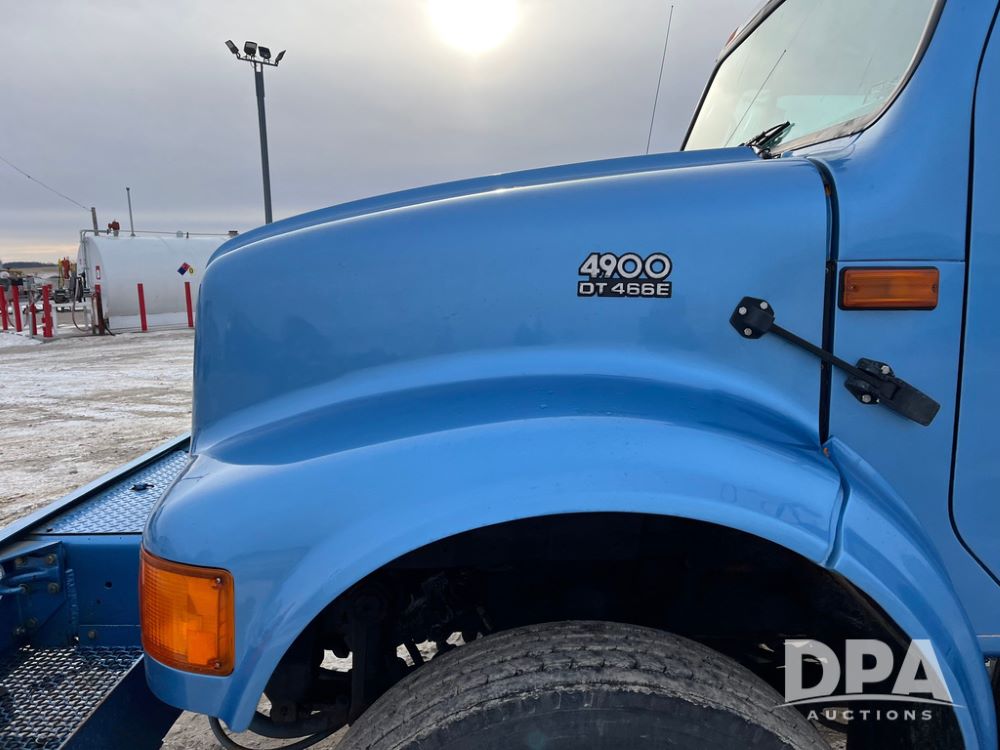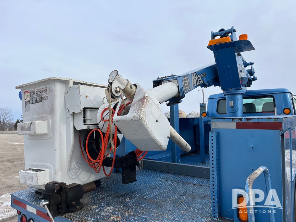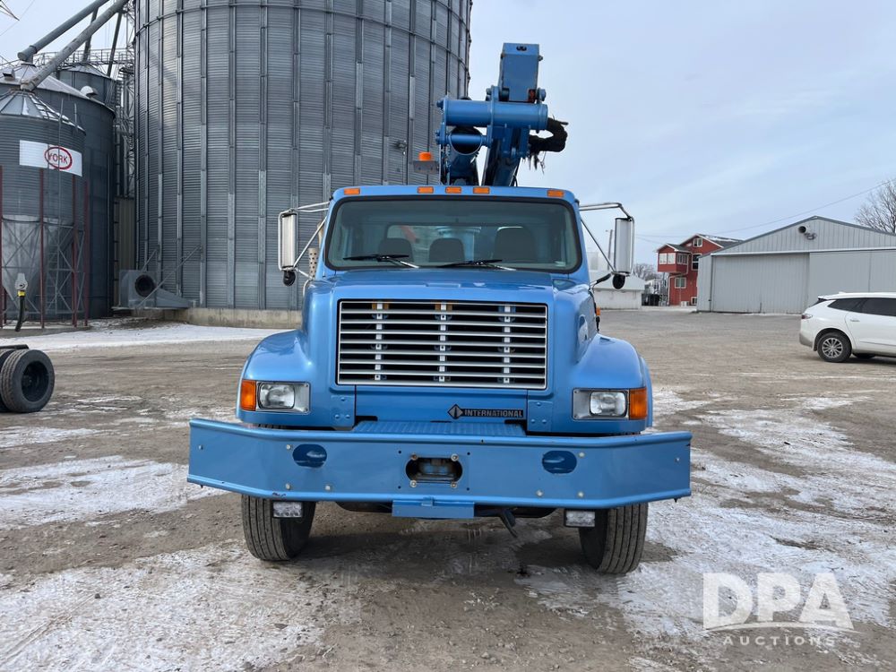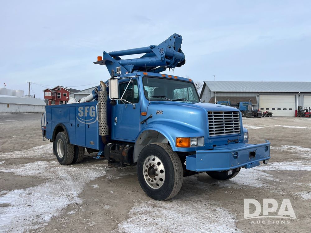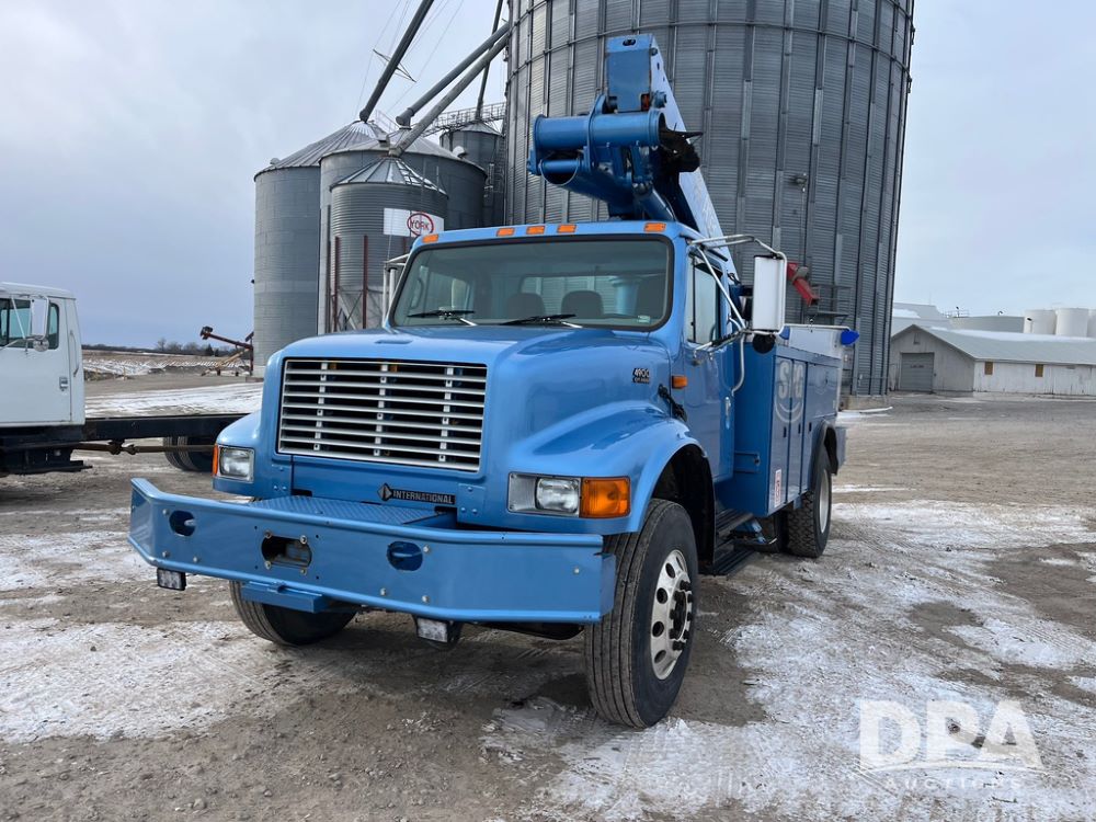 1998 IHC 4900 Bucket Truck (JN3723), DT466E diesel engine, Allison automatic transmission, air conditioning, heat, Am/Fm radio, cruise control, tandem axle, spring suspension, 1998 Altec Service body with bucket (S/N 37-66692), down riggers, pintal hitch, 11R22.5 tires, aluminum rims, shows 243,855 miles.