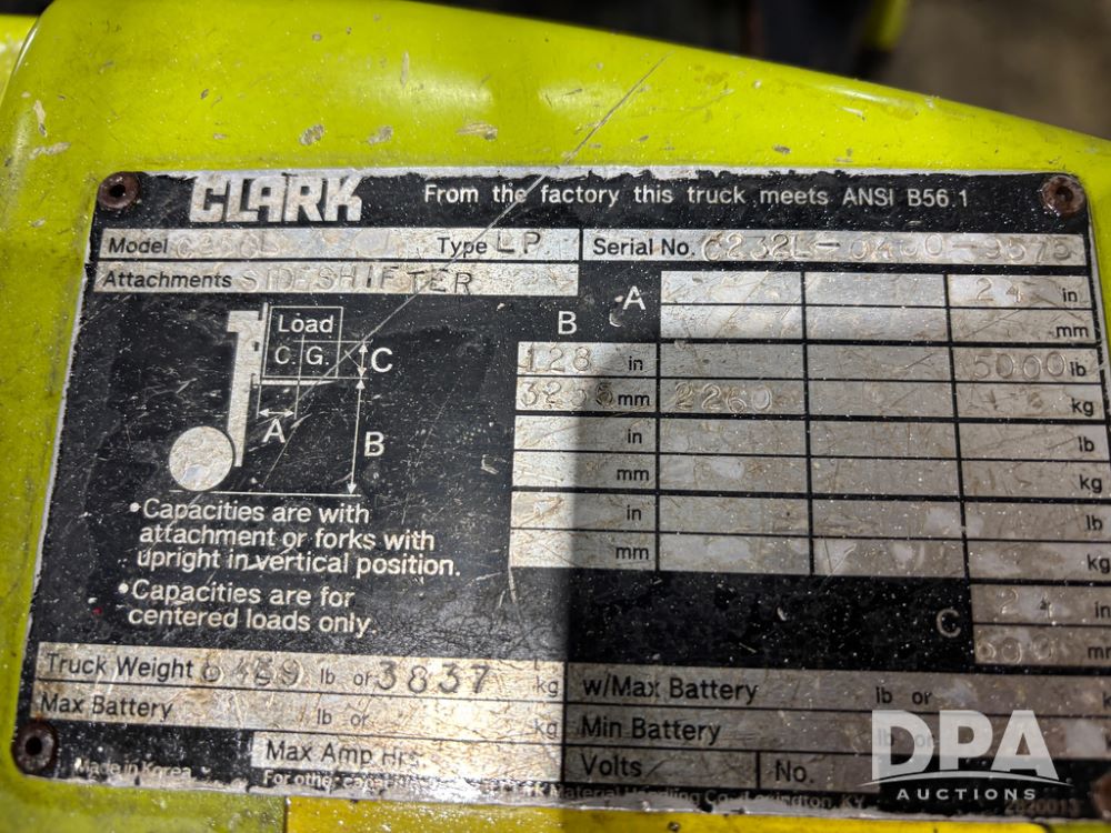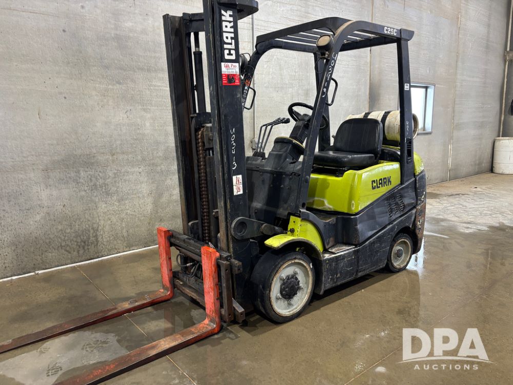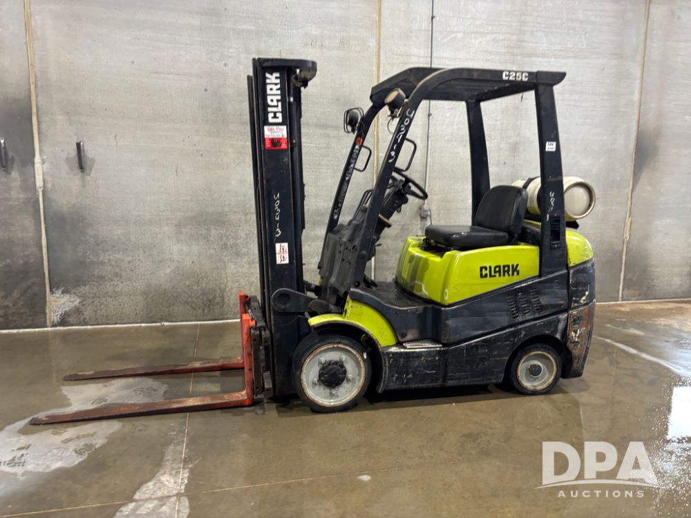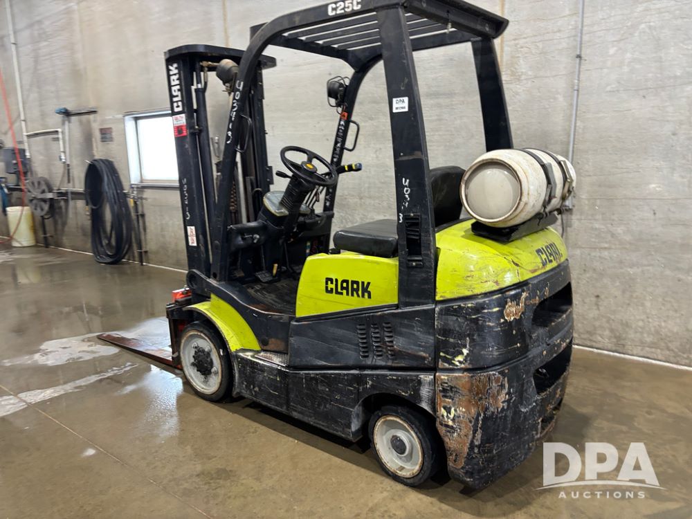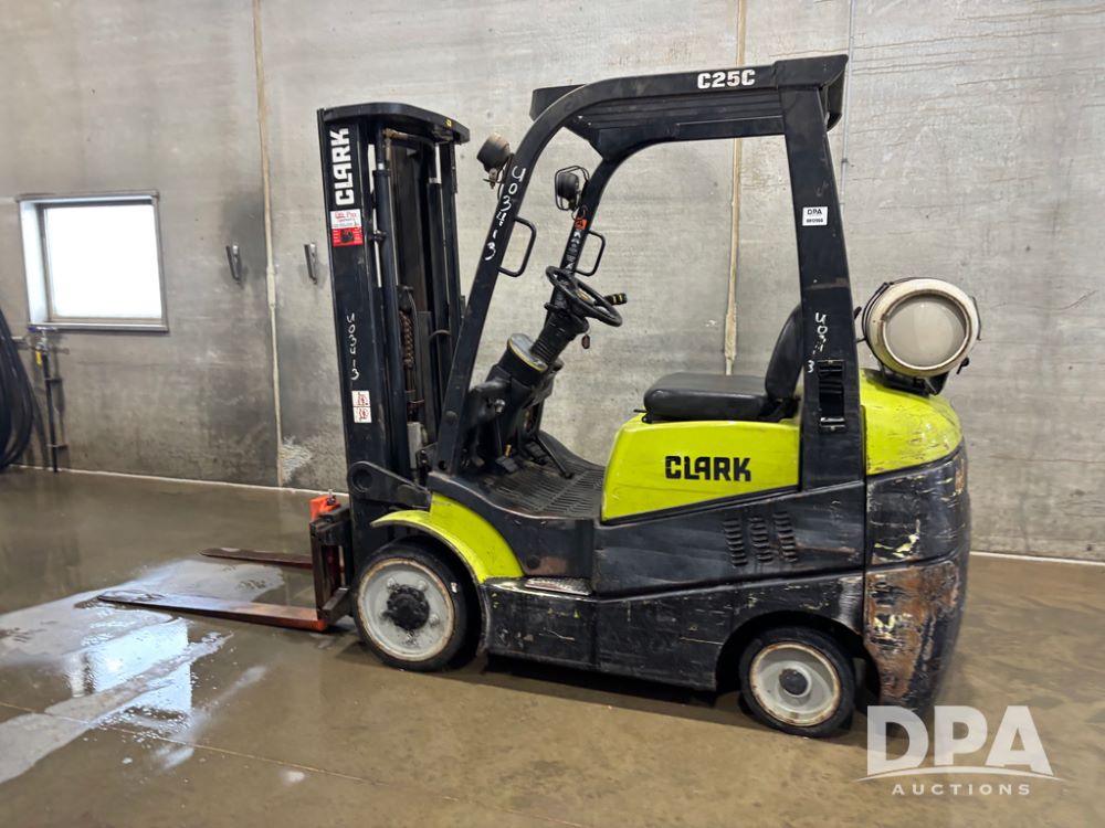 Clark C25GL Forklift (DR12966), LP gas engine, 2 stage mast, 5,000lb capacity, hydraulic side shift, solid tires, shows 8026 hours.