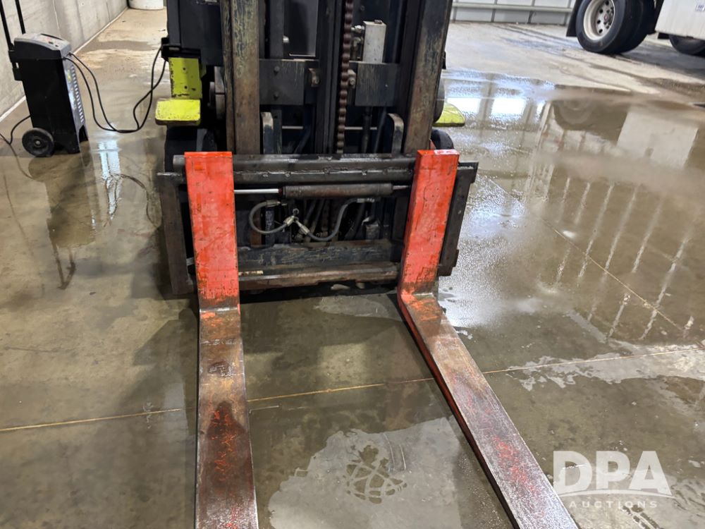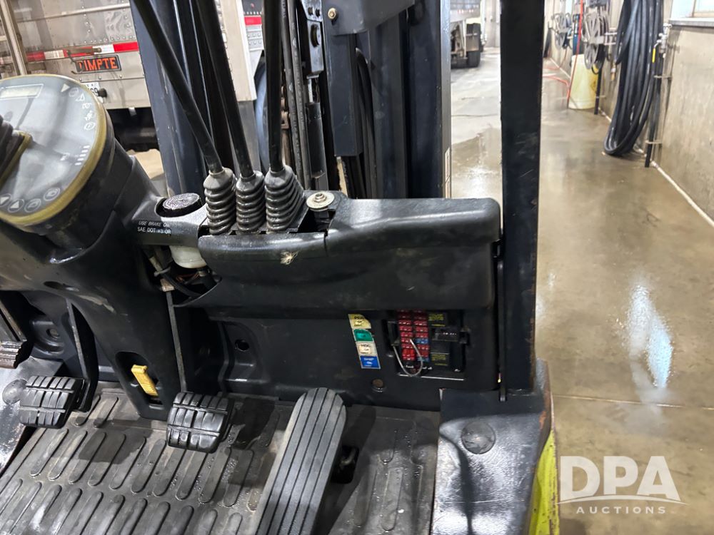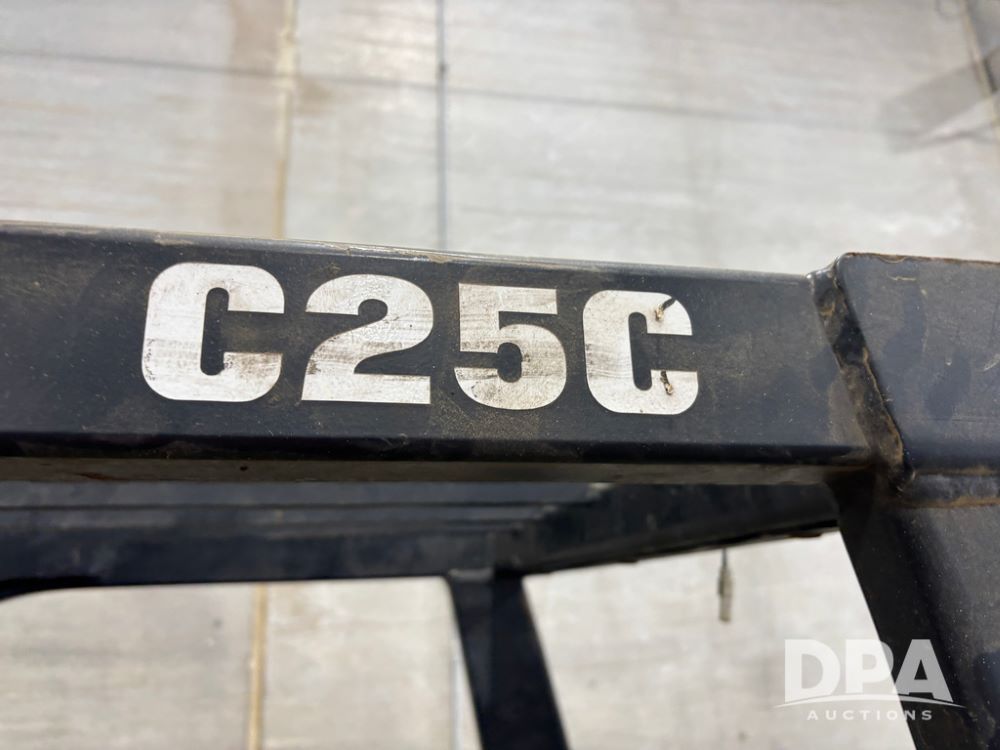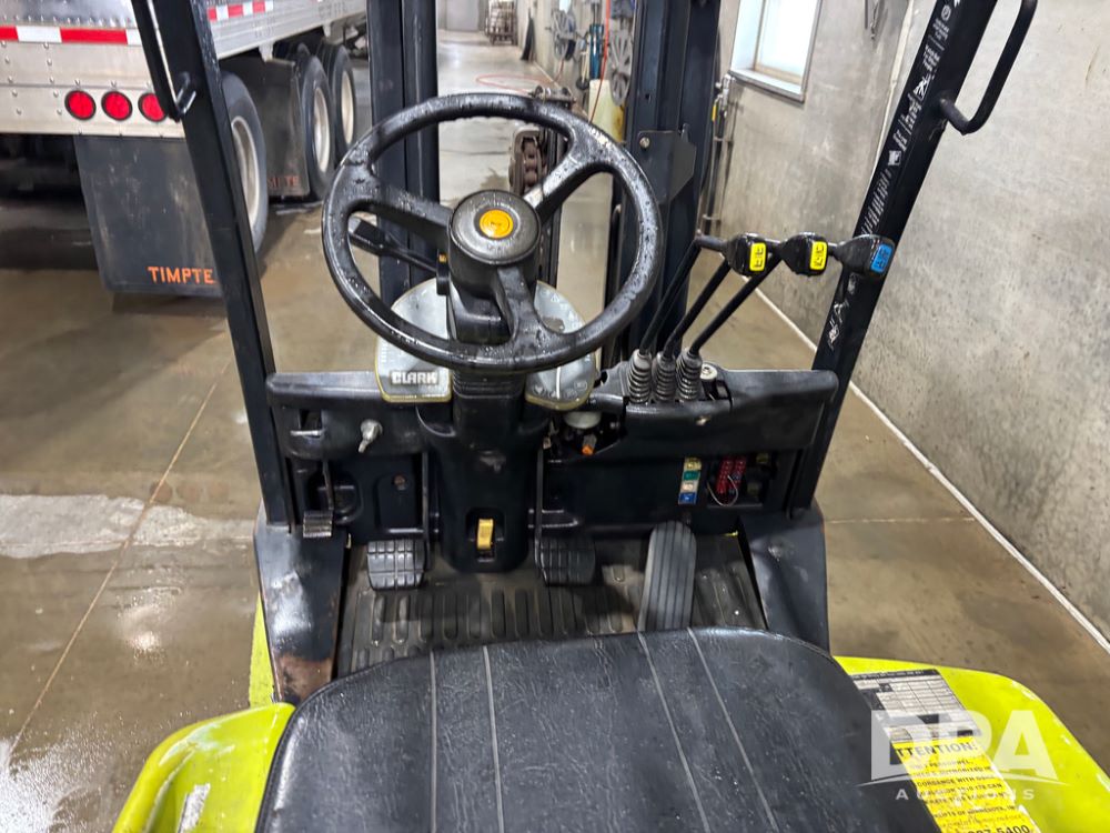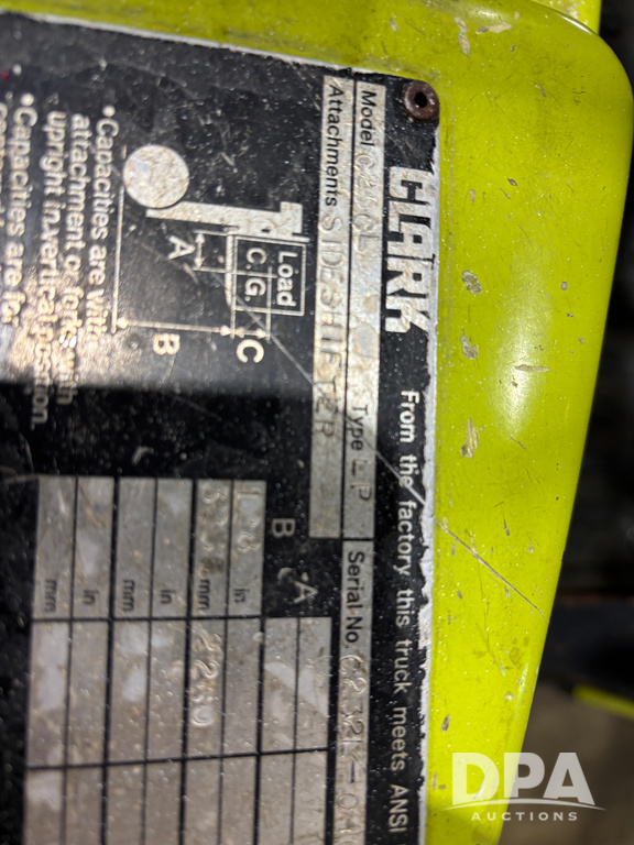 Clark C25GL Forklift (DR12966), LP gas engine, 2 stage mast, 5,000lb capacity, hydraulic side shift, solid tires, shows 8026 hours.