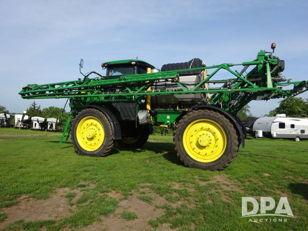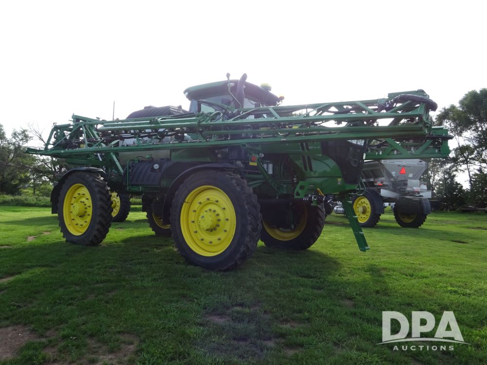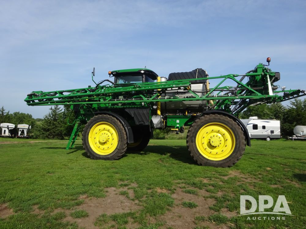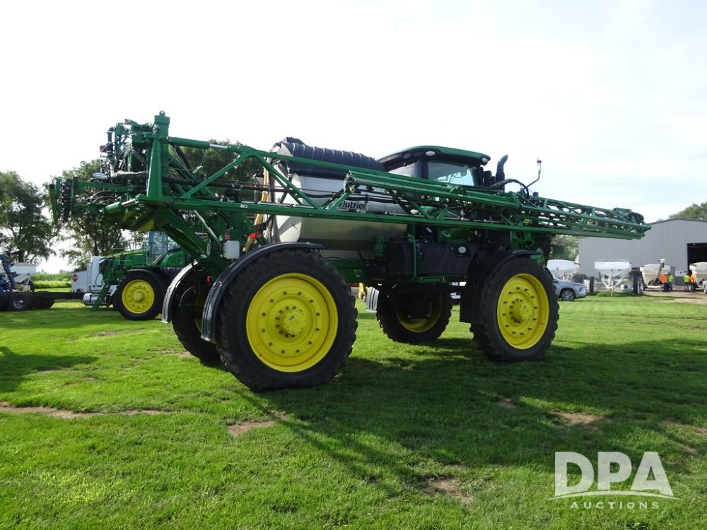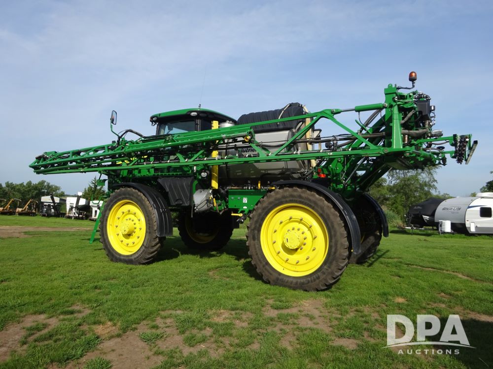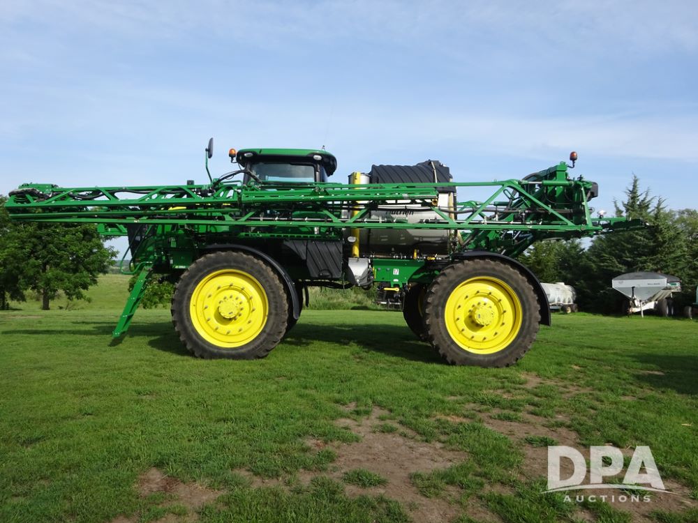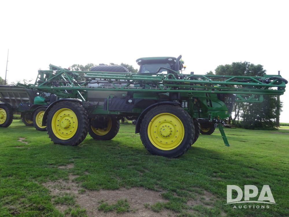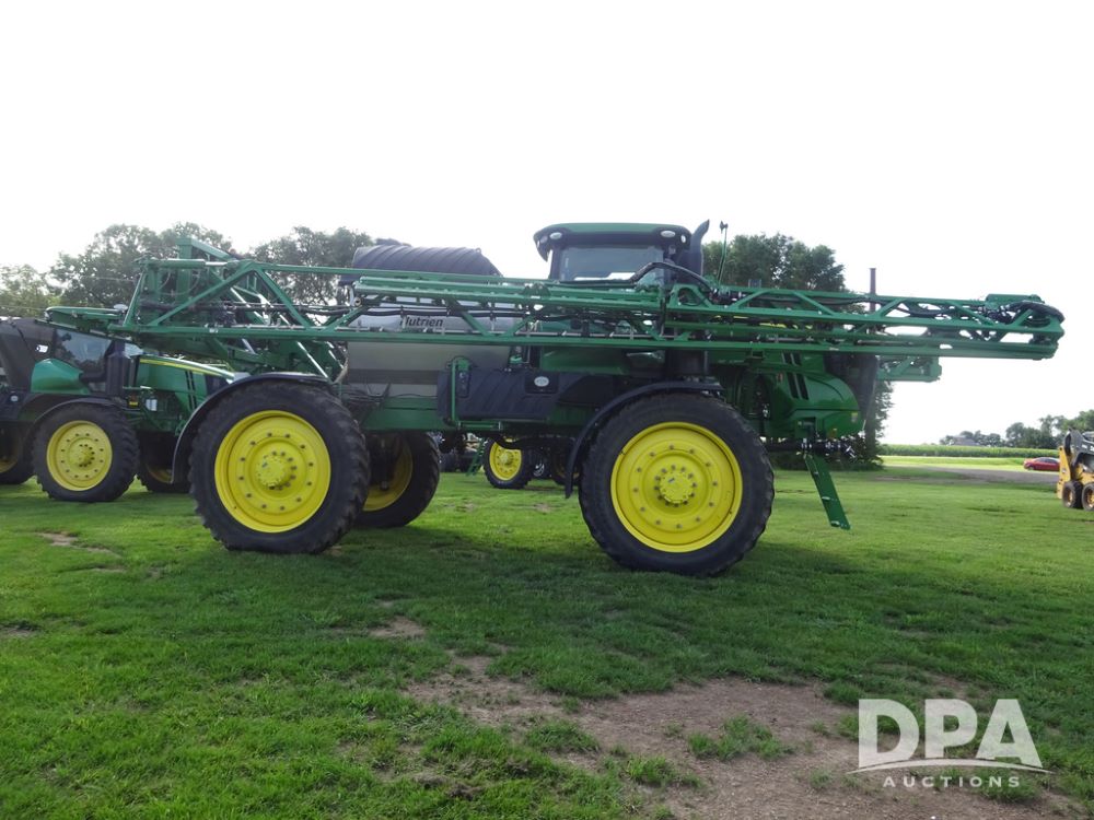 2018 John Deere R4045 Sprayer (PZ13716 Unit 106354), John Deere diesel engine, hydrostatic drive, 1200 gallon stainless steel liquid system, 120' boom, stainless steel chemical inductor, saddle mounted poly rinse tank, auto height adjust sensors, front and side load, StarFire 6000 globe, Green Star 3 display, buddy seat, cab heat/air conditioning, Michelin 420/95R50 row crop tires, full set fenders, shows 1,737 hours.