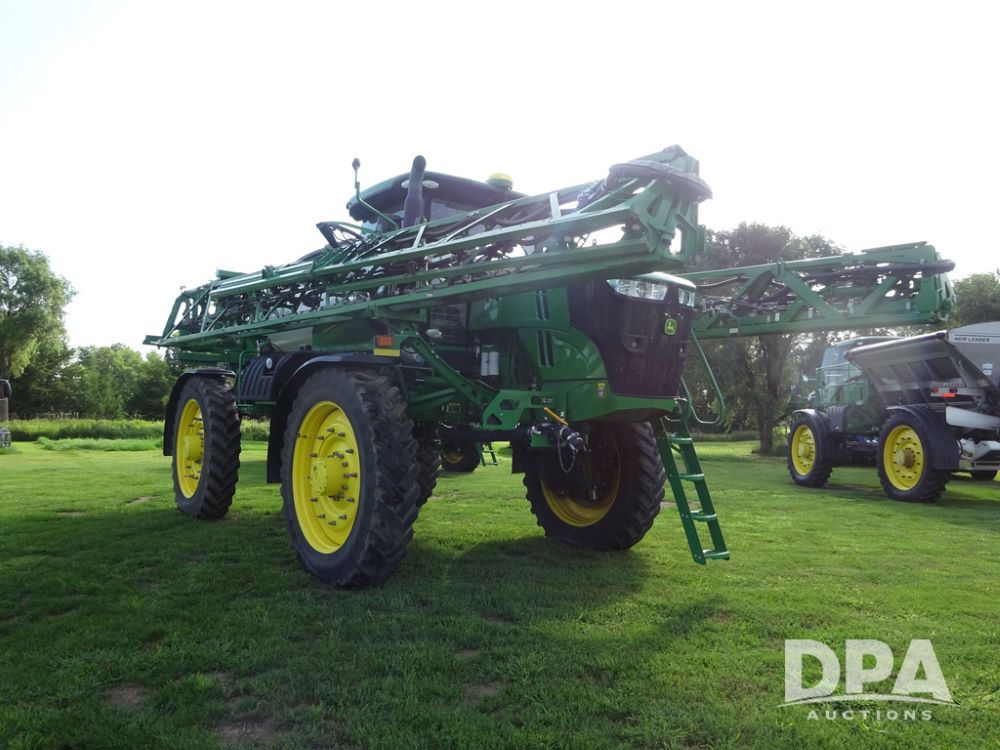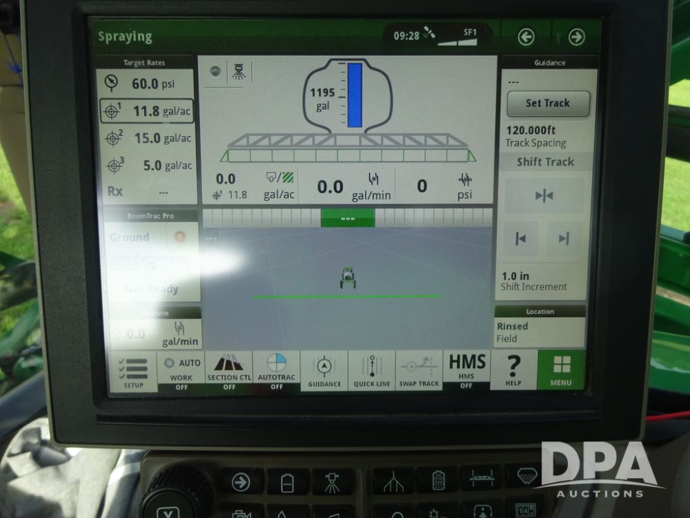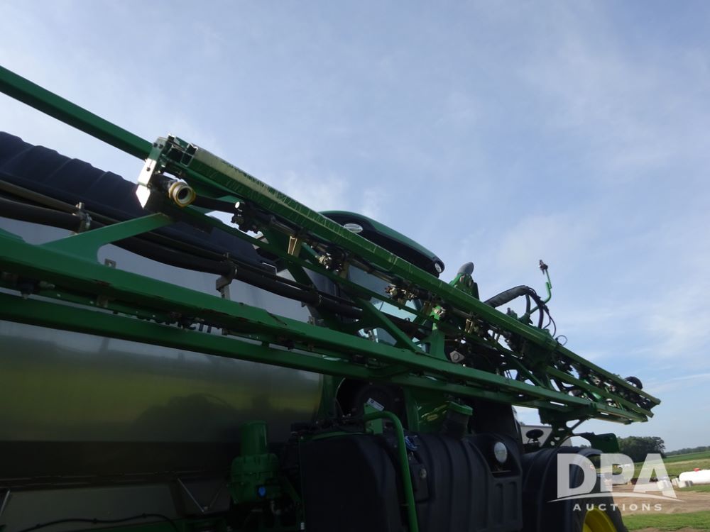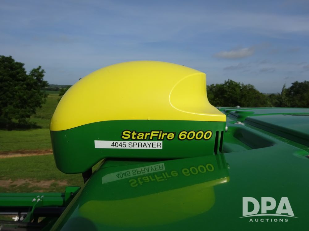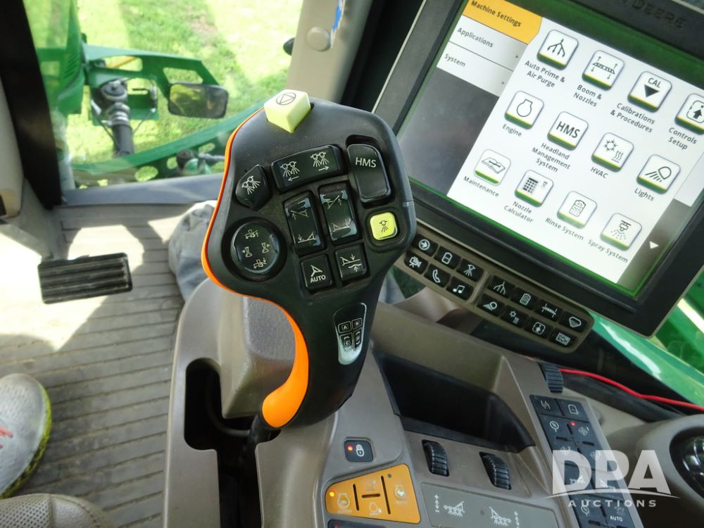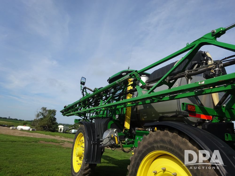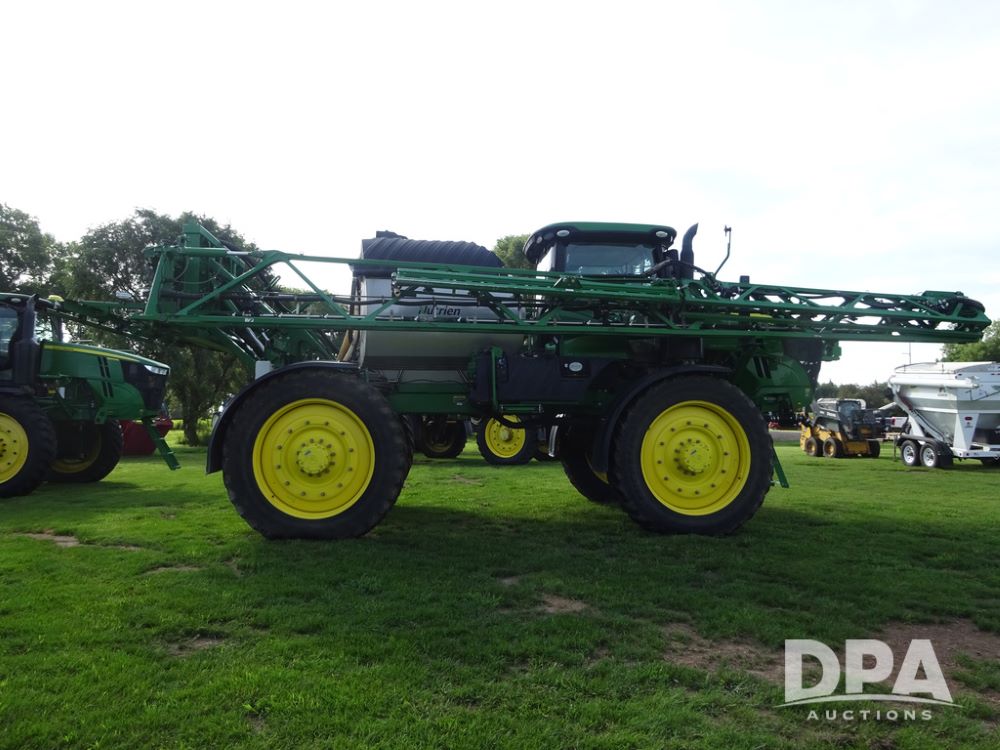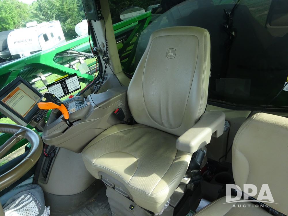 2018 John Deere R4045 Sprayer (PZ13716 Unit 106354), John Deere diesel engine, hydrostatic drive, 1200 gallon stainless steel liquid system, 120' boom, stainless steel chemical inductor, saddle mounted poly rinse tank, auto height adjust sensors, front and side load, StarFire 6000 globe, Green Star 3 display, buddy seat, cab heat/air conditioning, Michelin 420/95R50 row crop tires, full set fenders, shows 1,737 hours.