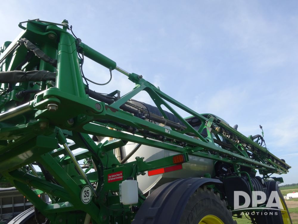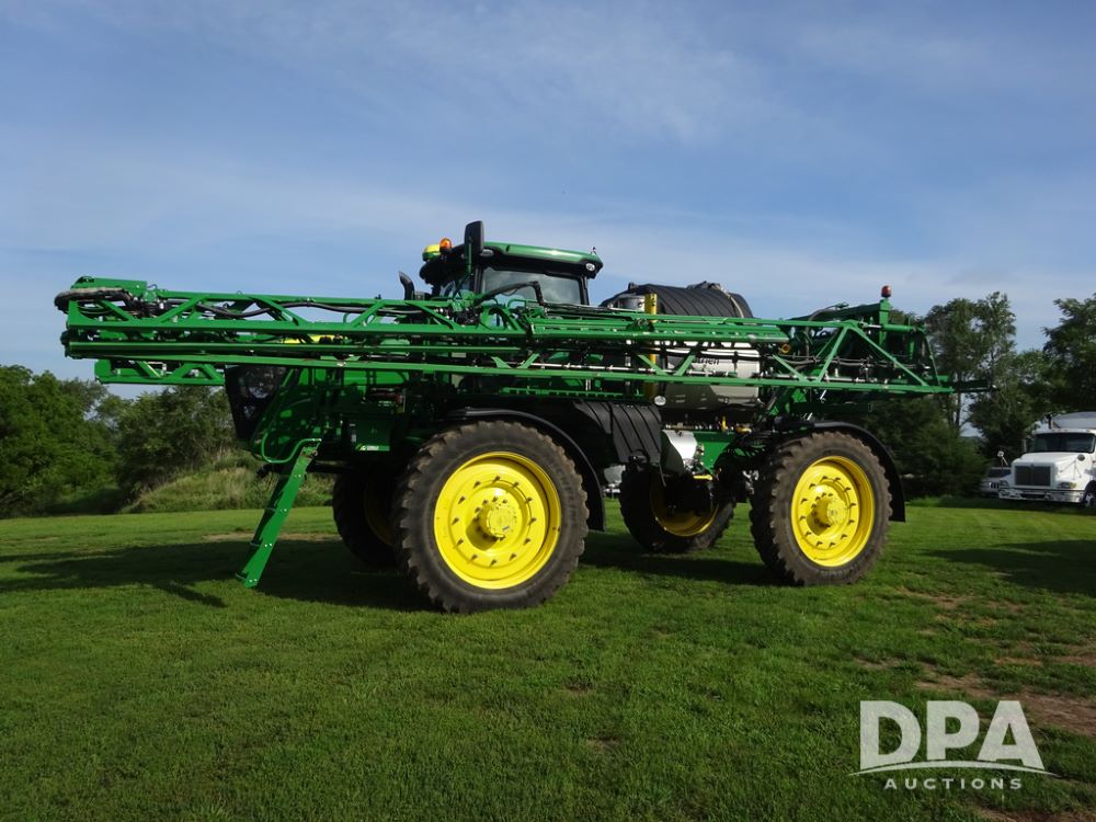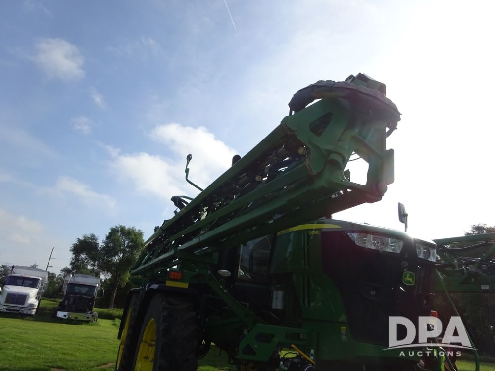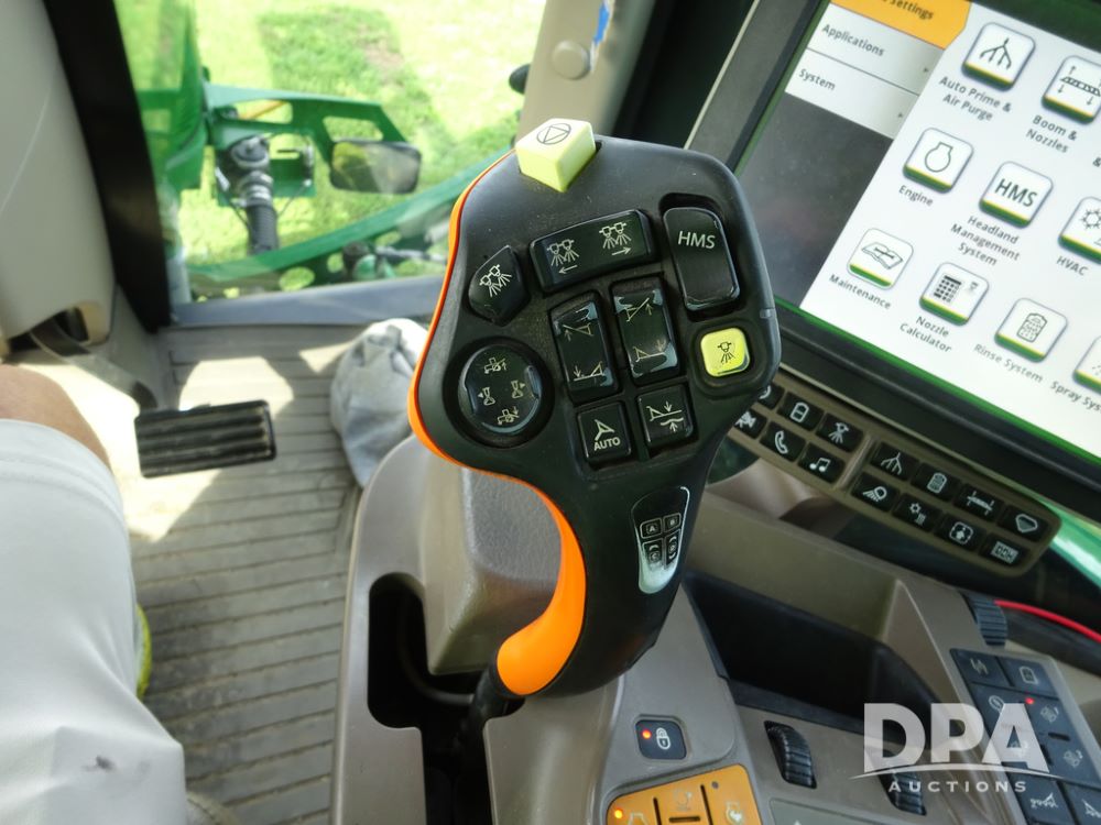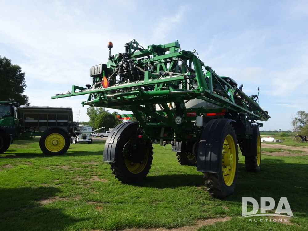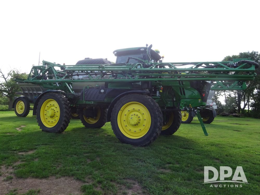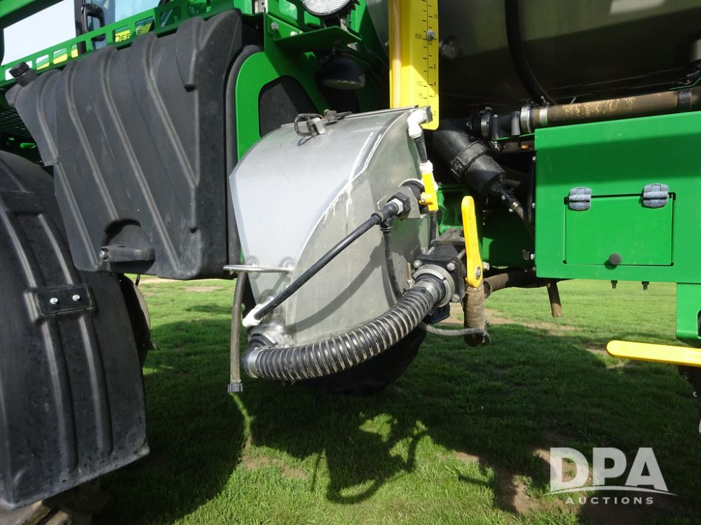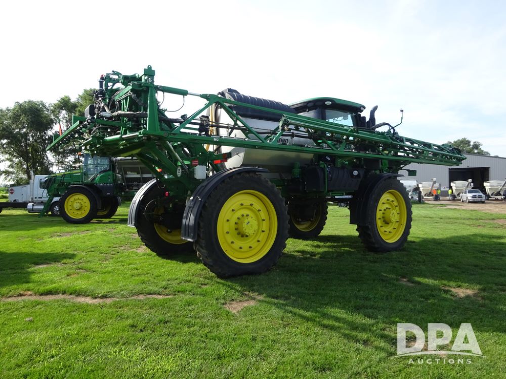 2018 John Deere R4045 Sprayer (PZ13716 Unit 106354), John Deere diesel engine, hydrostatic drive, 1200 gallon stainless steel liquid system, 120' boom, stainless steel chemical inductor, saddle mounted poly rinse tank, auto height adjust sensors, front and side load, StarFire 6000 globe, Green Star 3 display, buddy seat, cab heat/air conditioning, Michelin 420/95R50 row crop tires, full set fenders, shows 1,737 hours.